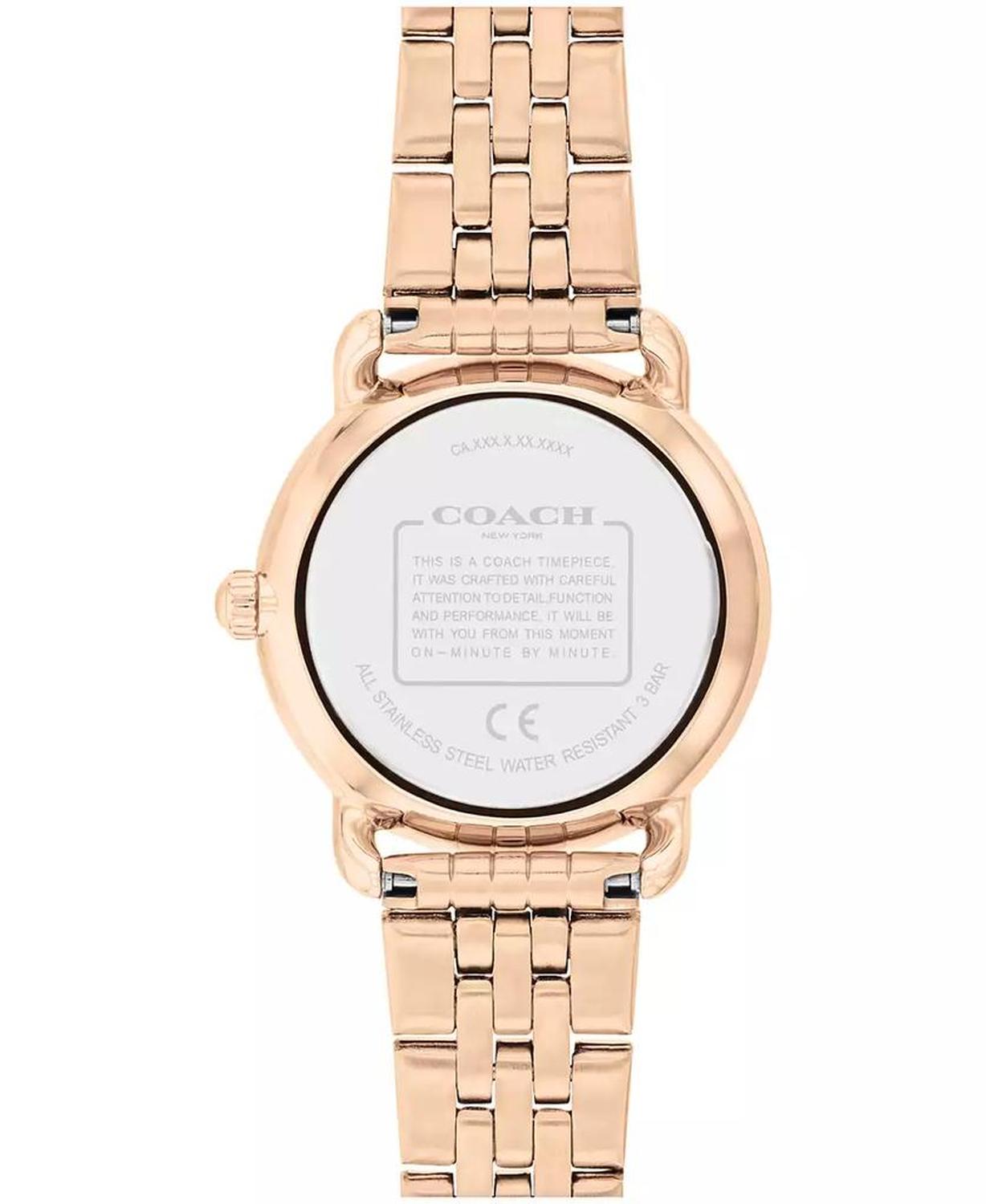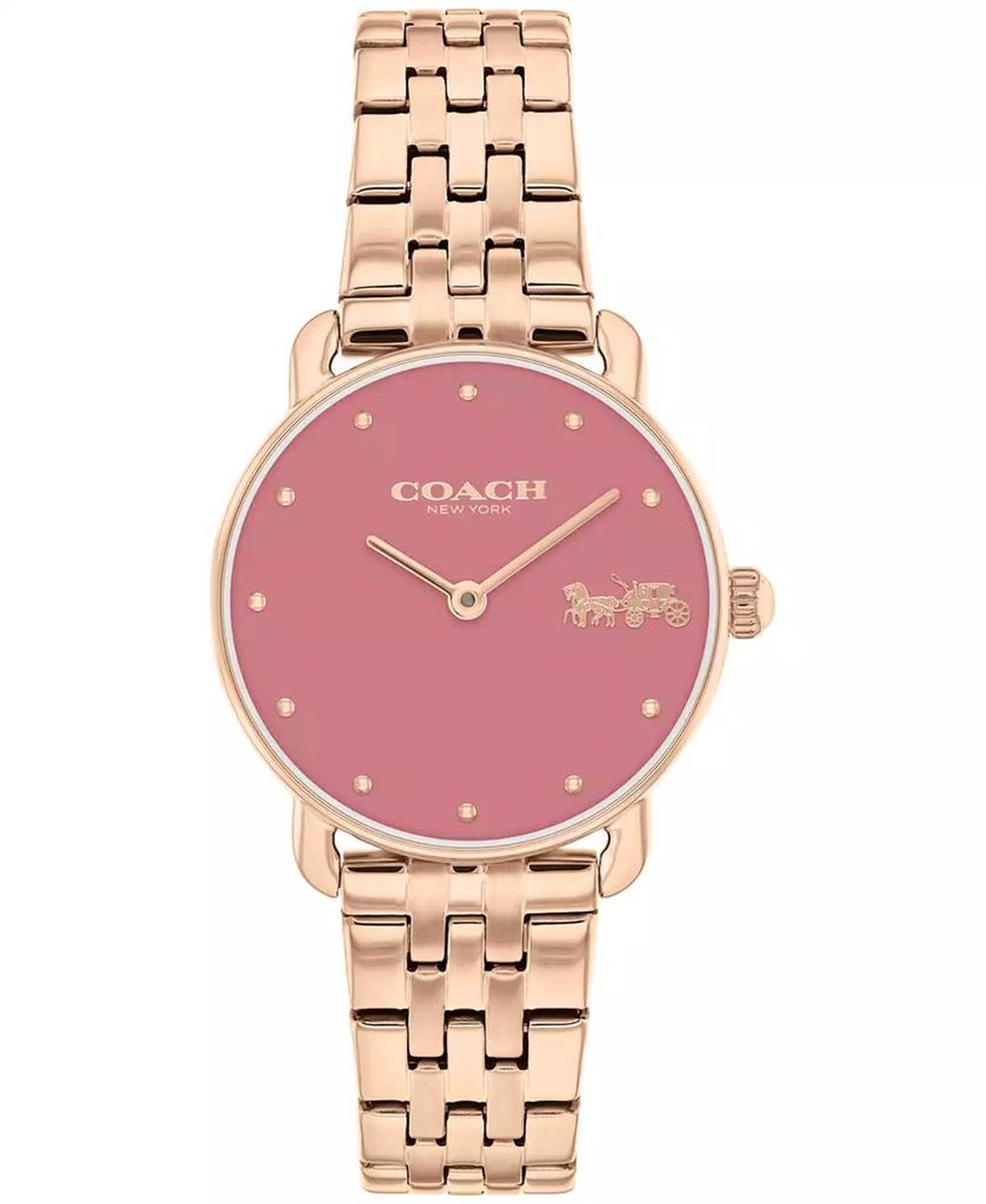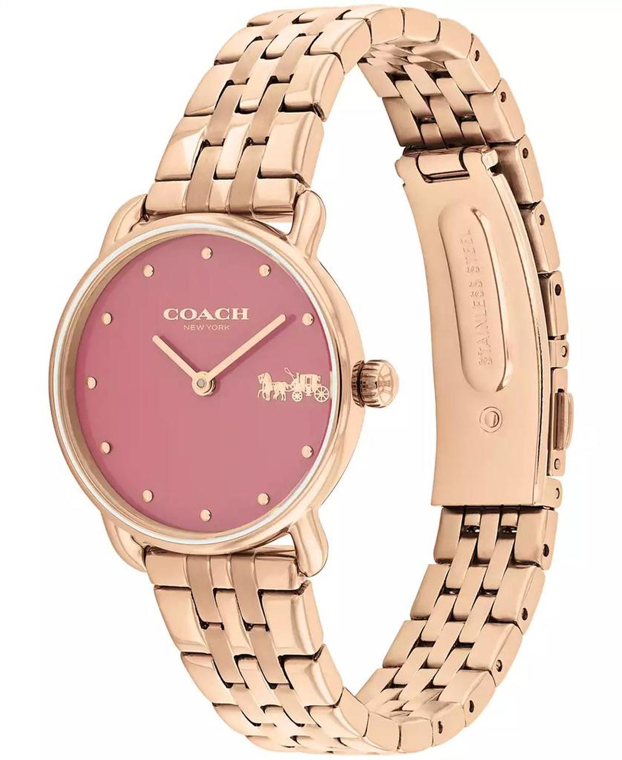 • With clean lines and a modern minimalist sensibility, the Elliot is a true design classic ready for workdays and weekends. This rose gold tone bracelet watch features a pink dial detailed with dome markers and the iconic Coach Horse and Carriage motif at 3 o’clock for a heritage touch. SKU 14504444