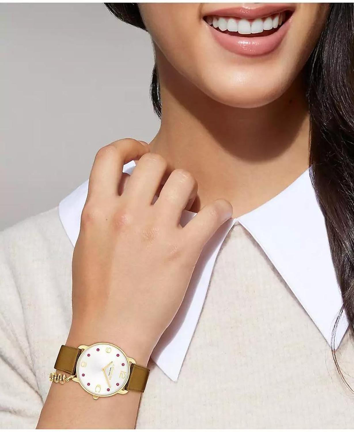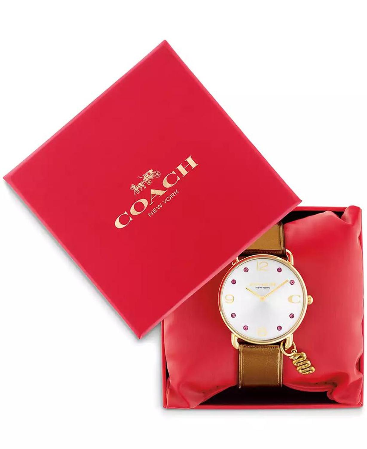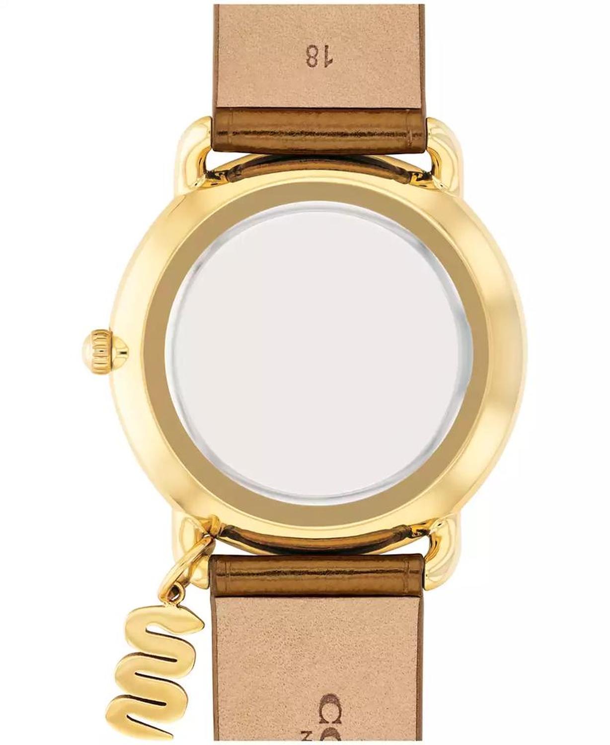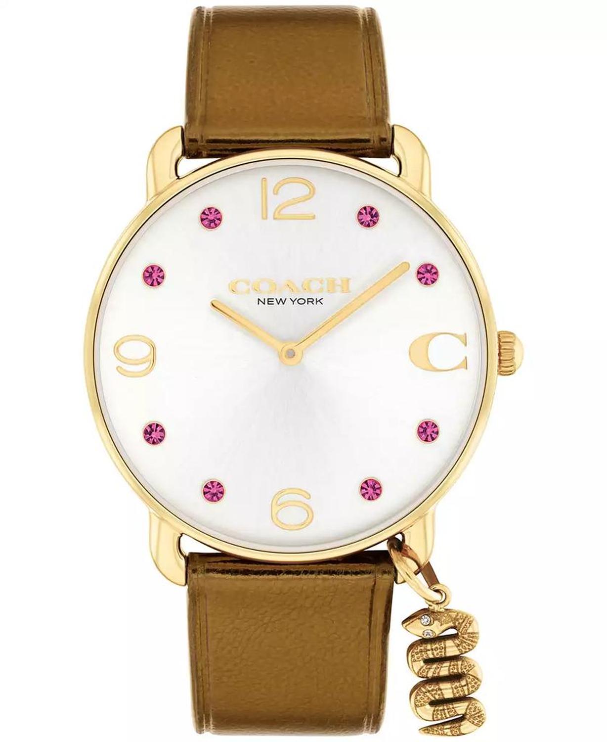 • With clean lines and a modern minimalist sensibility, the Elliot is a true design classic ready for workdays and weekends. Celebrate 2025 Year of the Snake with Coach’s special New Year watch. Finished with a gold metallic leather strap and a polished coiled snake charm, the gold tone round timepiece features a silver white sunray dial detailed with a mix of numerical and pink crystal markers. SKU 14504449