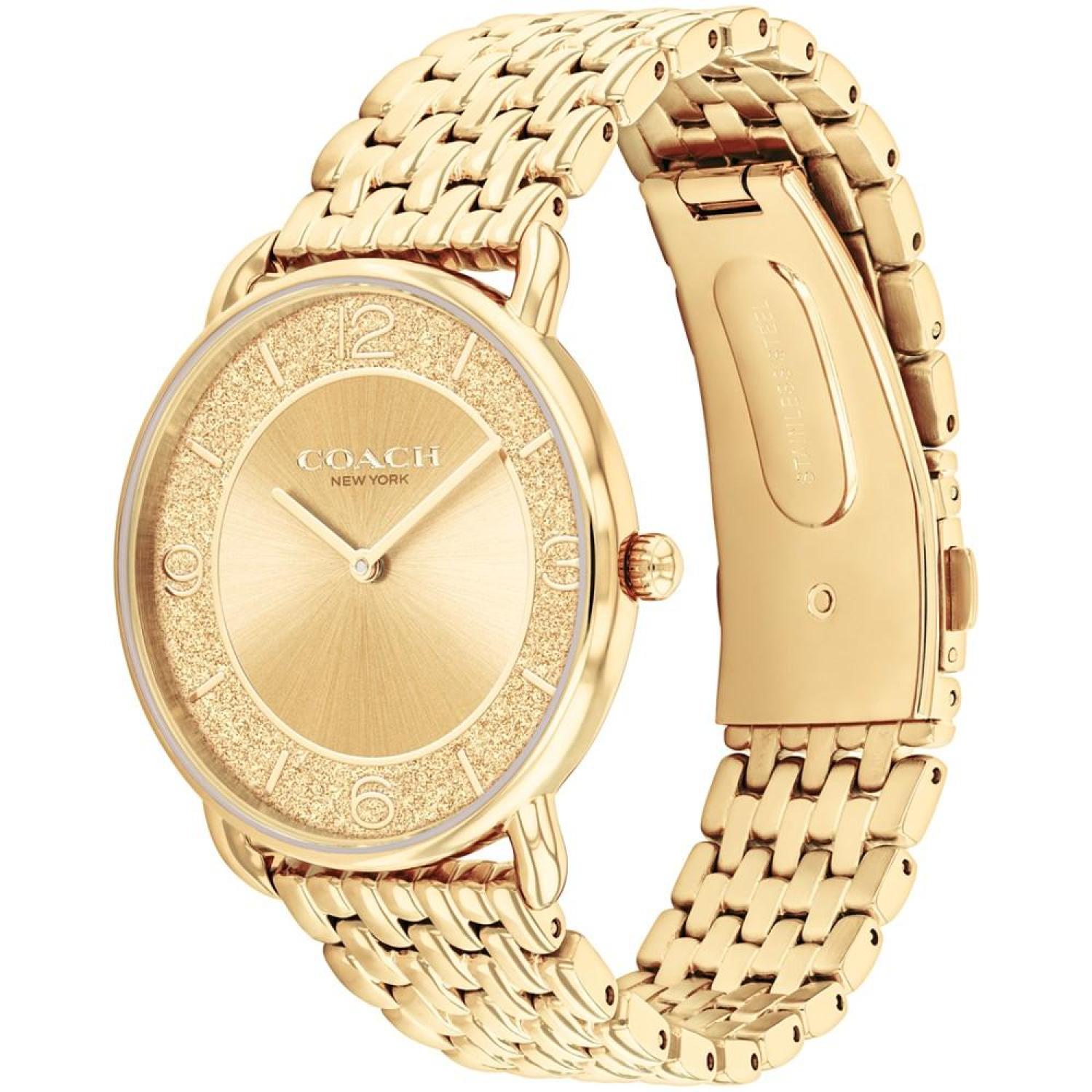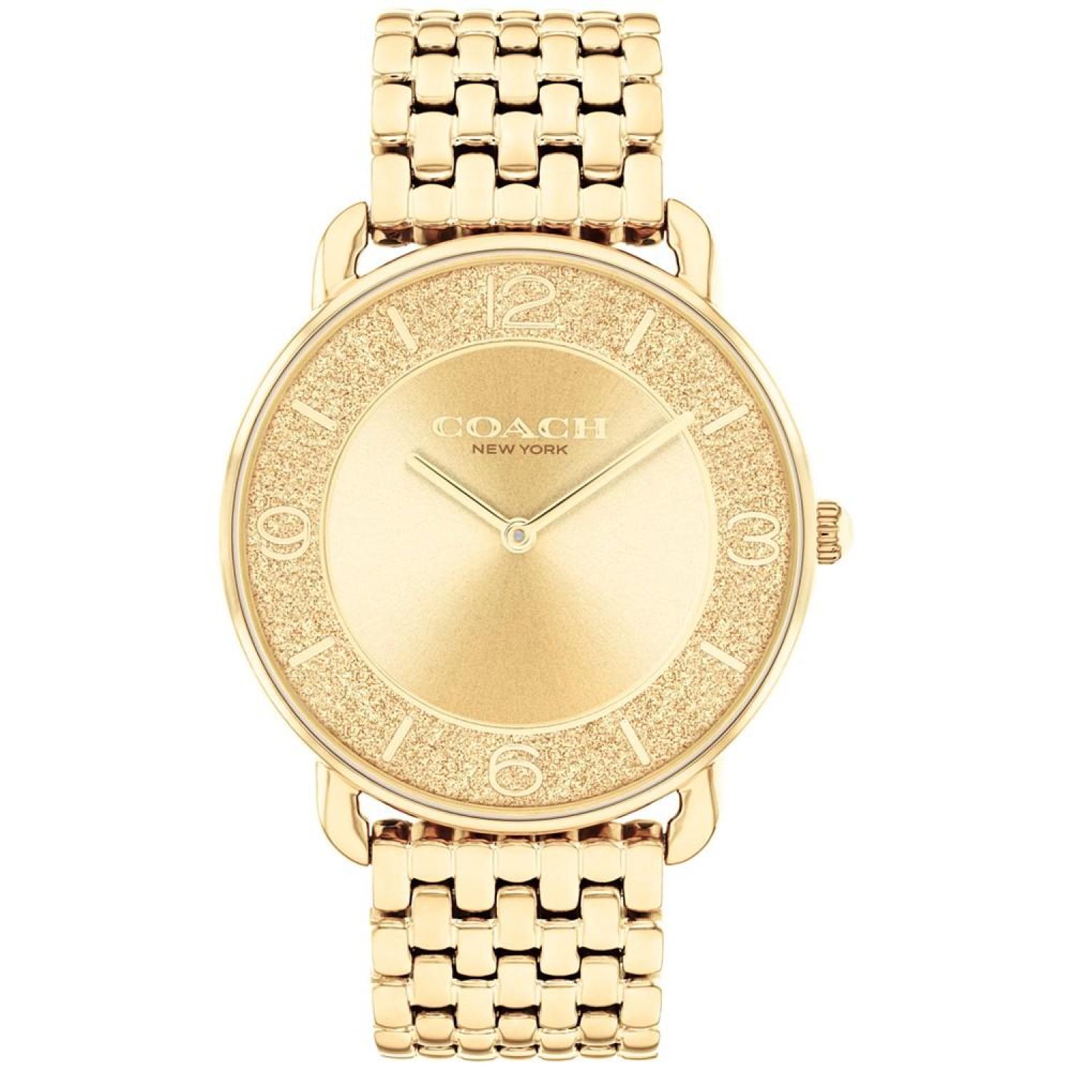 • With clean lines and a modern minimalist sensibility, the Elliot is a true design classic ready for workdays and weekends. This gold tone round bracelet watch features a gold dial detailed with a mix of numerical and stick makers on a glittery diamond-dusted track for a touch of shimmer. Style 14504374