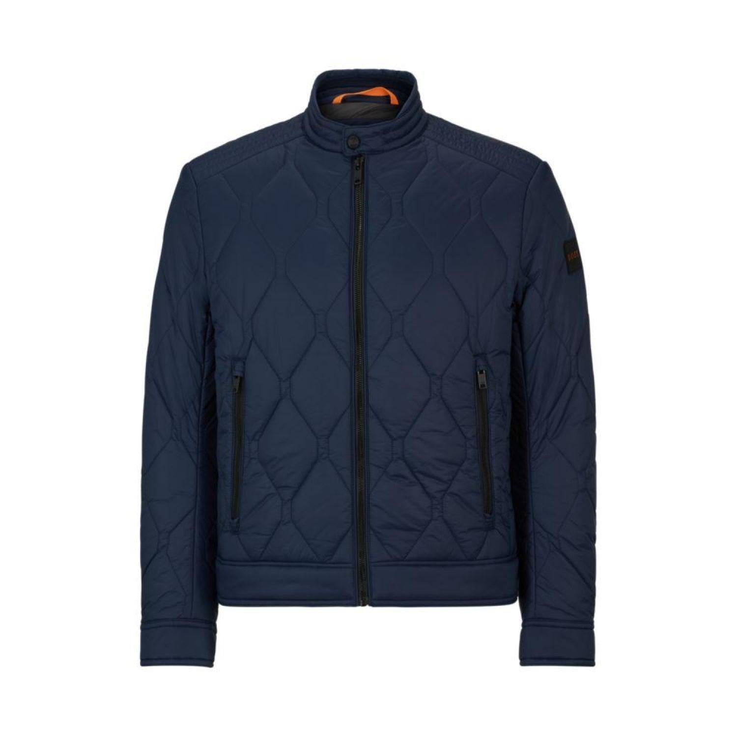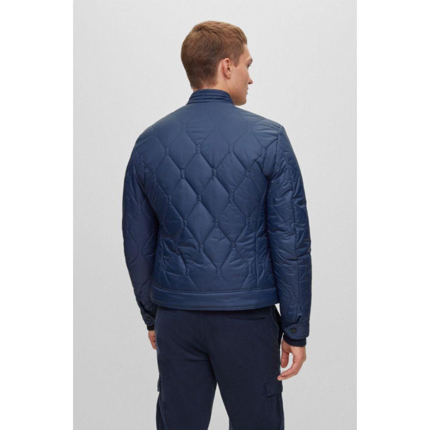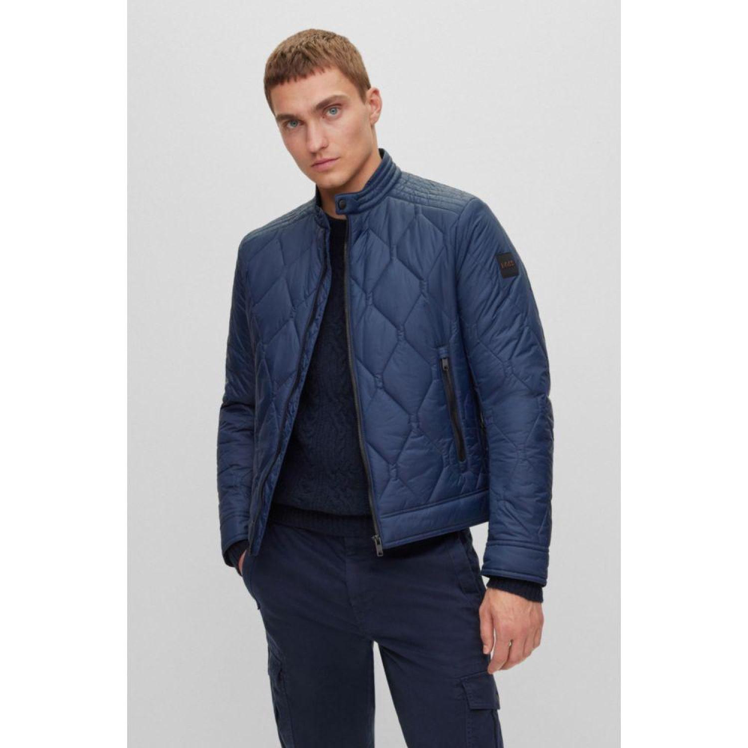 • A logo-trim biker jacket by BOSS Menswear, crafted in quilted water-repellent fabric with lightweight padding.