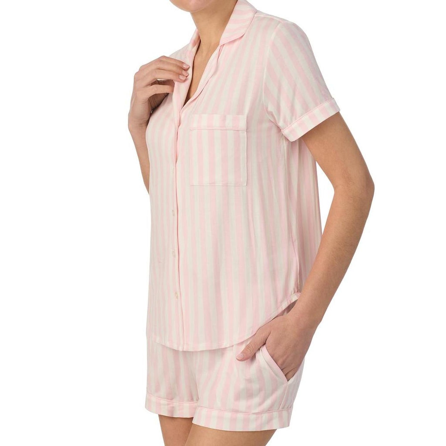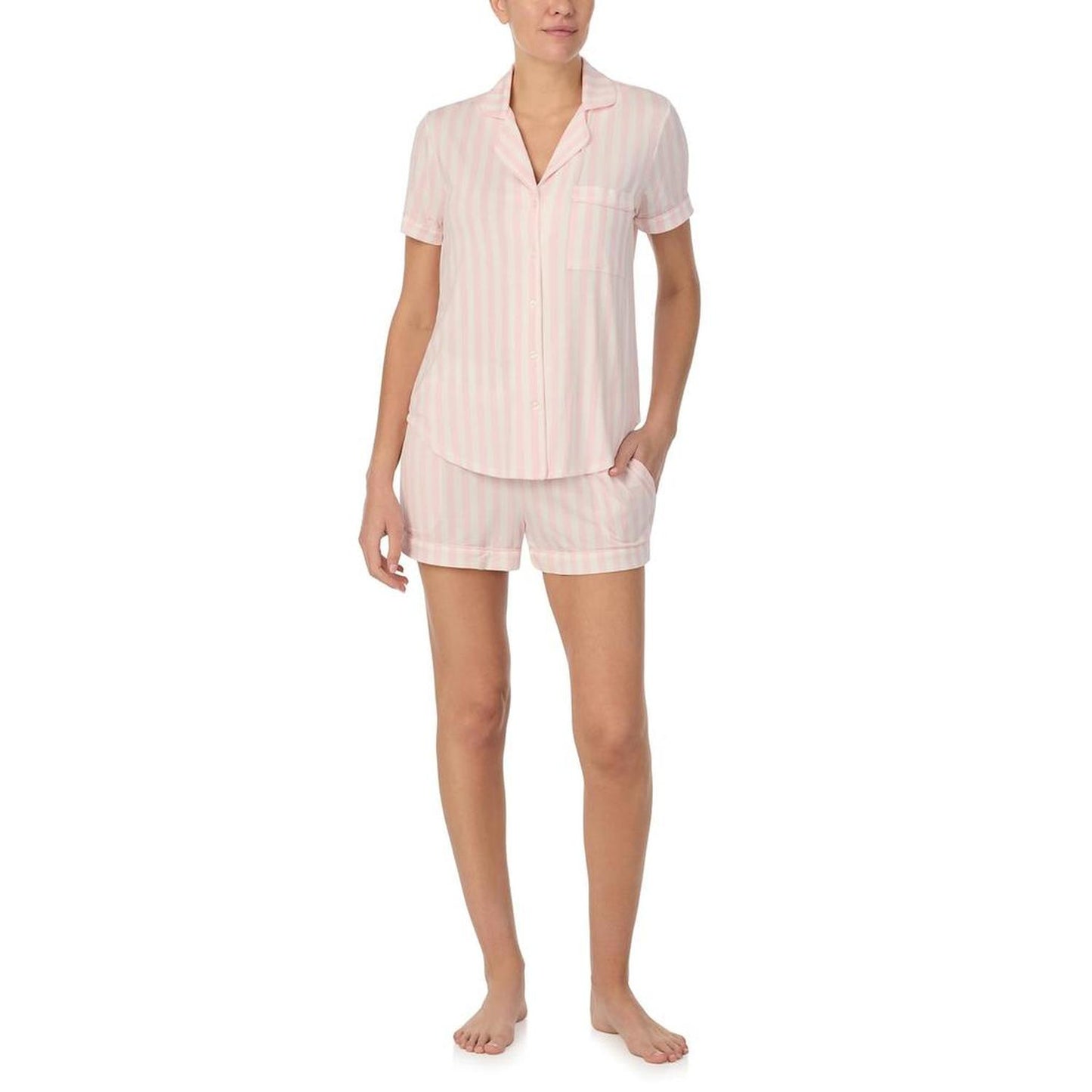 • Embrace the coziness of the Kate Spade New York® Boxer 3/4 Sleeve PJ Set while binge-watching your favorite shows. The top features a notch collar with a front button-closure, short sleeves, chest pocket, and a classic shirttail hemline. The pull-on style bottoms offer an elastic waistband and side seam hand pockets.