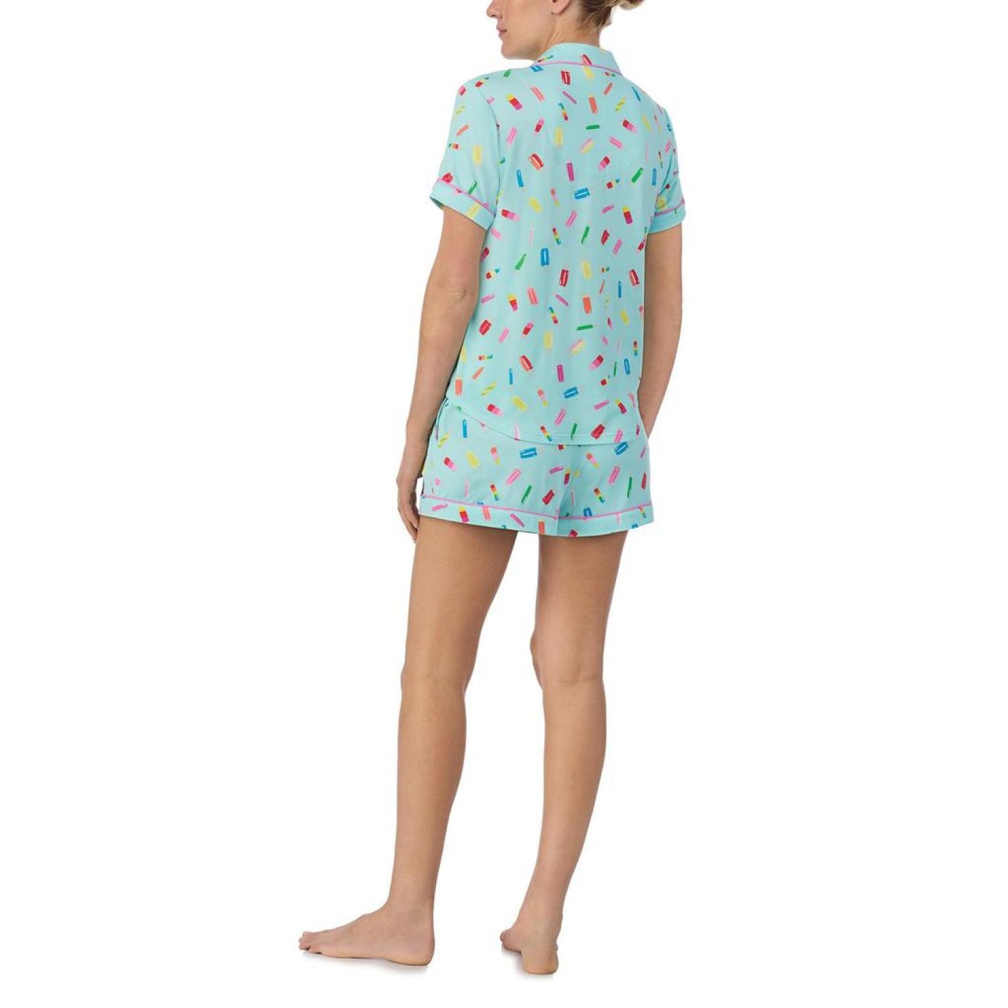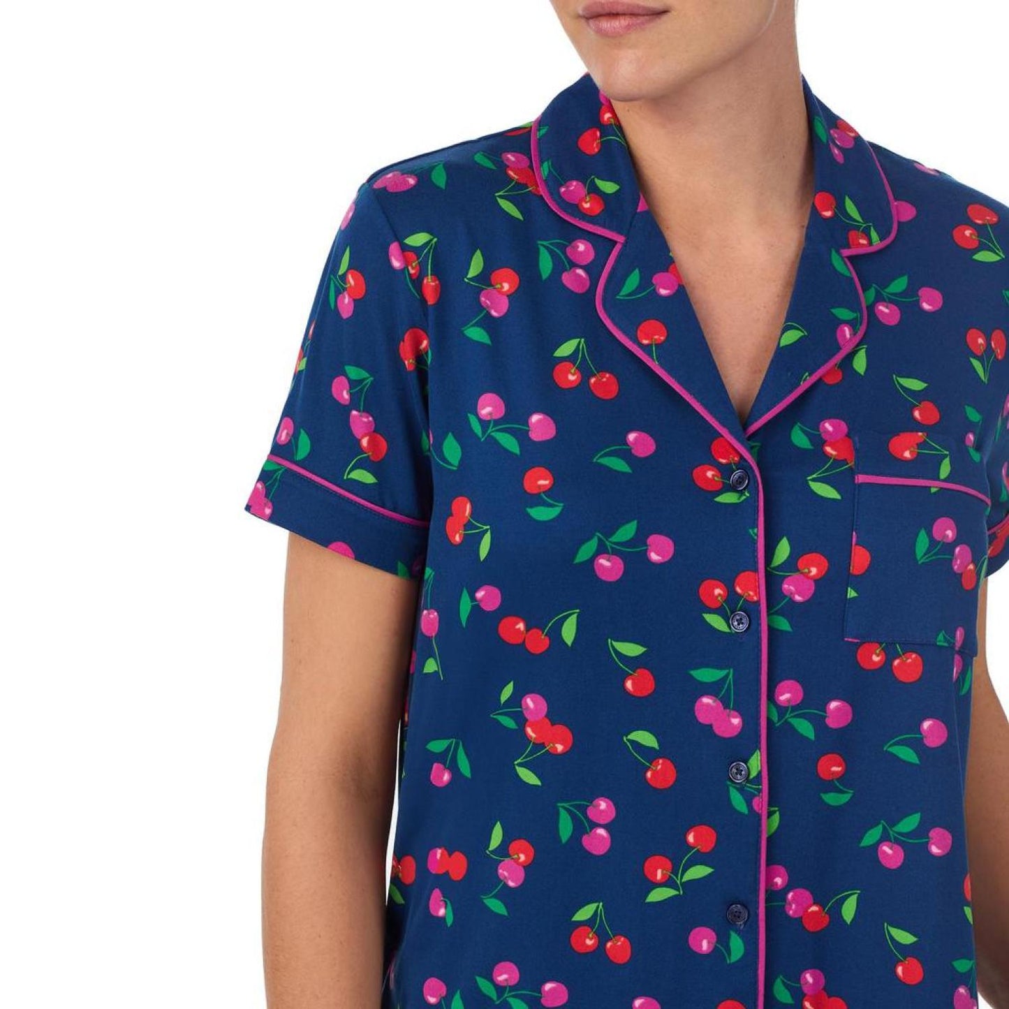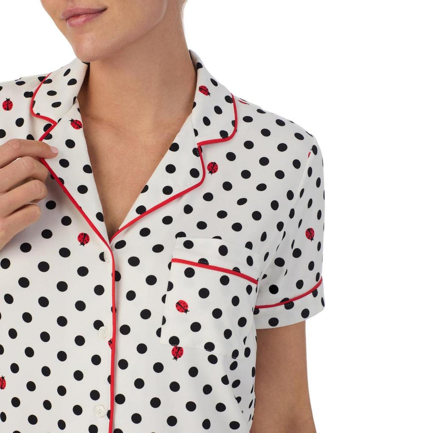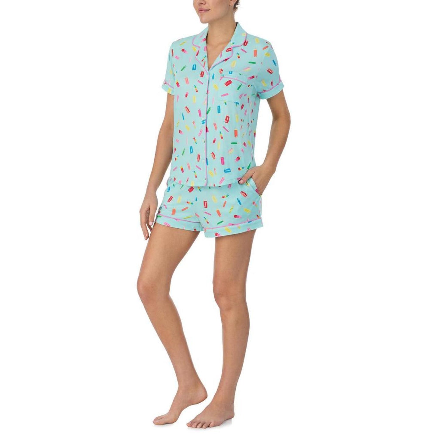 • Have a fun sleepover in the cool and relaxed Kate Spade New York® Boxer Short Sleeve PJ Set highlighting a classy allover print featured on a comfortable notch collar short sleeve shirt with a button-down closure on the front and a chest pocket.