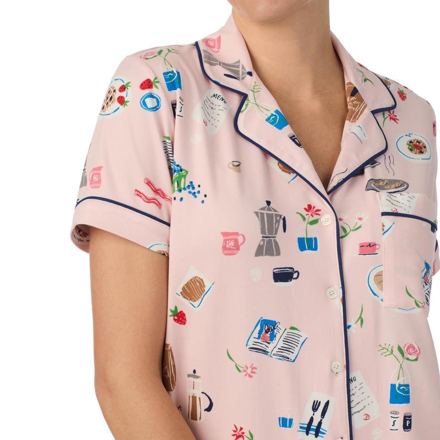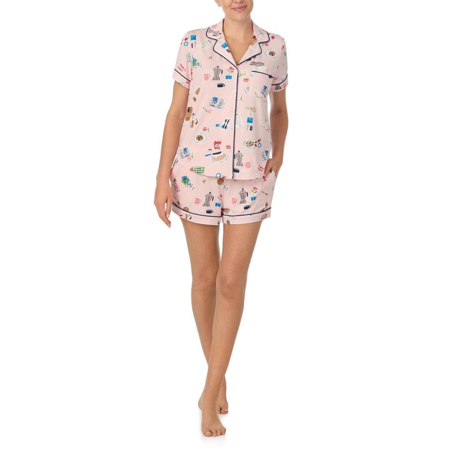 Whether you're lounging at home or getting ready to slip into your sweet slumberland, the Kate Spade New York® Boxer Short Sleeve PJ Set is the perfect fit! The top features a notch collar with contrast piping along the trim, short sleeves with contrast piping at the cuffs, chest pocket, front button placket, and a shirttail hemline. The pull-on style bottoms have an elastic waistband, side seam hand pockets and contrast piping at the cuffs.