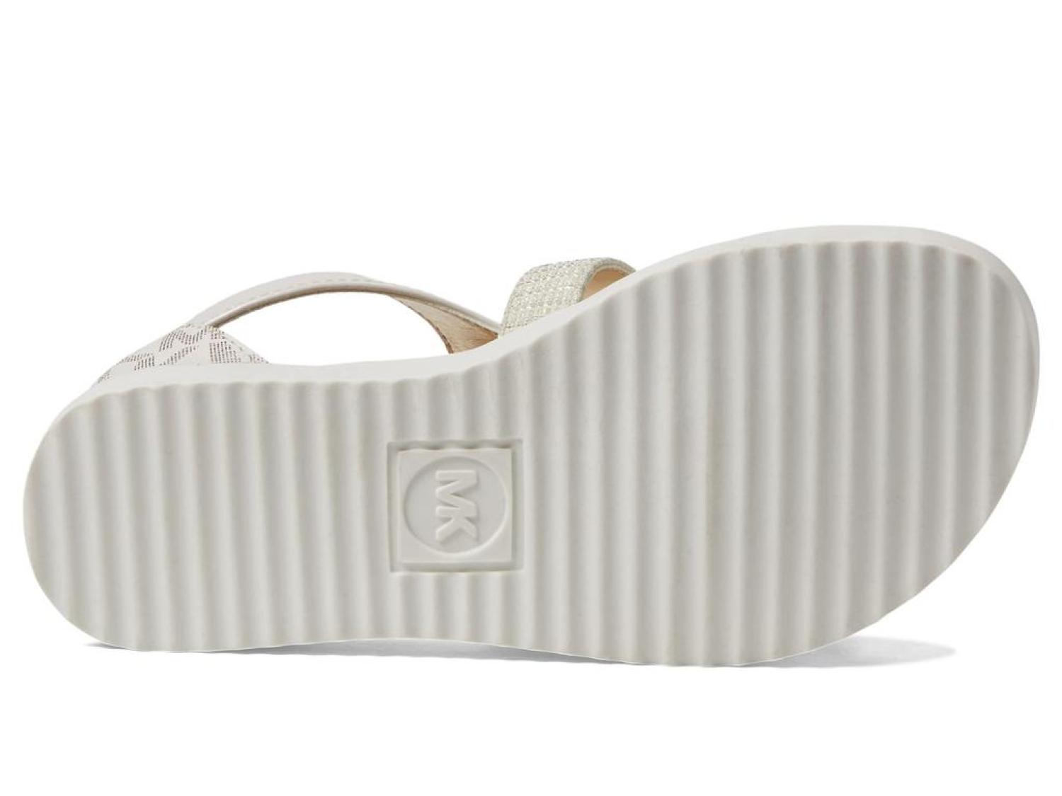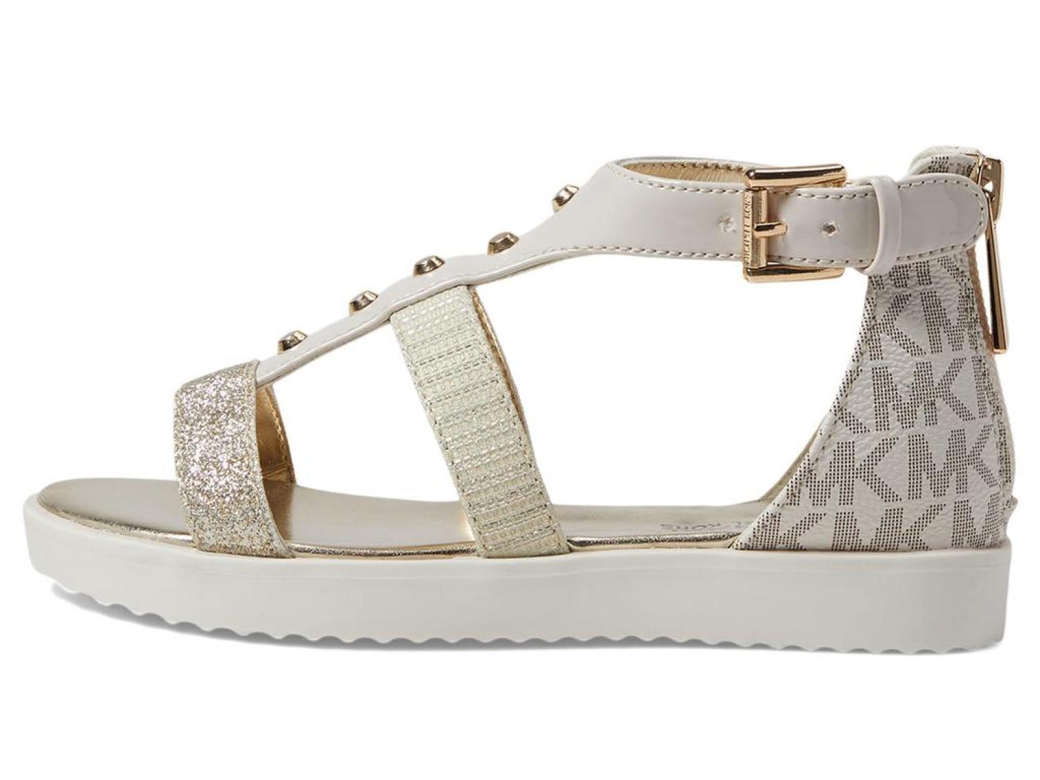 Give your little one an embellished appearance with the MICHAEL Michael Kors® Kids Brandy Myra sandals. Synthetic and metal upper. Textile and synthetic lining. Lightly cushioned insole. Buckle with back zippered closure. Stud detailing on the strap. Brand name embossed on the footbed. Open round toe design. Rubber blend outsole. Imported. Product measurements were taken using size 11 Little Kid, width M. Please note that measurements may vary by size. Measurements: Weight: 6 oz-