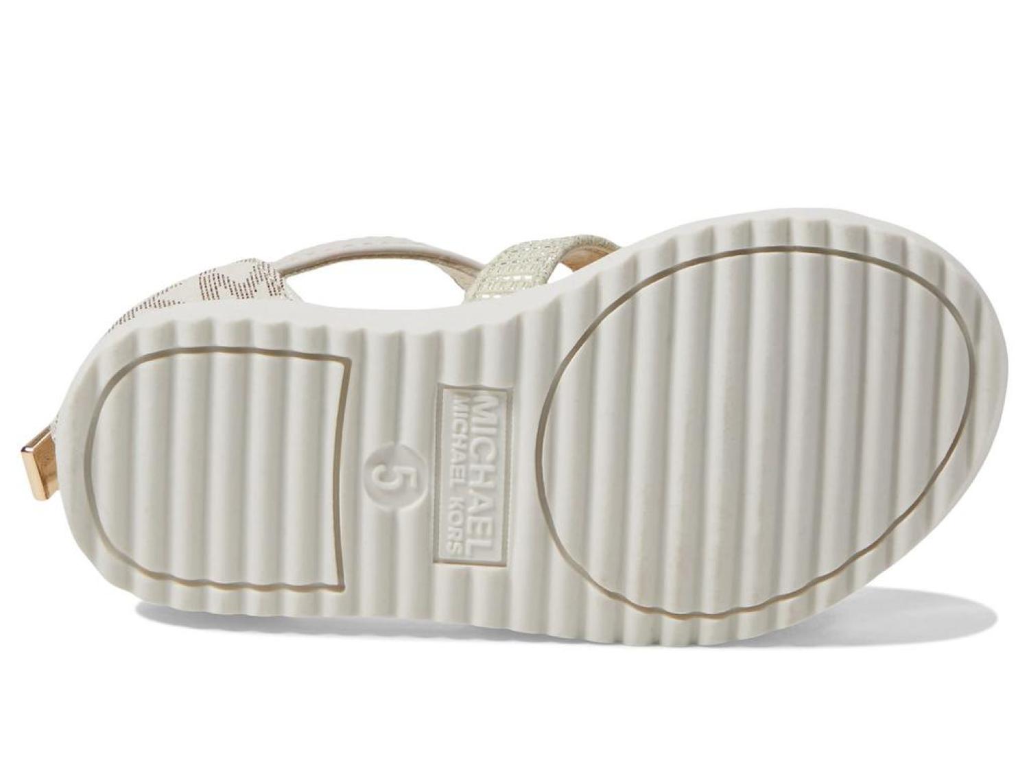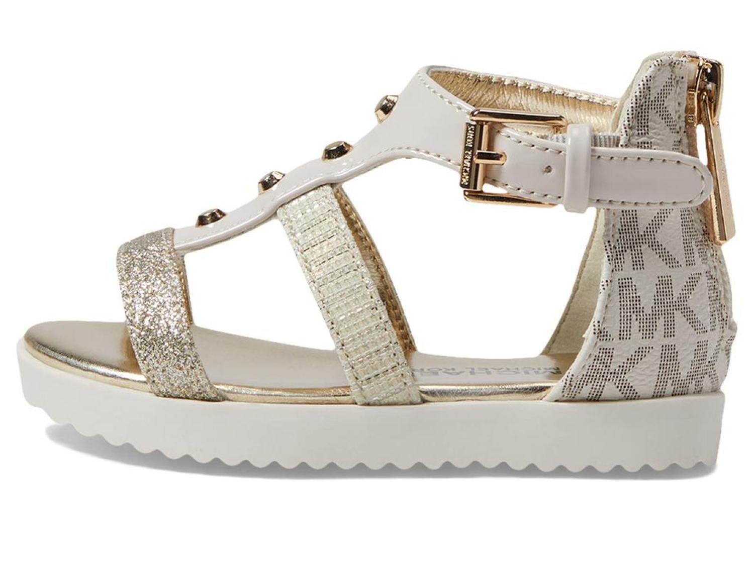 Make your little one party look elevated wearing MICHAEL Michael Kors® Kids Brandy Myra sandals. Synthetic and metal upper. Textile and synthetic lining. Lightly cushioned insole. Buckle with back zippered closure. Stud detailing on the strap. Brand name embossed on the footbed. Open round toe design. Rubber blend outsole. Imported. Product measurements were taken using size 5 Toddler, width M. Please note that measurements may vary by size. Measurements: Platform Height: 4 in-