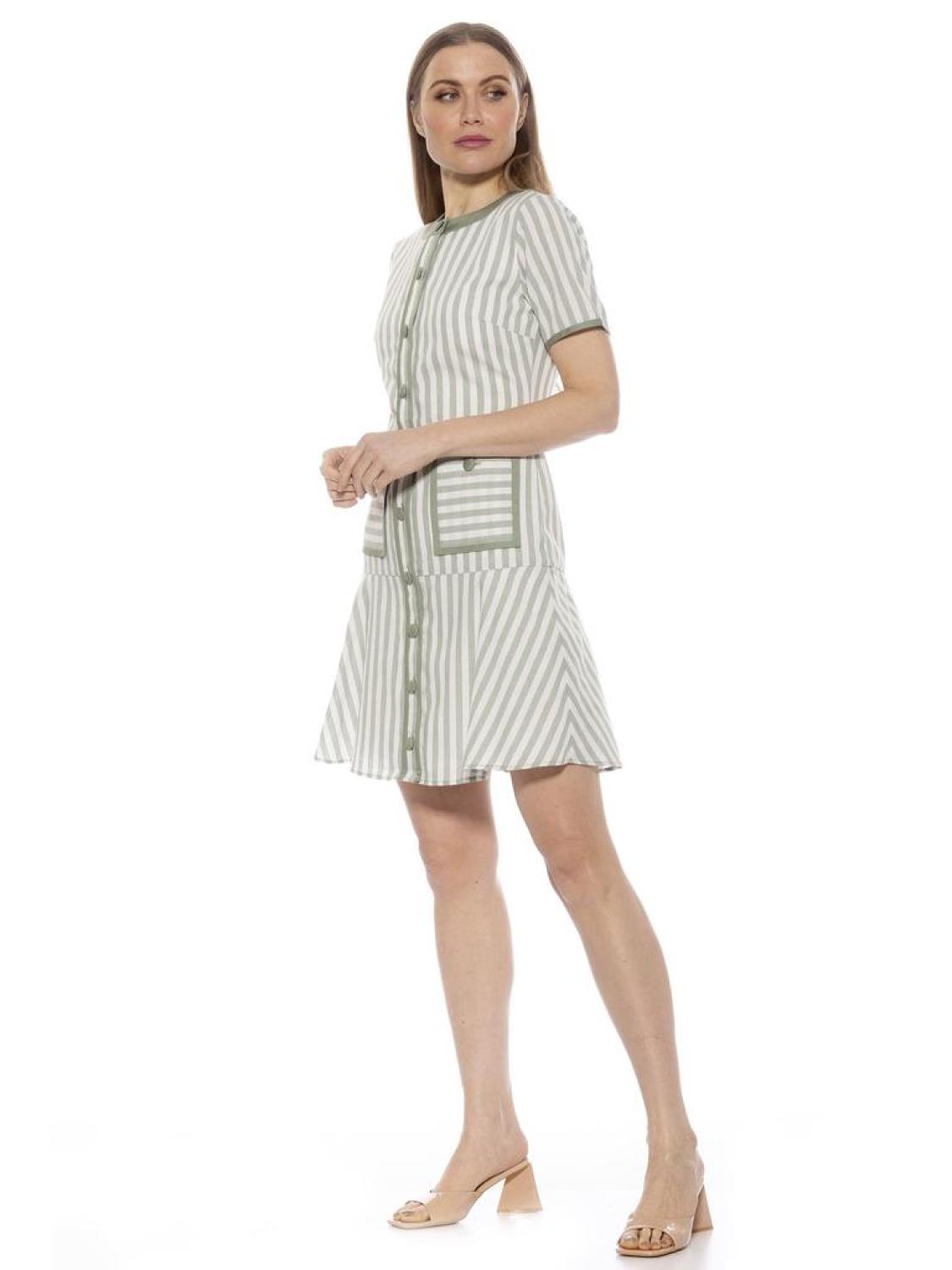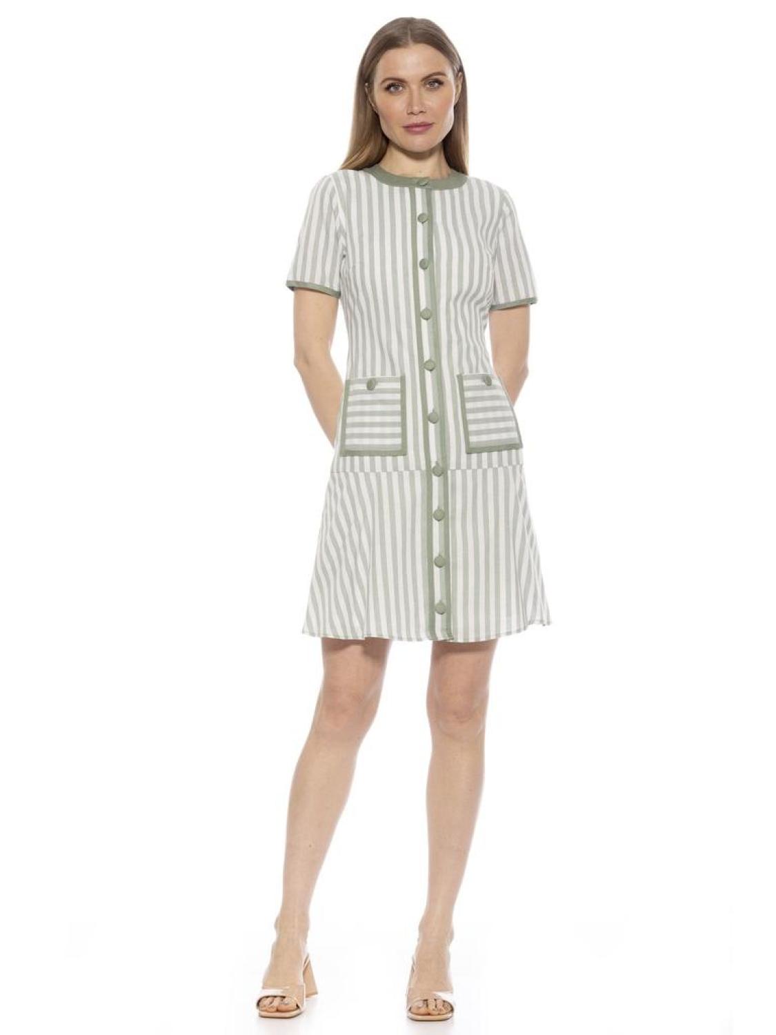 • Indulge in effortless style with our Brecken Stripe Short Sleeve Fit and Flare Mini Dress. Crafted with a crewneck and contrast lining, this dress is both elegant and practical. The short sleeves and fit and flare silhouette add a touch of sophistication, making it a perfect addition to your wardrobe. Crewneck Contrast Lining Short Sleeve Fit and Flare Mini Dress 100% Linen, Lining - 97% Polyester 3% Spandex Hand Wash, Hang Dry BRECKEN STRIPE SHORT SLV FIT AND FLARE MINI DRESS Imported Style D5067A