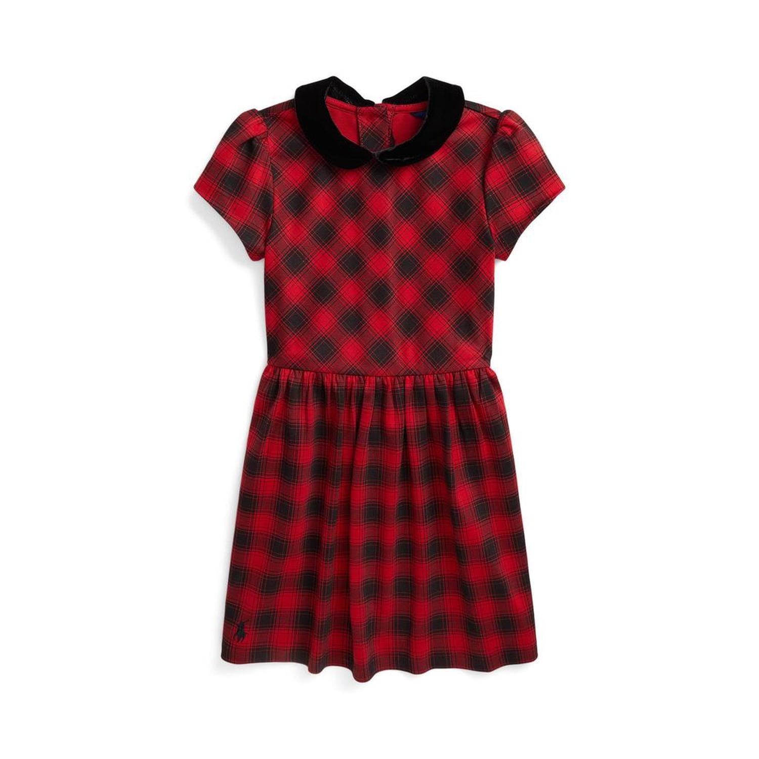 • The Polo Ralph Lauren® Kids Buffalo Check Stretch Ponte Dress is a charming addition to your child's wardrobe this season. This sleeveless dress features a playful fit-and-flare silhouette that exudes a youthful and festive charm. With its brushed velvet collar and bold checked print, this dress offers a delightful blend of style and comfort.