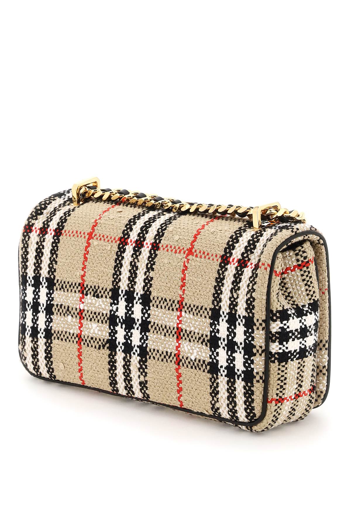 Lola crossbody bag by Burberry made of wool and cotton boucle blend with Vintage Check motif and metal TB monogram on the flap. Magnetic closure, fabric interior with one open pocket and chain strap with woven leather. Gold-finished metalware. Bag Length = 22 cm, Bag Height = 13 cm,