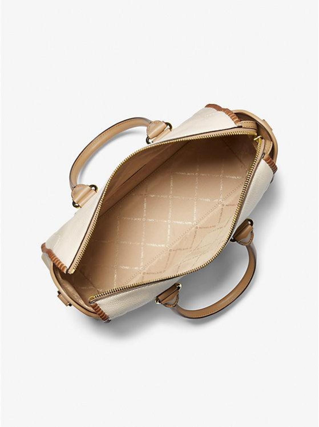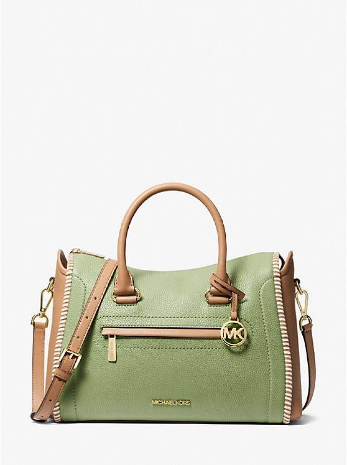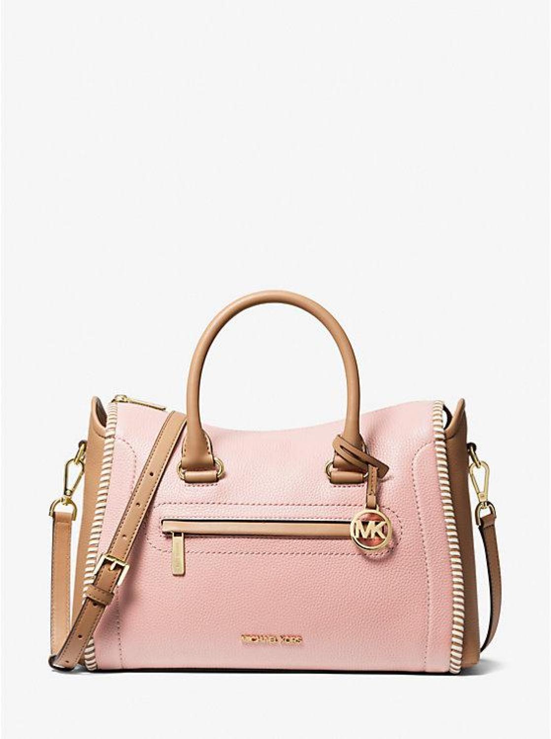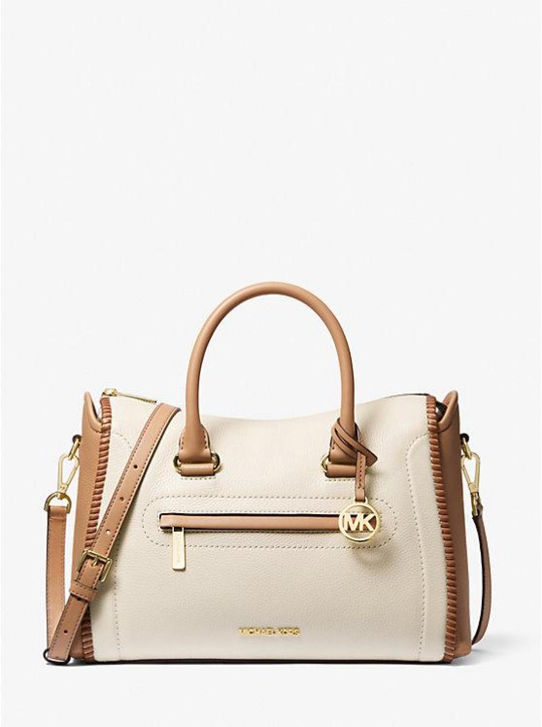 • An instant icon: our sleek Carine satchel will go from day to night with ease, thanks to a generously sized interior with an array of pockets, structured top handles and a removable crossbody strap for varied carrying options. Crafted from pebbled leather with whipstitched trim, it adds a sophisticated touch to any look. A removable “MK” charm lends a polished finish.