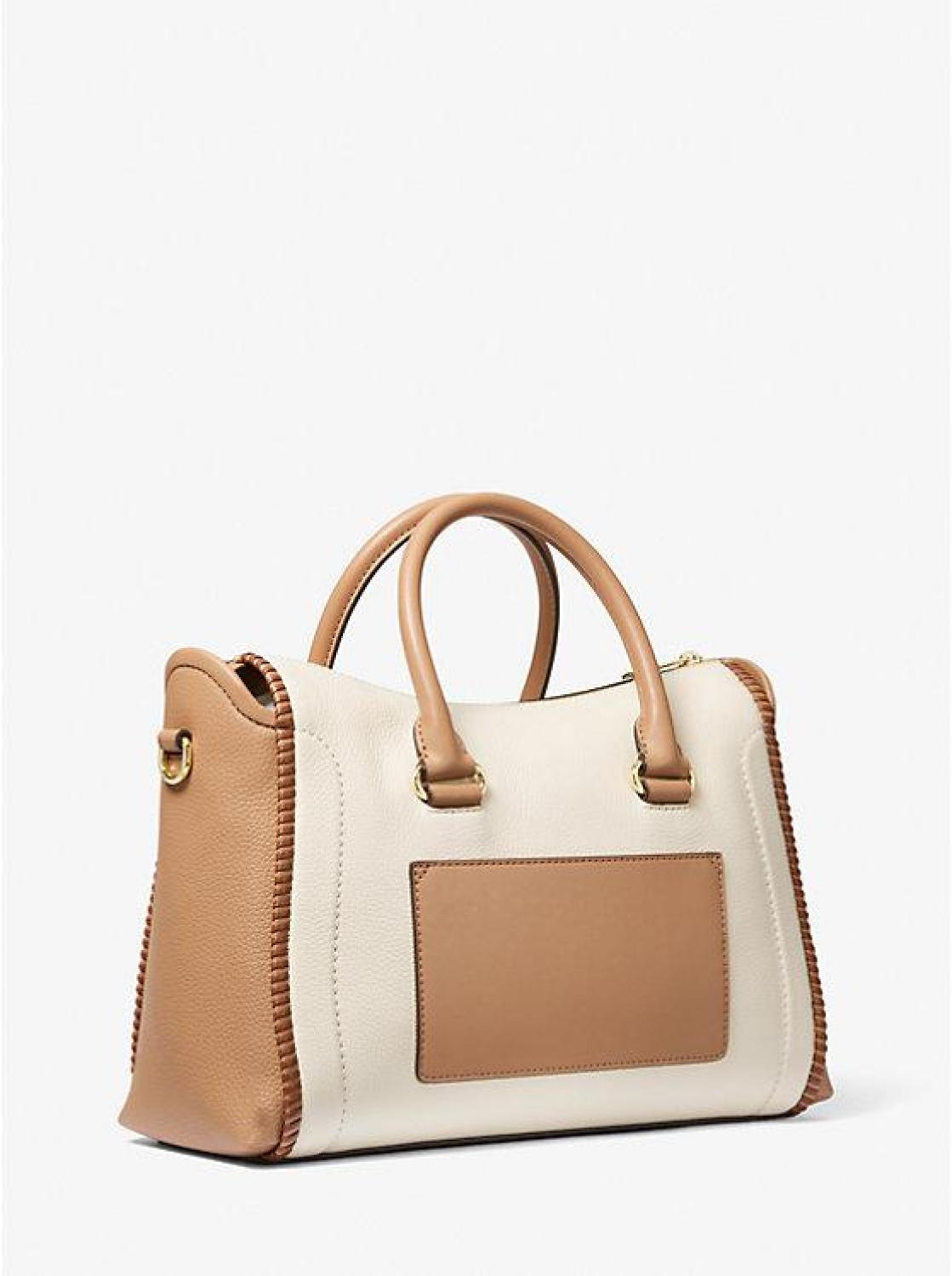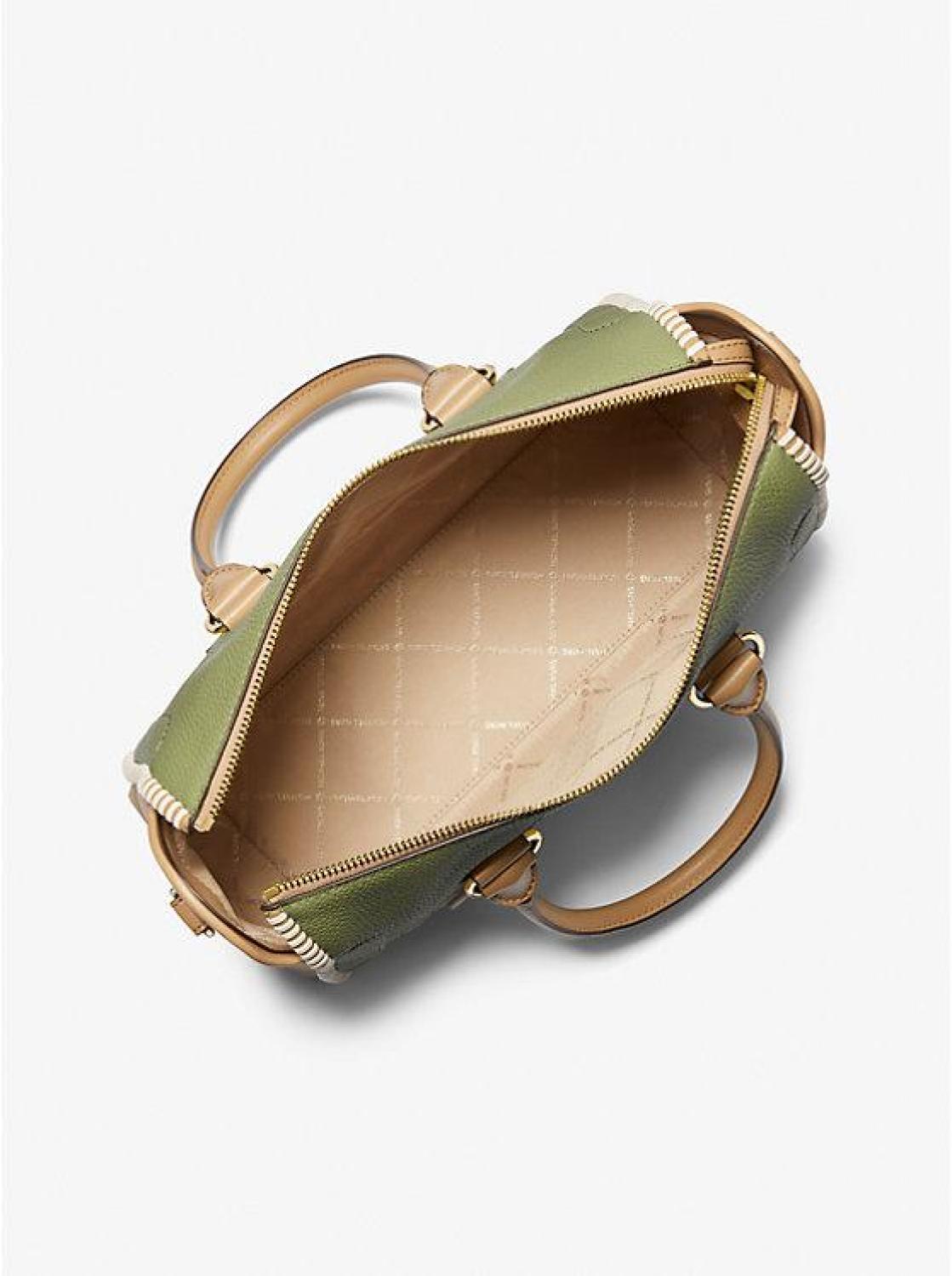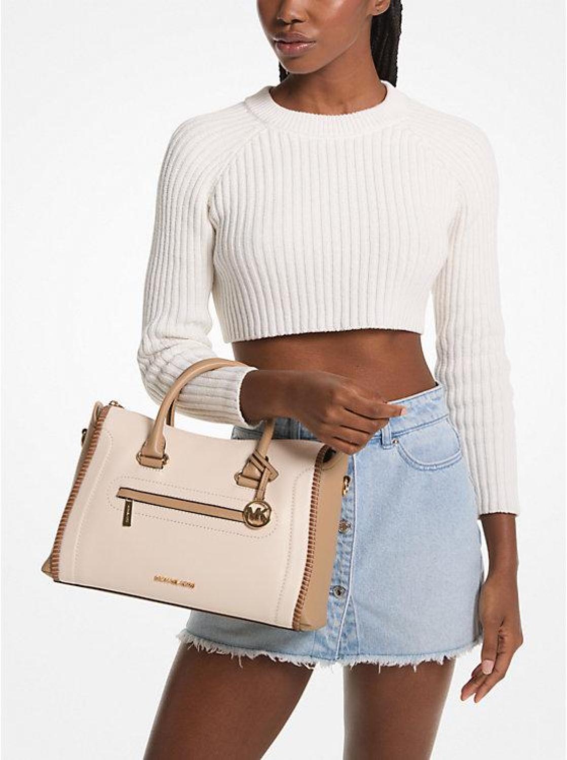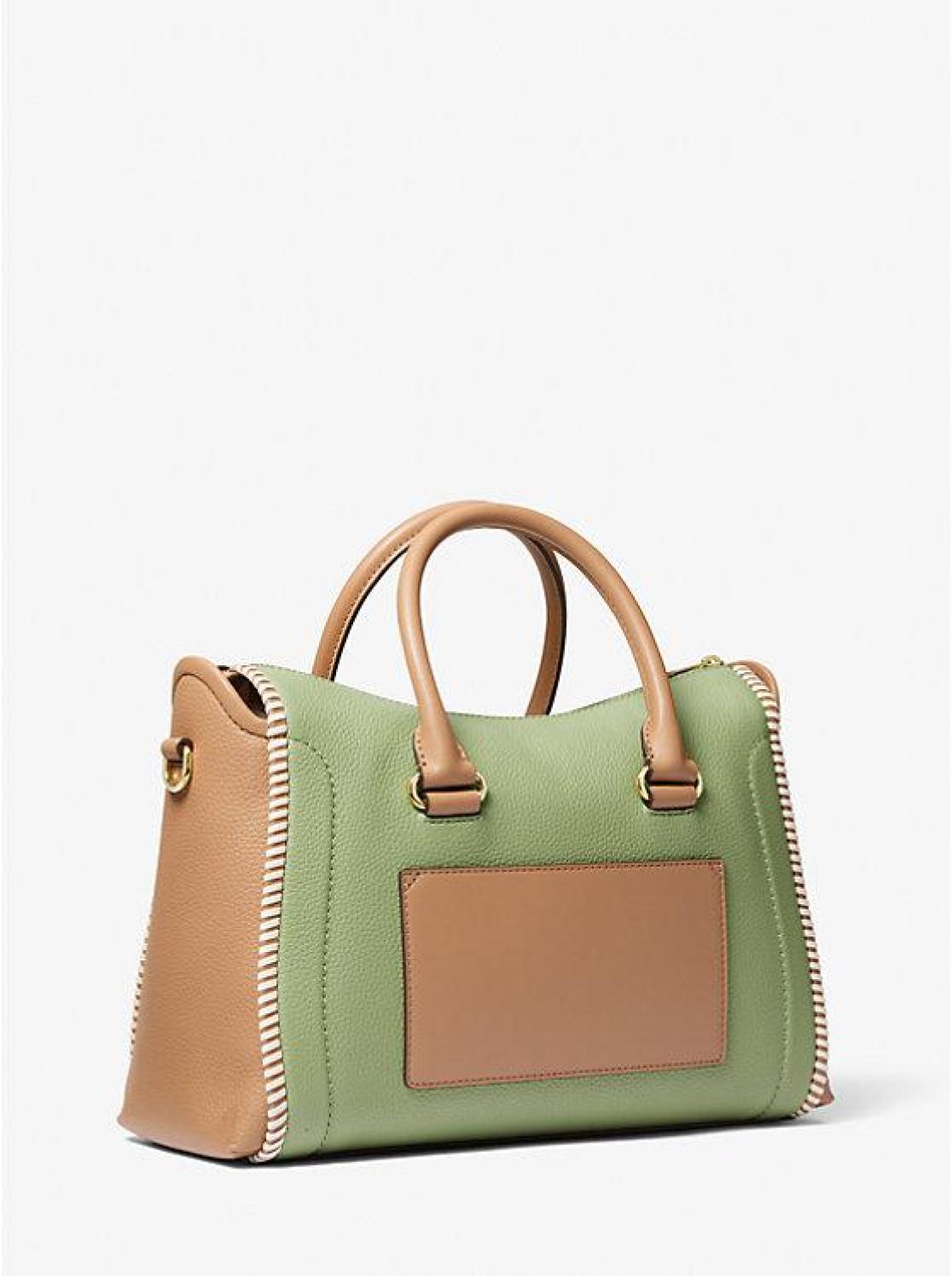 • An instant icon: our sleek Carine satchel will go from day to night with ease, thanks to a generously sized interior with an array of pockets, structured top handles and a removable crossbody strap for varied carrying options. Crafted from pebbled leather with whipstitched trim, it adds a sophisticated touch to any look. A removable “MK” charm lends a polished finish.