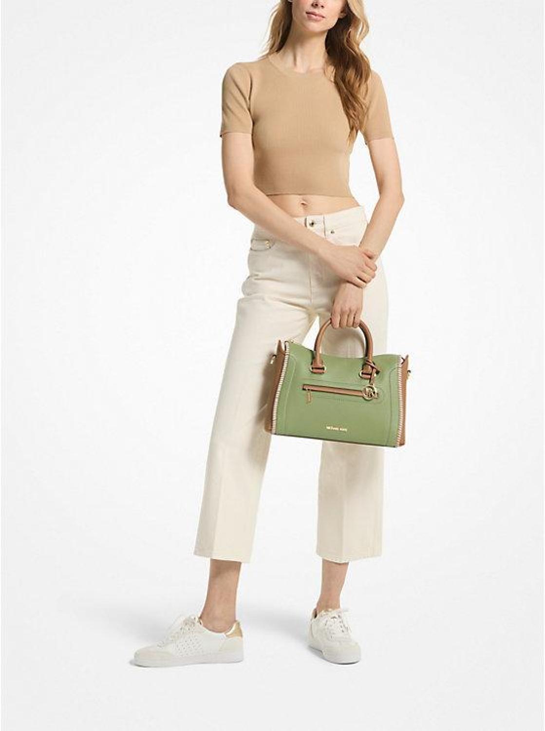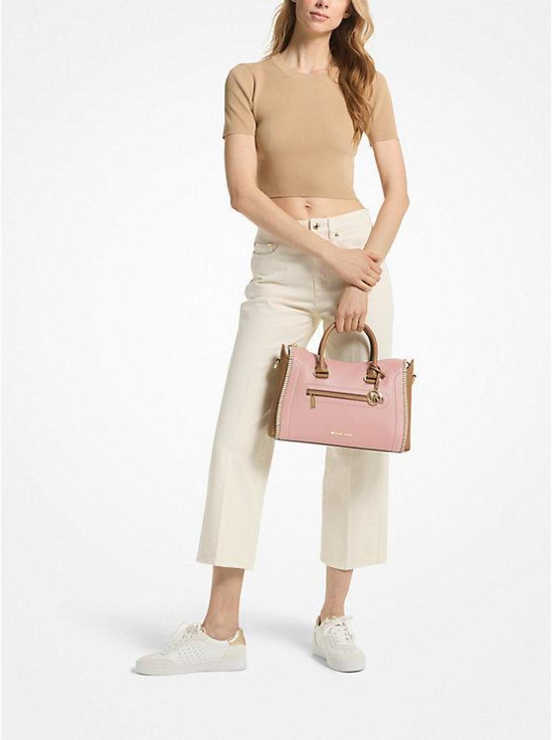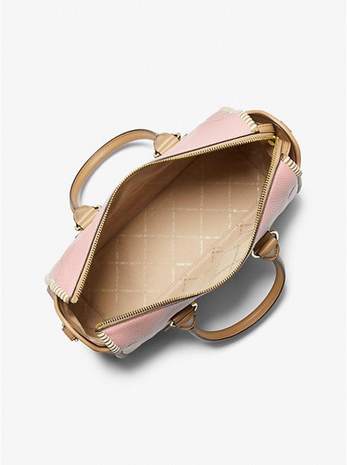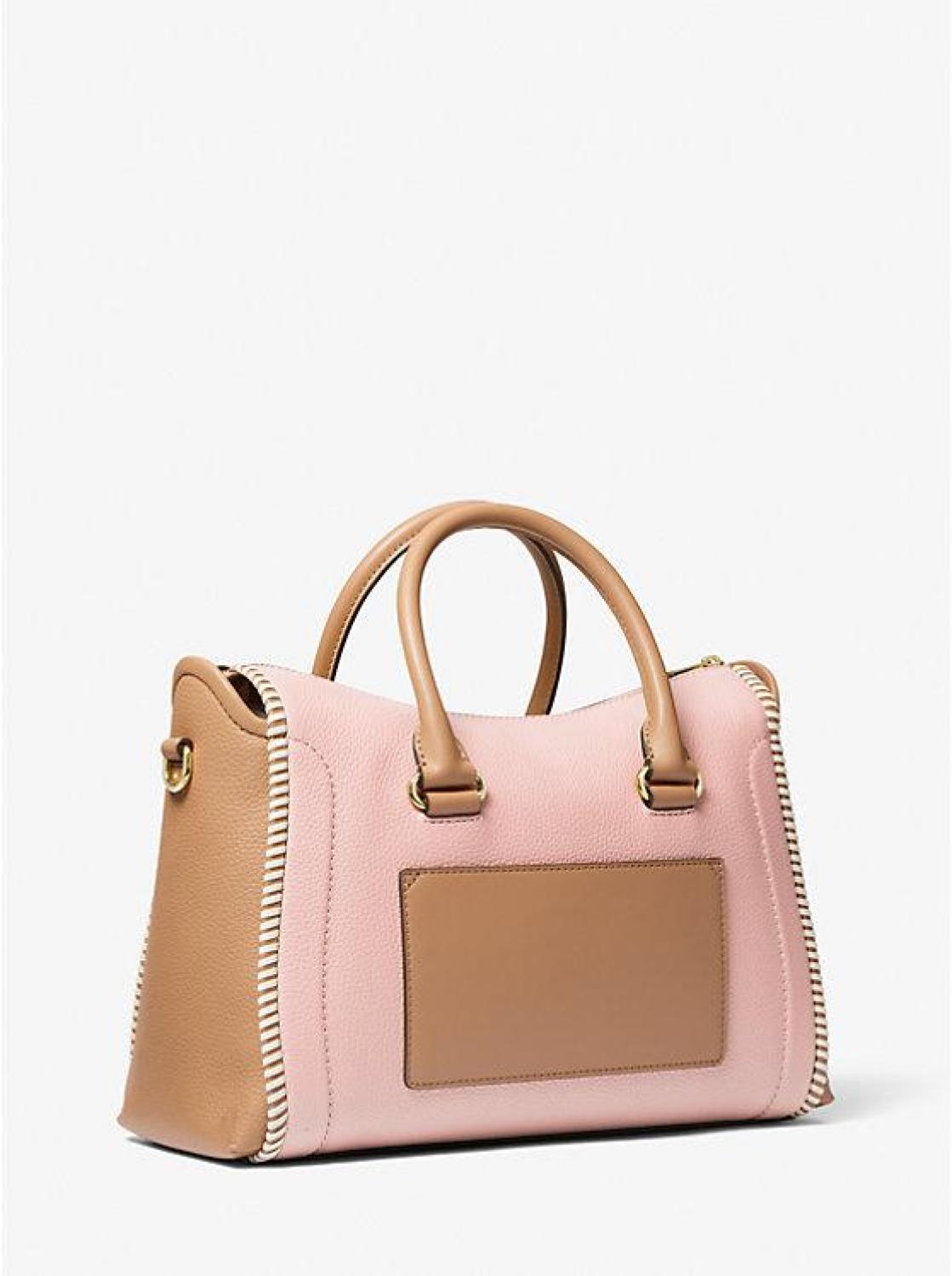 • An instant icon: our sleek Carine satchel will go from day to night with ease, thanks to a generously sized interior with an array of pockets, structured top handles and a removable crossbody strap for varied carrying options. Crafted from pebbled leather with whipstitched trim, it adds a sophisticated touch to any look. A removable “MK” charm lends a polished finish.