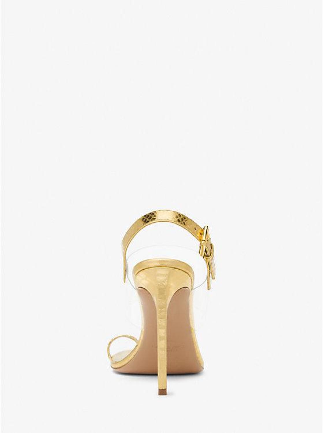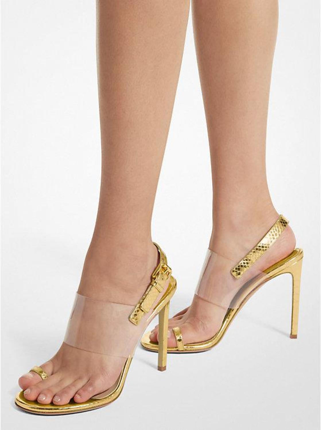 • Introducing Catherine: A minimalist, metallic python-embossed sandal with modern appeal. Leather toe straps and a barely-there vinyl vamp give these heels a unique look, while a sharp stiletto heel adds a fierce finish. Available in a myriad of neutral colorways, this chic sandal will complement maxi dresses and tailored shorts alike.