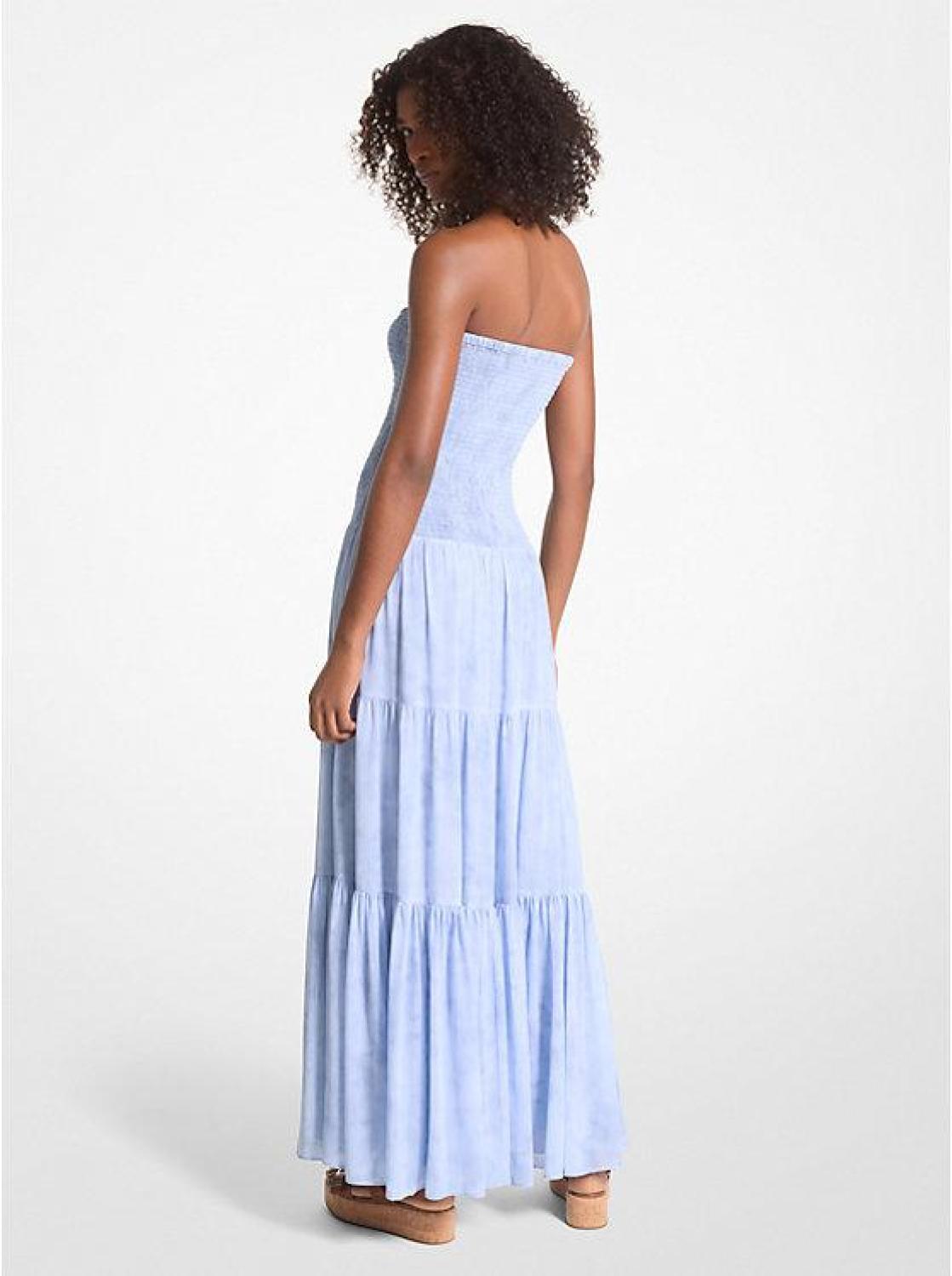 This washed chambray print maxi dress breathes new life into your vacation-ready wardrobe. The breezy, lightweight georgette construction is transformed by a smocked bodice that falls to a romantic tiered skirt for a flattering silhouette. Take it into bohemian territory with a grommeted waist belt and our Colby flatform sandals. • Dress • Polyester georgette • 55% recycled polyester/45% polyester • Lining: 55% recycled polyester/45% polyester • Dry clean • Imported • Model is 5’9”/175 cm wearing size XS • Dress • Polyester georgette • 55% recycled polyester/45% polyester • Lining: 55% recycled polyester/45% polyester • Dry clean • Imported • Model is 5’9”/175 cm wearing size XS