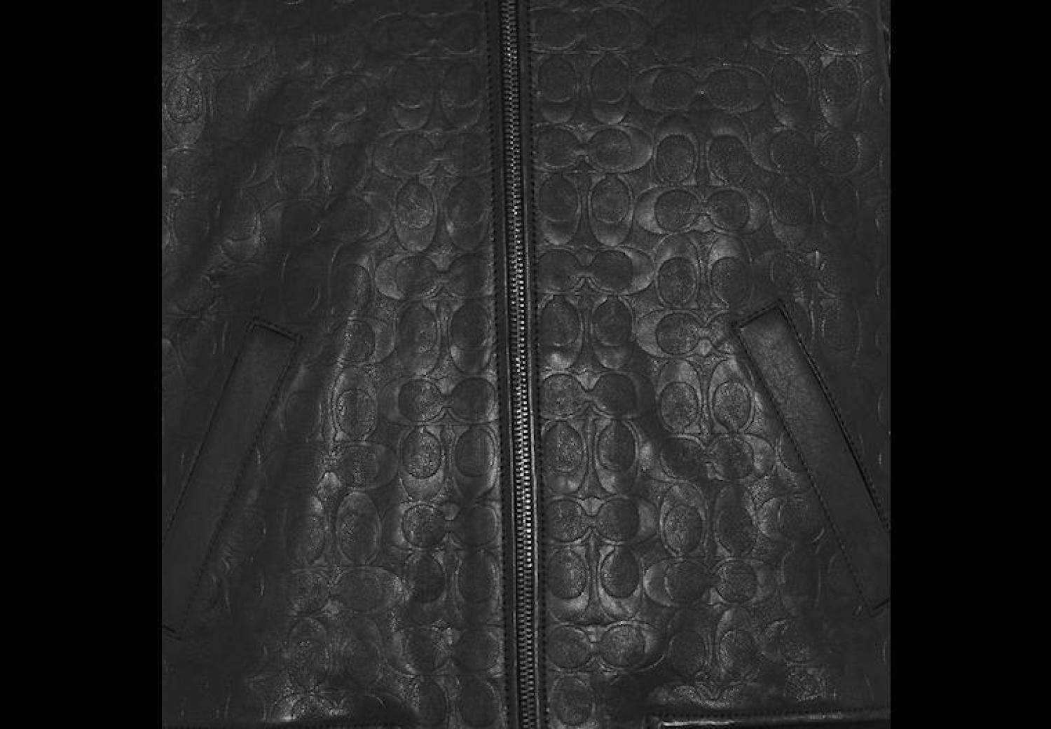 100% sheep leather Knit rib - 64% acrylic 27% wool 8% polyamide 1% elastane Lining - 52% polyester 48% viscose Fill - 100% polyester Leather details Zip closure Slip pockets Length - 26 Model is 6'2 (188cm) and wears a size M Style No. CF803 | Coach Outlet Leather Signature Jacket - Black, Size - X-Small