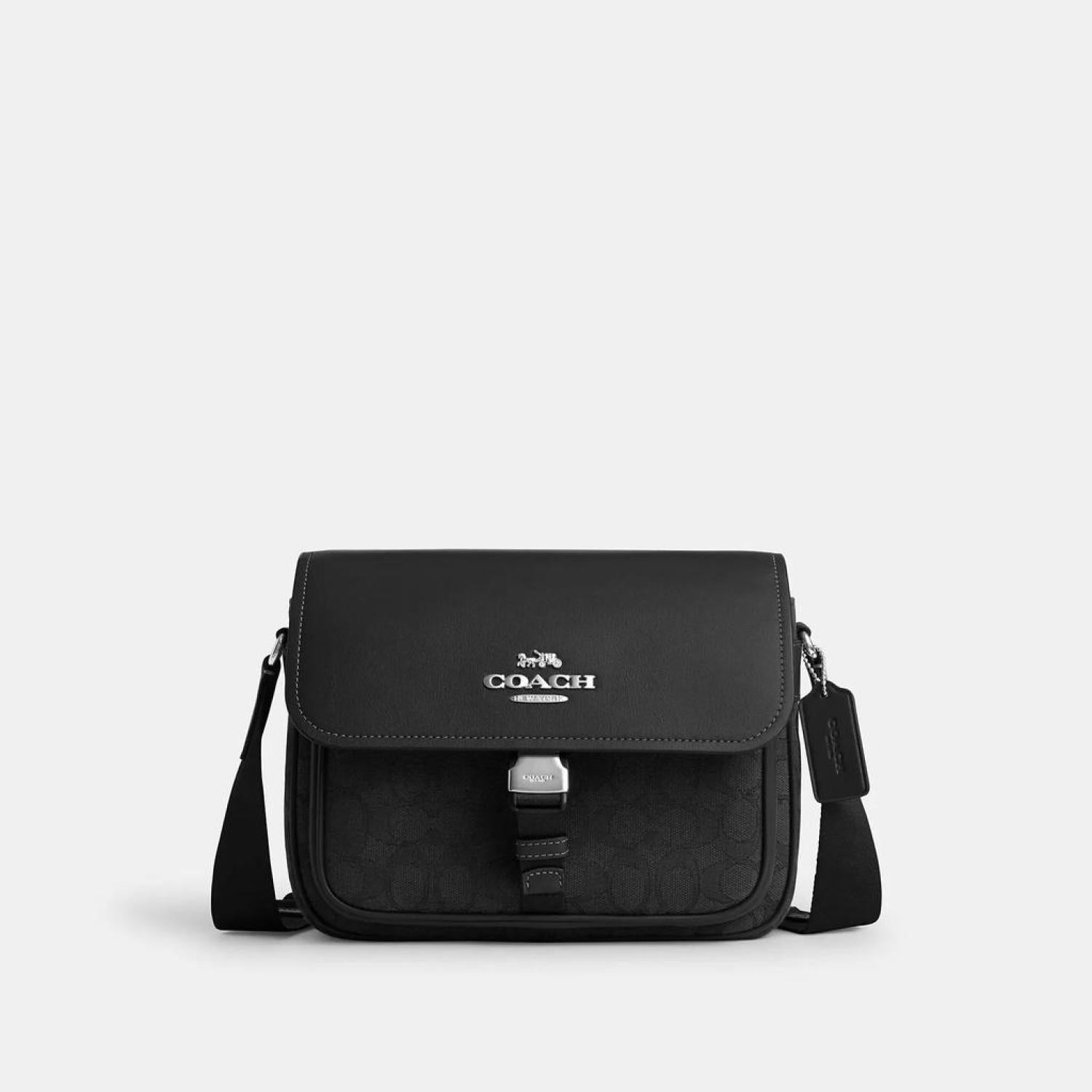 Signature jacquard and soft refined calf leather Inside multifunction pocket Speedclip closure fabric lining Outside open pockets Detachable strap with 24 drop for shoulder or crossbody wear 9 3/4 (L) x 7 3/4 (H) x 3 (W) Exclusive of trim this Coach piece is crafted of our Signature jacquard made from a blend of organic cotton and recycled polyester Style No. CT818 | Coach Outlet Pace Messenger Bag In Signature Jacquard - Black