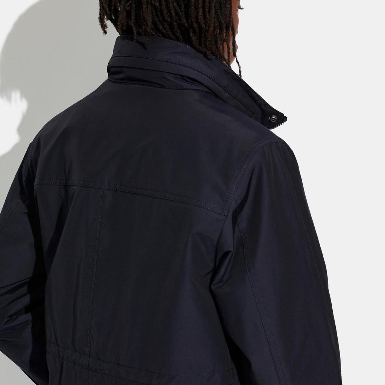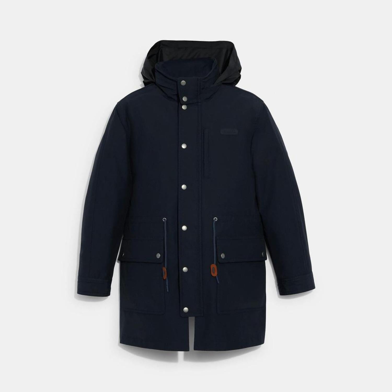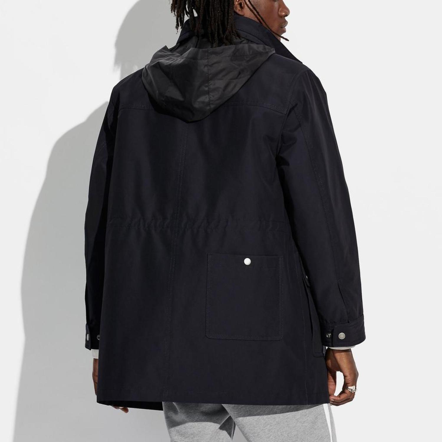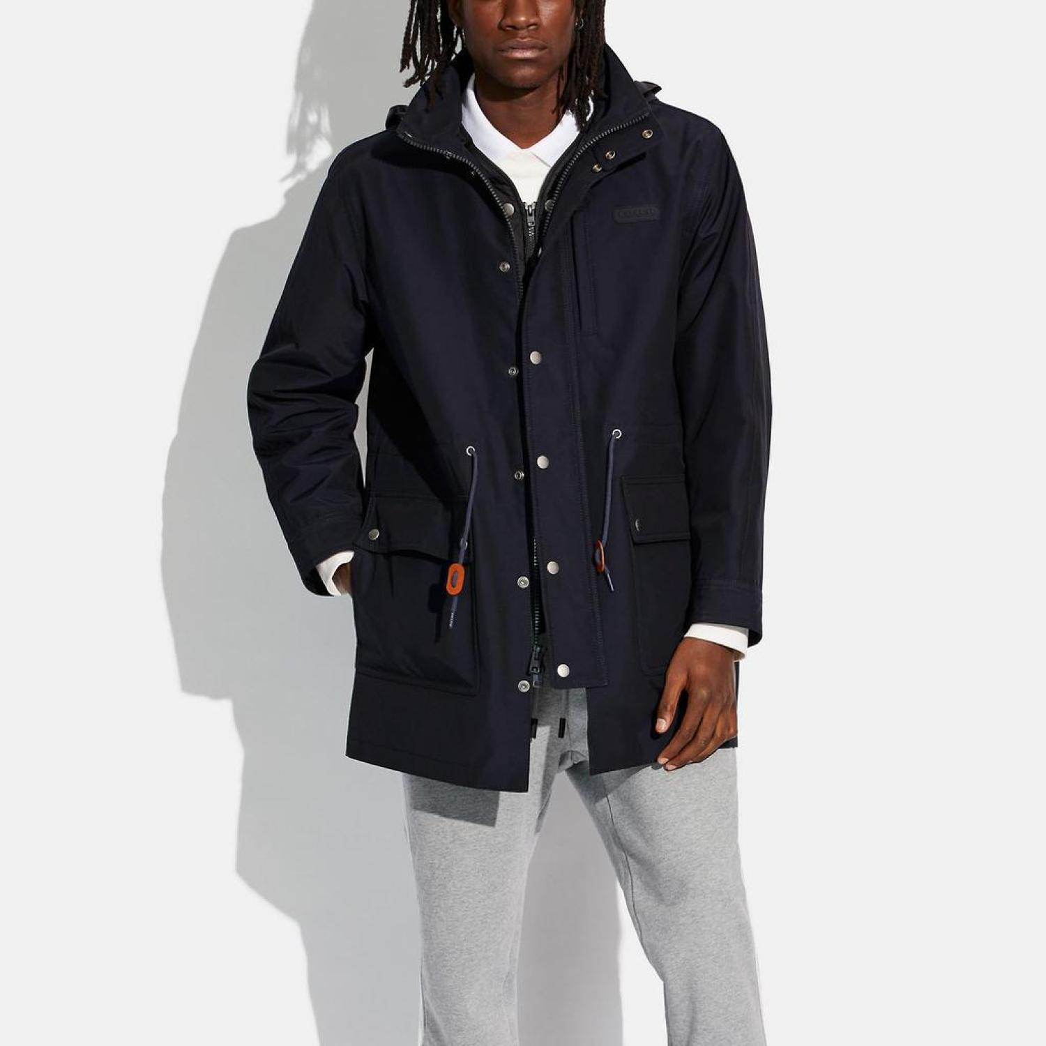 Front - 60% cotton 40% polyamide Back - 100% polyester Removable liner - 100% polyester Leather details Zip and snap button closures Snap and zip pockets Built-in hood rolls and stows inside collar Water-resistant Length - 37 1/2 Spot clean Model is 6'2 (188cm) and wears a size 50 Style No. C8709 | Coach Outlet Parka - Blue, Size - Small