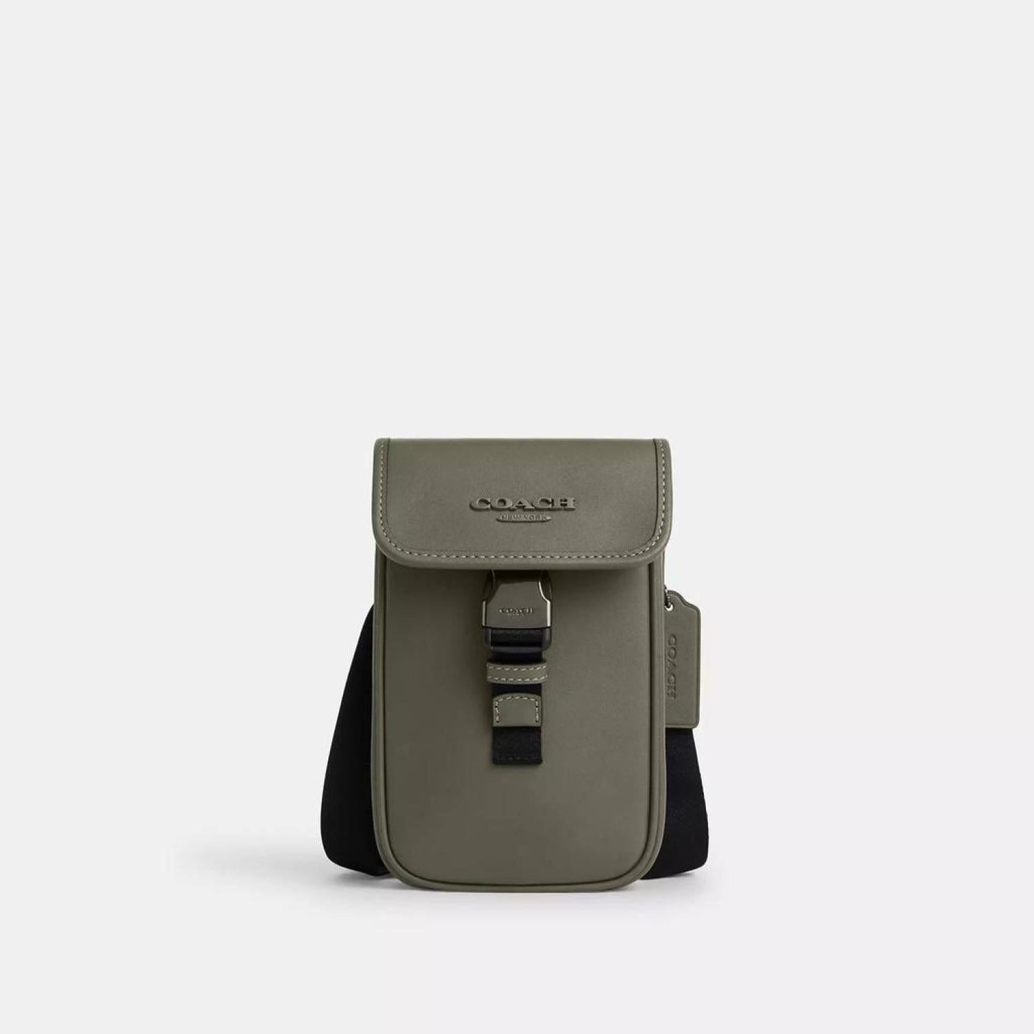 • Smooth calf leather Speedclip closure fabric lining Adjustable strap with 29 1/2 drop for shoulder and crossbody wear 4 1/4 (L) x 7 1/4 (H) x 1 1/2 (W) Style No. CT886 | Coach Outlet Racer Phone Crossbody In Smooth Leather - Green