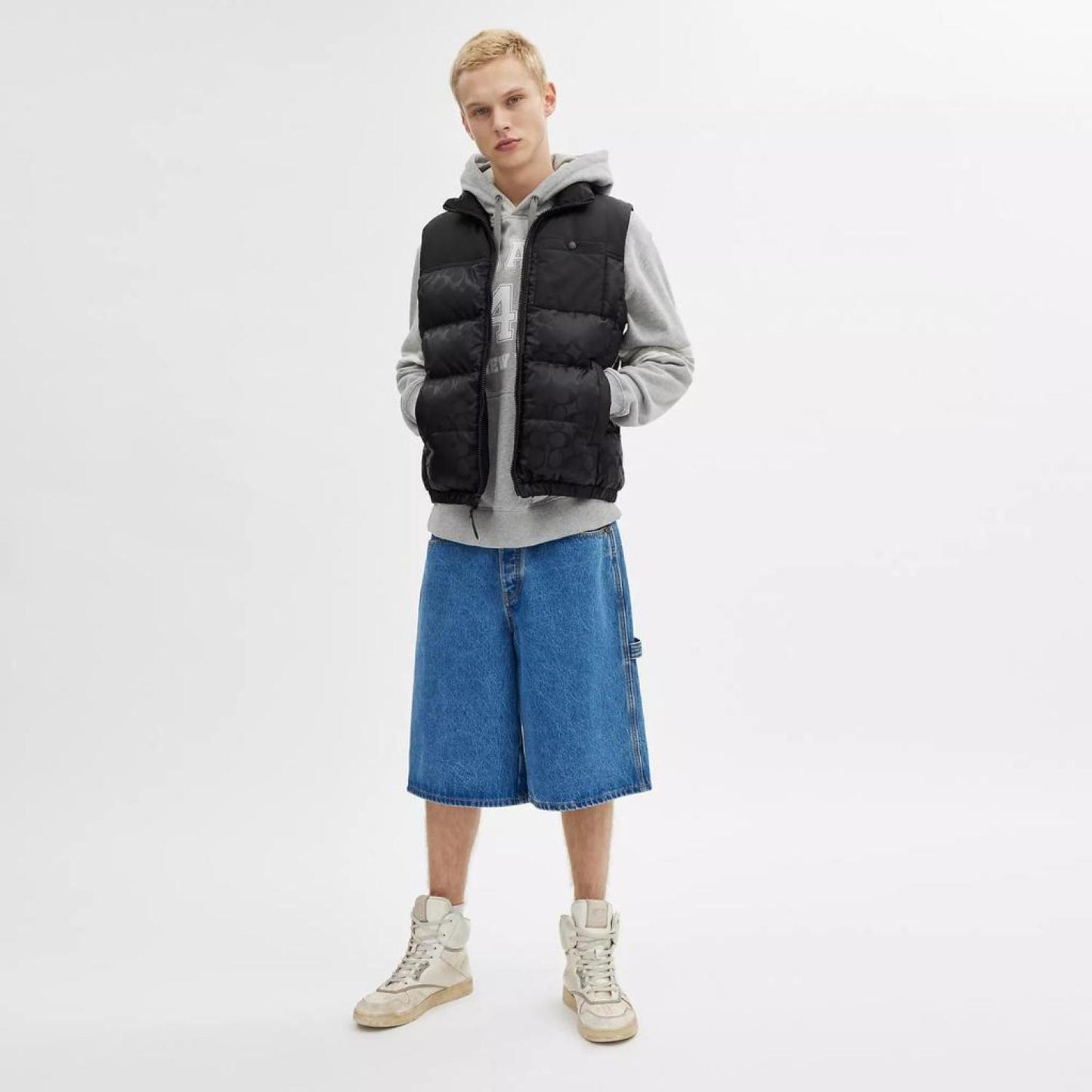• 66% polyamide 34% polyester Combo shell - 100% polyester Lining - 100% polyester Leather details Fill 1 - 90% goose down 10% goose feathers Fill 2 - 100% polyester Zip closure Slip pockets Water-resistant Length - 28 1/4 Machine wash Model is 6'2 (188cm) and wears a size M Style No. CF881 | Coach Outlet Signature Puffer Vest - Black, Size - Large