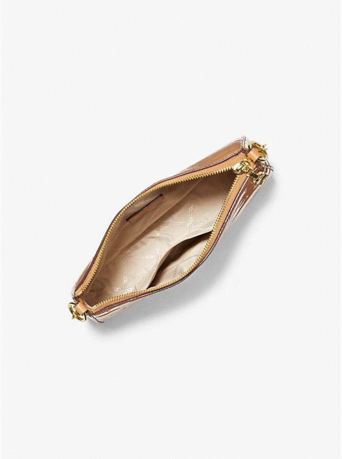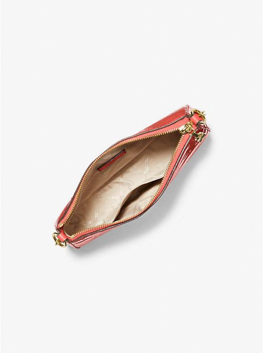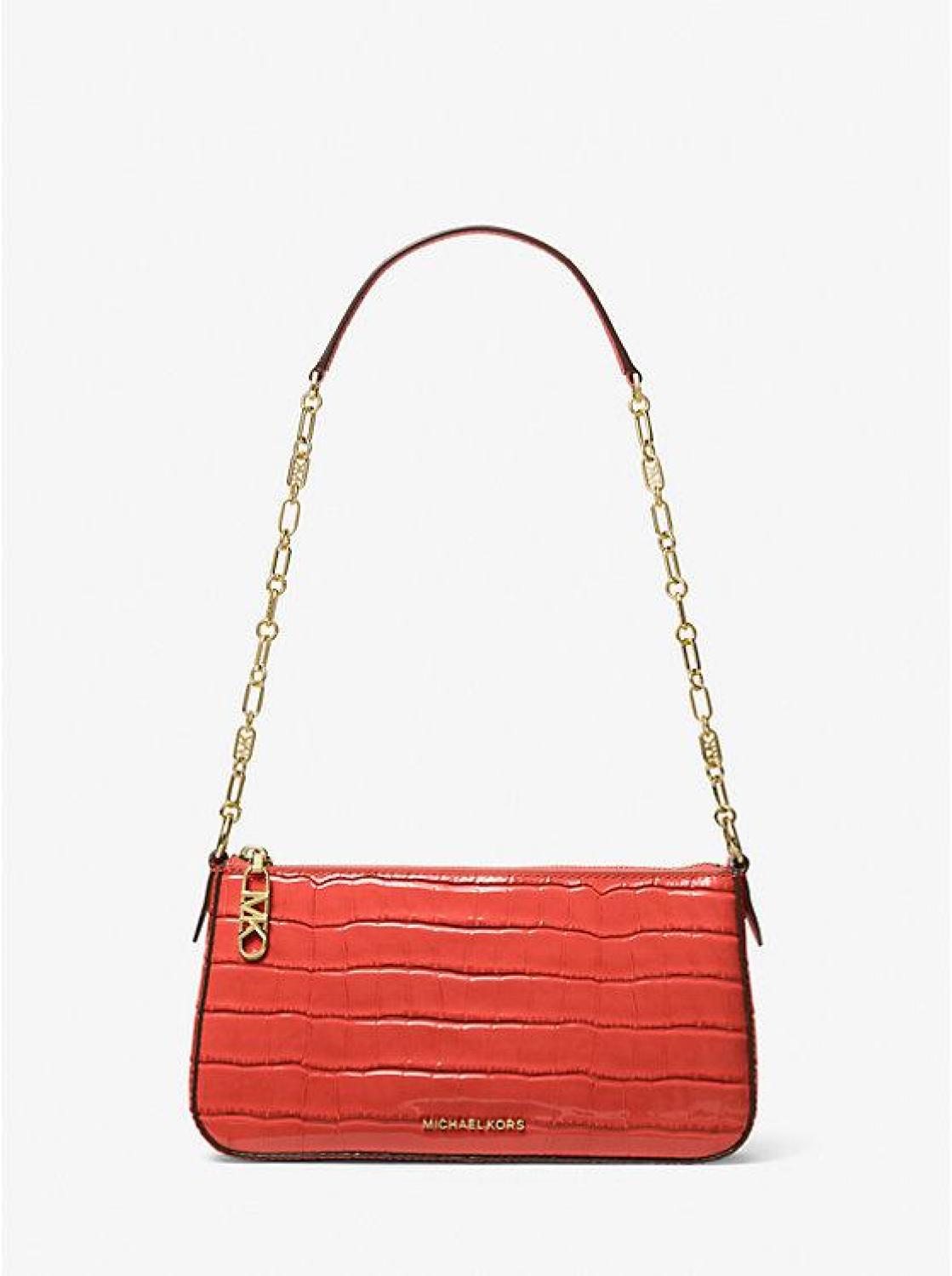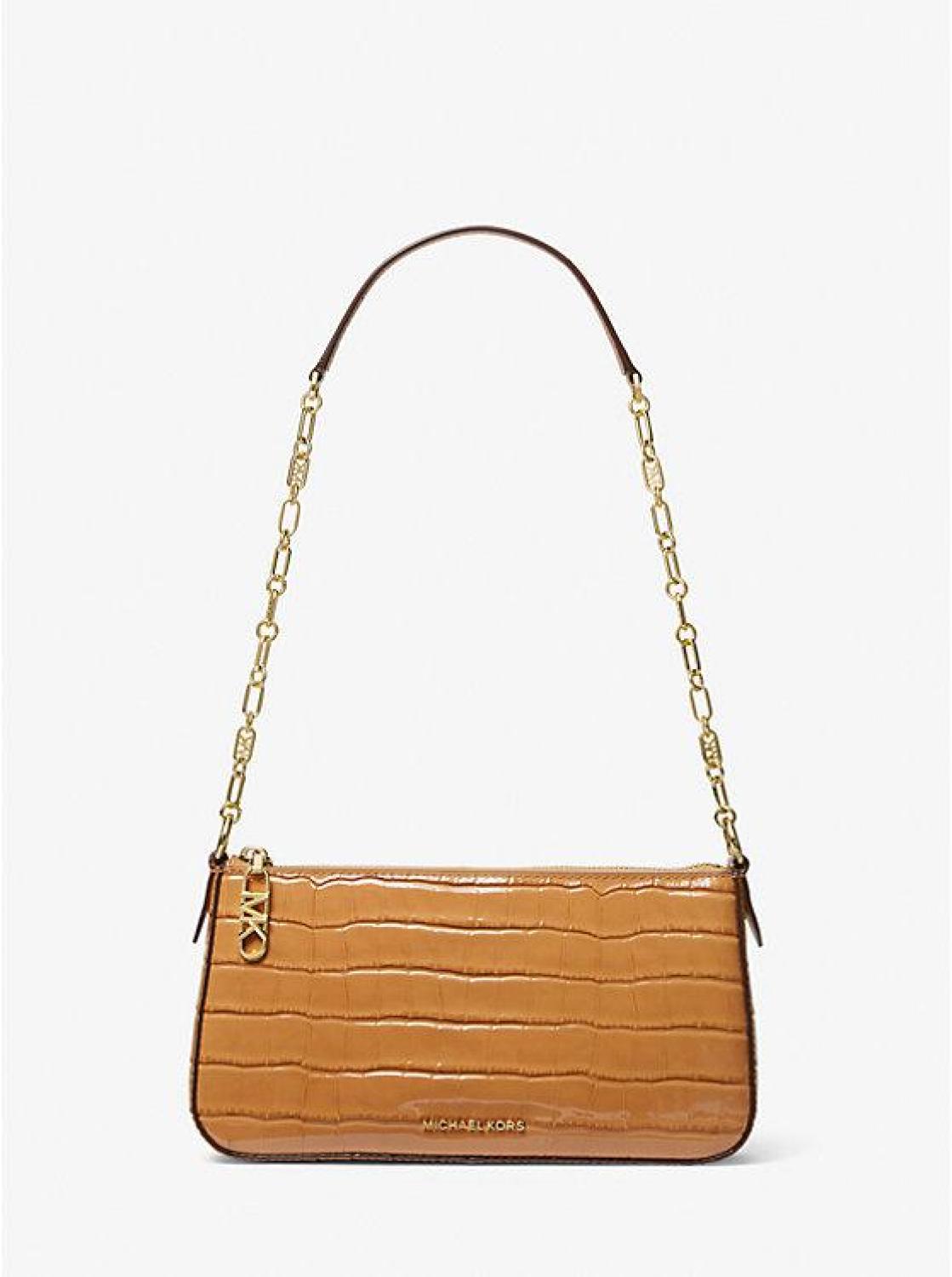 • The Empire pochette bag is an everyday essential—and the epitome of timeless sophistication. Made from crocodile embossed leather with a patent finish, the compact silhouette fits your phone, cardholder, sunglasses and a little extra. Match the rest of your accessories to the gold-tone chain strap.
