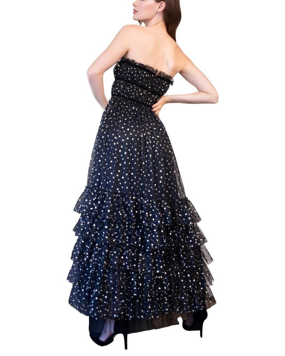 Introducing the stunning Eva Franco Graciela Dress, a show-stopping piece from the renowned Eva Franco brand. This gorgeous dress falls approximately 58 inches from shoulder to hem, with a striking Silver Star color/pattern that is sure to turn heads. The design details include a strapless silhouette, maxi length, and tiered layers for a truly elegant look. The back zipper ensures a perfect fit, while the 100% polyester material and lining make for a comfortable wear. This dress is made in the USA and should be dry cleaned only. Elevate your wardrobe with the Eva Franco Graciela Dress for a fashion-forward statement at any event.