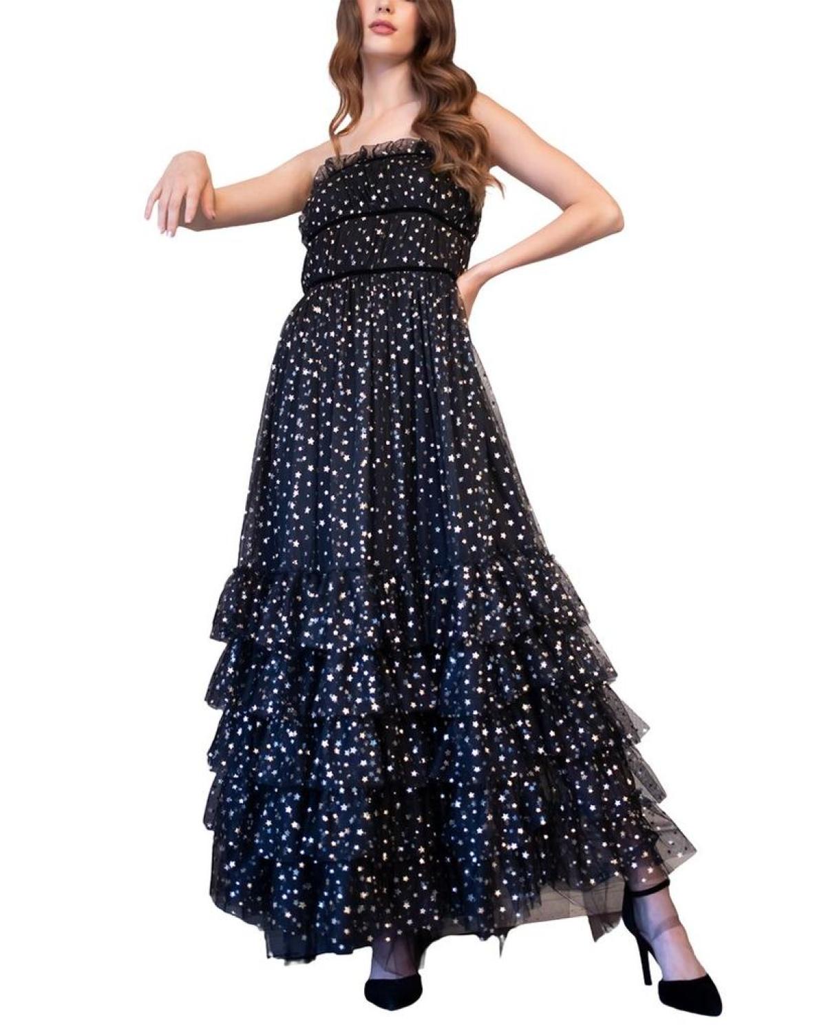 • Introducing the stunning Eva Franco Graciela Dress, a show-stopping piece from the renowned Eva Franco brand. This gorgeous dress falls approximately 58 inches from shoulder to hem, with a striking Silver Star color/pattern that is sure to turn heads. The design details include a strapless silhouette, maxi length, and tiered layers for a truly elegant look. The back zipper ensures a perfect fit, while the 100% polyester material and lining make for a comfortable wear. This dress is made in the USA and should be dry cleaned only. Elevate your wardrobe with the Eva Franco Graciela Dress for a fashion-forward statement at any event.