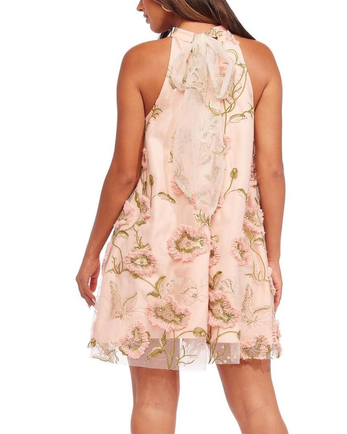• Introducing the stunning Eva Franco Henriette Dress in the delightful Sweetunia color/pattern! This swing silhouette dress features a 3-D floral mesh overlay, halter neck, and a mini length for a fun and flirty look. The tie-back closure adds a touch of elegance, while the 100% polyester material ensures a comfortable fit. This dress is lined with 100% polyester and should be dry cleaned only to maintain its quality. Made in the USA, this Eva Franco dress is a must-have for any special occasion or evening event.