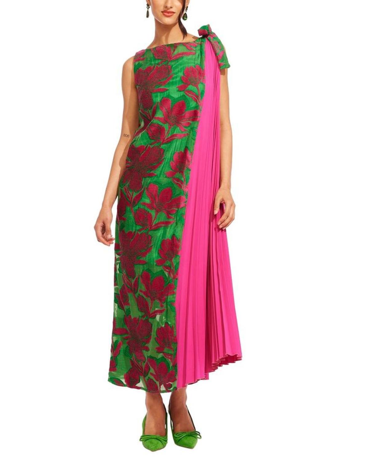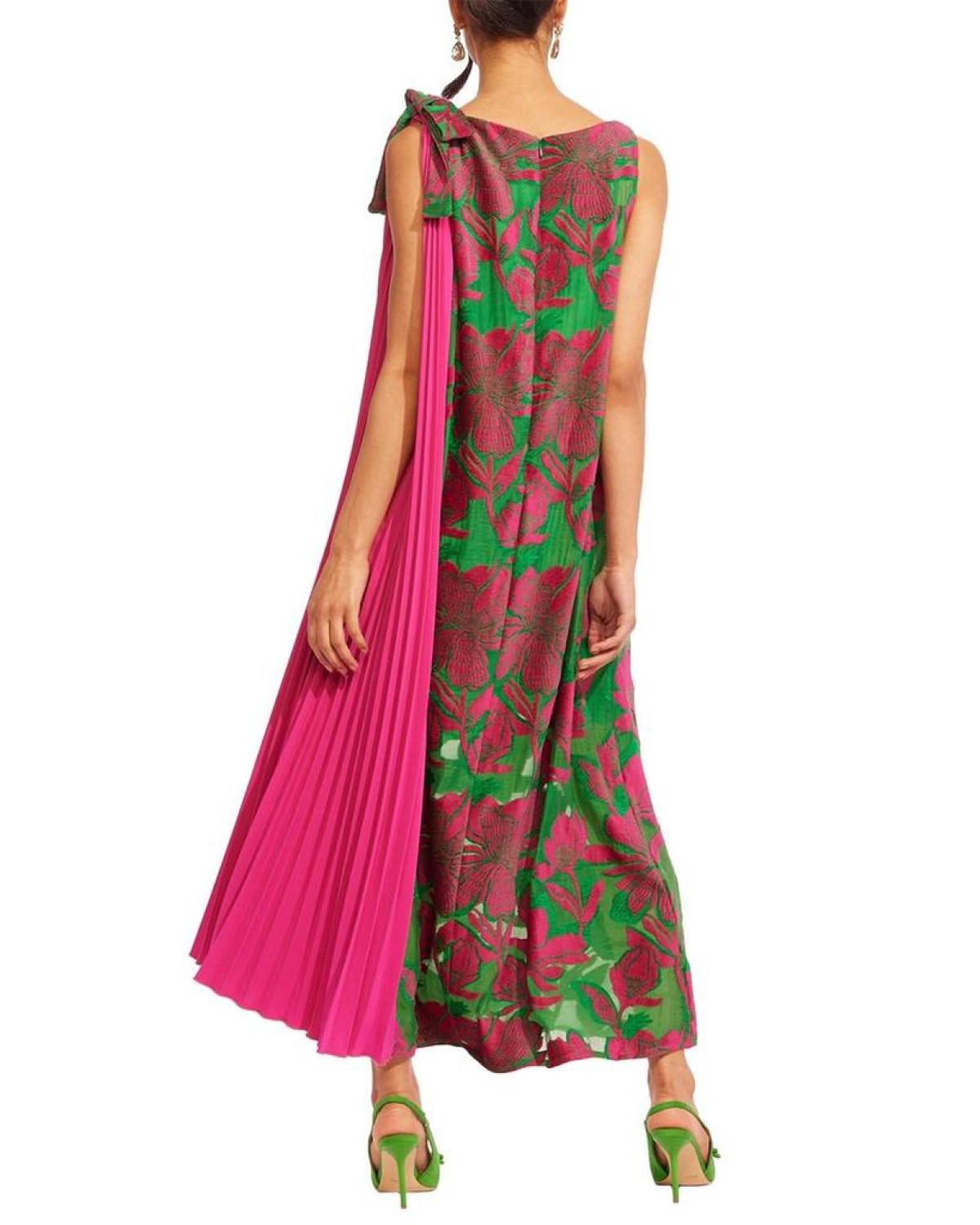 • Introducing the stunning Eva Franco Savante Dress in the vibrant Chemile Bloom color/pattern. This maxi dress features a sleeveless design with side pleats and a bow-tie shoulder detail for a touch of elegance. The dress is approximately 56 inches from shoulder to hem and has a back zipper for easy wear. Made in the USA, this dress is crafted from 48% polyester, 37% viscose, 13% nylon, and 2% elastane with a 100% polyester lining. Perfect for any special occasion, this dress is machine washable for easy care. Elevate your wardrobe with this beautiful and stylish piece from Eva Franco.