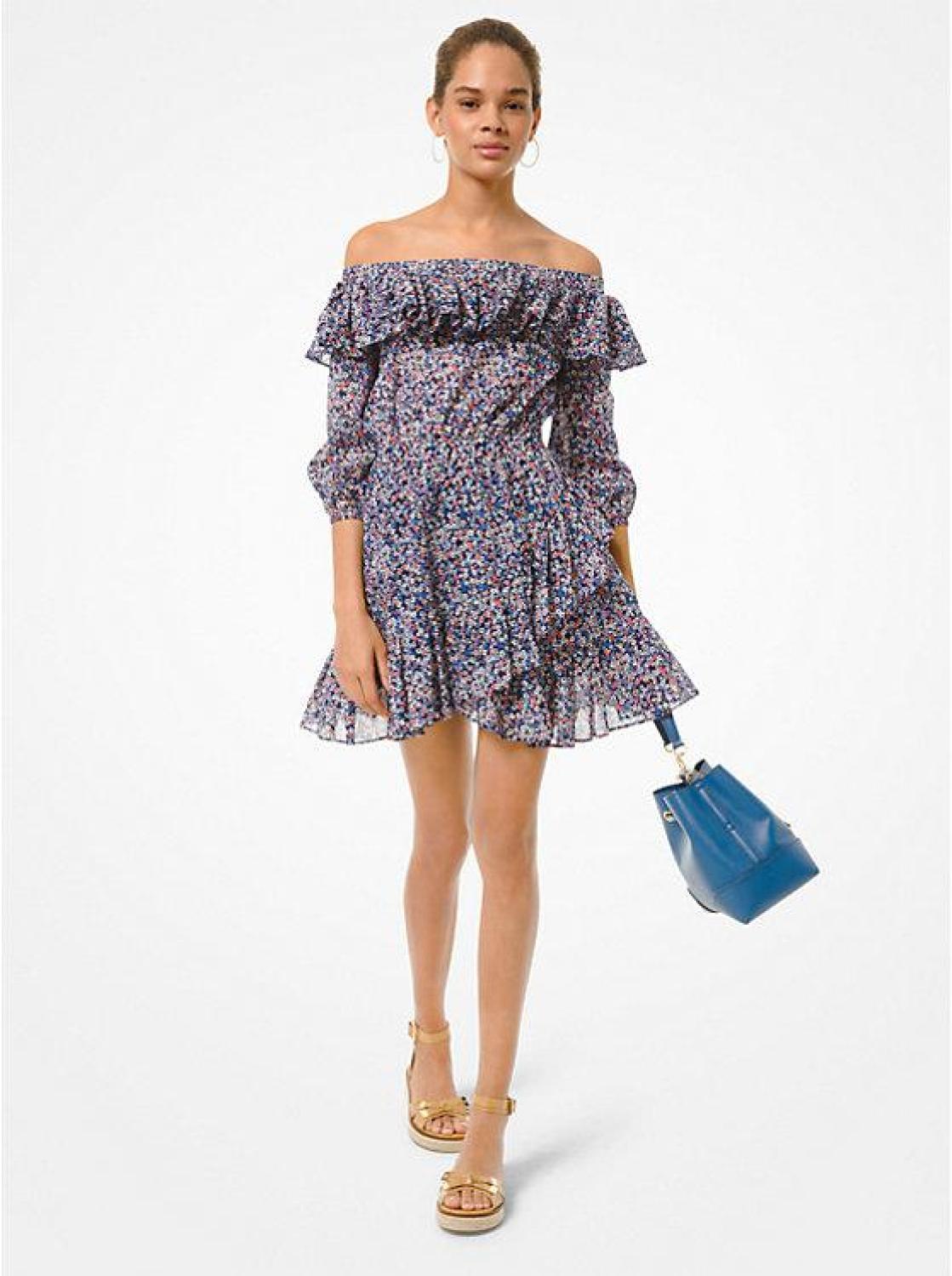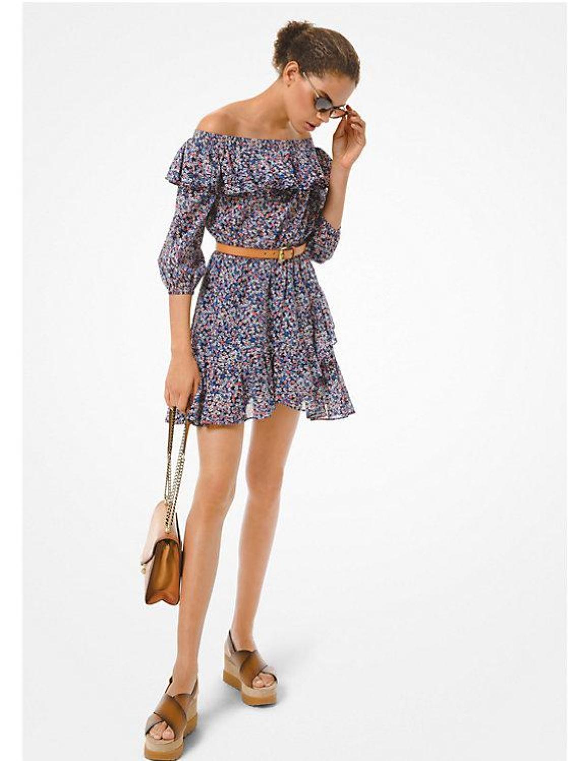 • Bohemian style meets warm-weather chic. Crafted from a luxe and lightweight floral cotton lawn, this mini dress is designed in an off-the-shoulder silhouette with ruffled trim. We love it styled with boots or grounded with sandals.