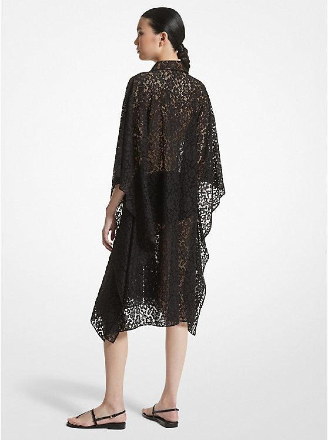 • Intricate floral lace detailing gives this caftan—part of our Spring/Summer 2024 lineup—a romantic sensibility. It’s cut in a relaxed, boxy silhouette with a sheer finish. Style it with a bikini and sandals poolside, or layer it over a bralette and briefs for a daring nighttime look. Made in Italy.