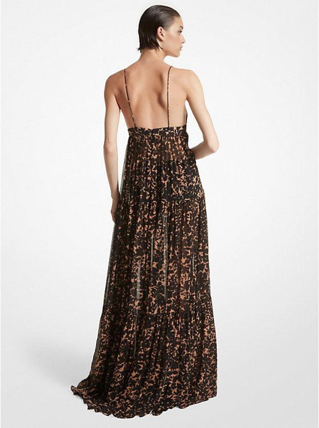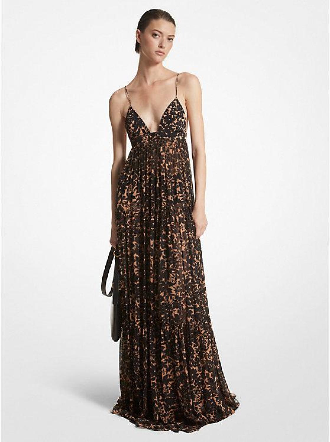 Imbued with a romantic sensibility, this dress unites a striking floral print with delicate organic crepe de chine. A plunging neckline and flattering empire waist draw attention to the bodice, while a tiered hem lends movement to the floor-sweeping silhouette. Balance the eye-catching motif with a sleek leather handbag and sandals.