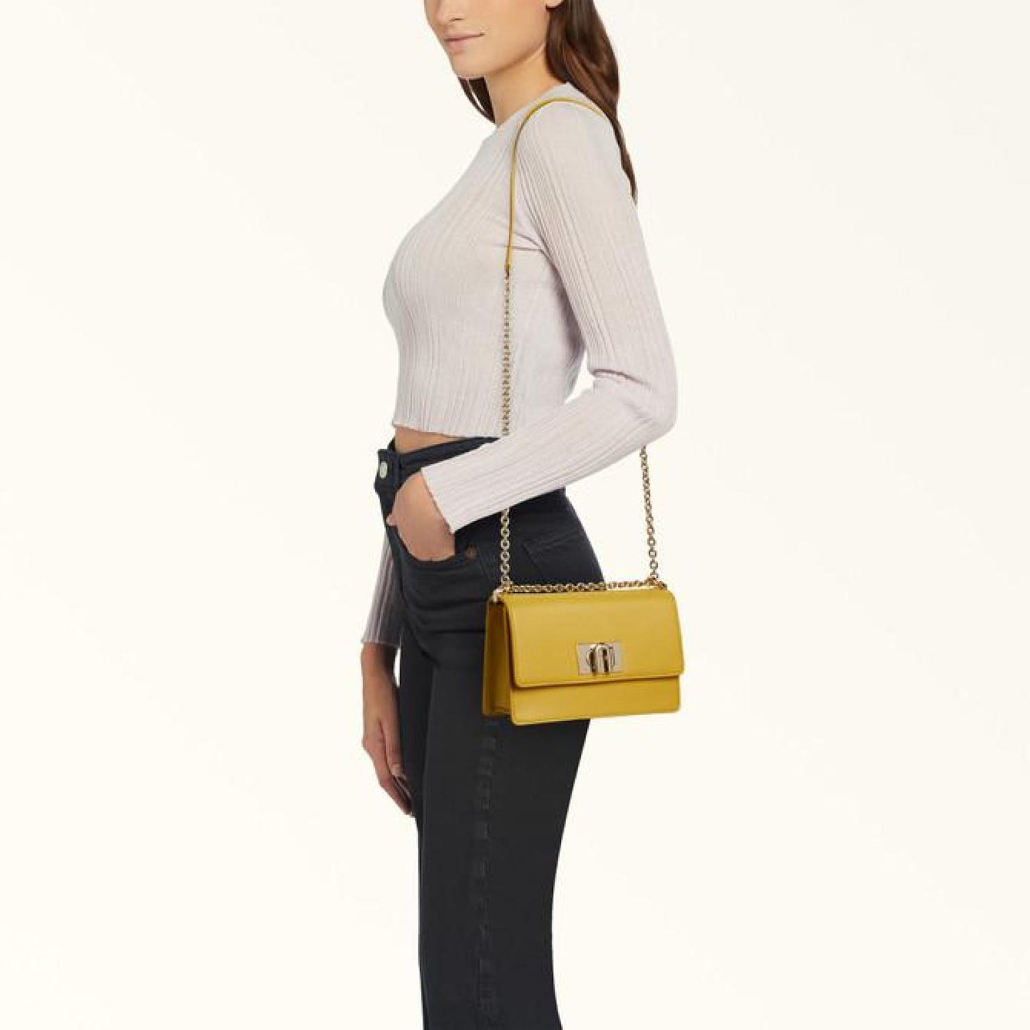 • The Furla 1927 mini crossbody bag is made of elegant textured leather with leather strap featuring chain inserts. Perfect to wear also as a shoulder bag; it is characterised by the metal turnstile closure with Furla logo; which makes it practical and functional.