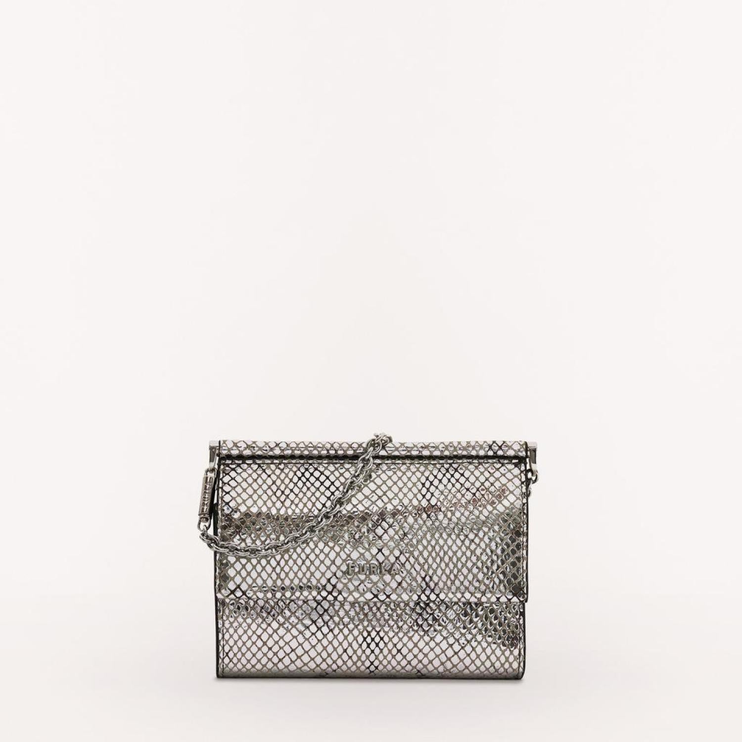 - Furla Ninfa is a compact wallet made in printed calfskin with metallic python finishes. The accessory features a metal chain shoulder strap removable on one side, so it can also be worn as a crossbody. Its several inner compartments allow you to better organise your credit cards, documents and banknotes. - Flap and press-stud closure- Eight inner card slots- Two side pockets- One large inner compartment for banknotes and receipts- One zip pocket on the back- Mini metal Furla logo punched on the front- Palladium finishes