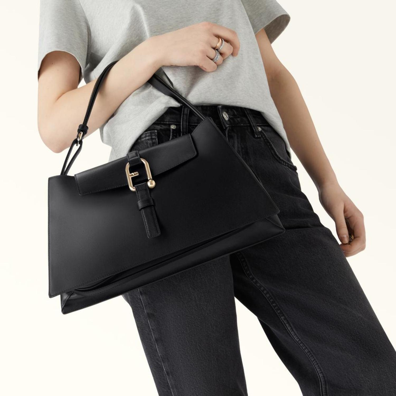 This spacious and roomy piece boasts geometric lines that make a real style statement, crafted in luxurious leather. The Furla Nuvola shoulder bag is designed to hold everything you might need throughout the day, and for an elegant touch, it is finished with a flap closure embellished with the new interpretation of Arcosfera hardware, which brings the iconic Furla Arch logo together with the original round element of the brand.