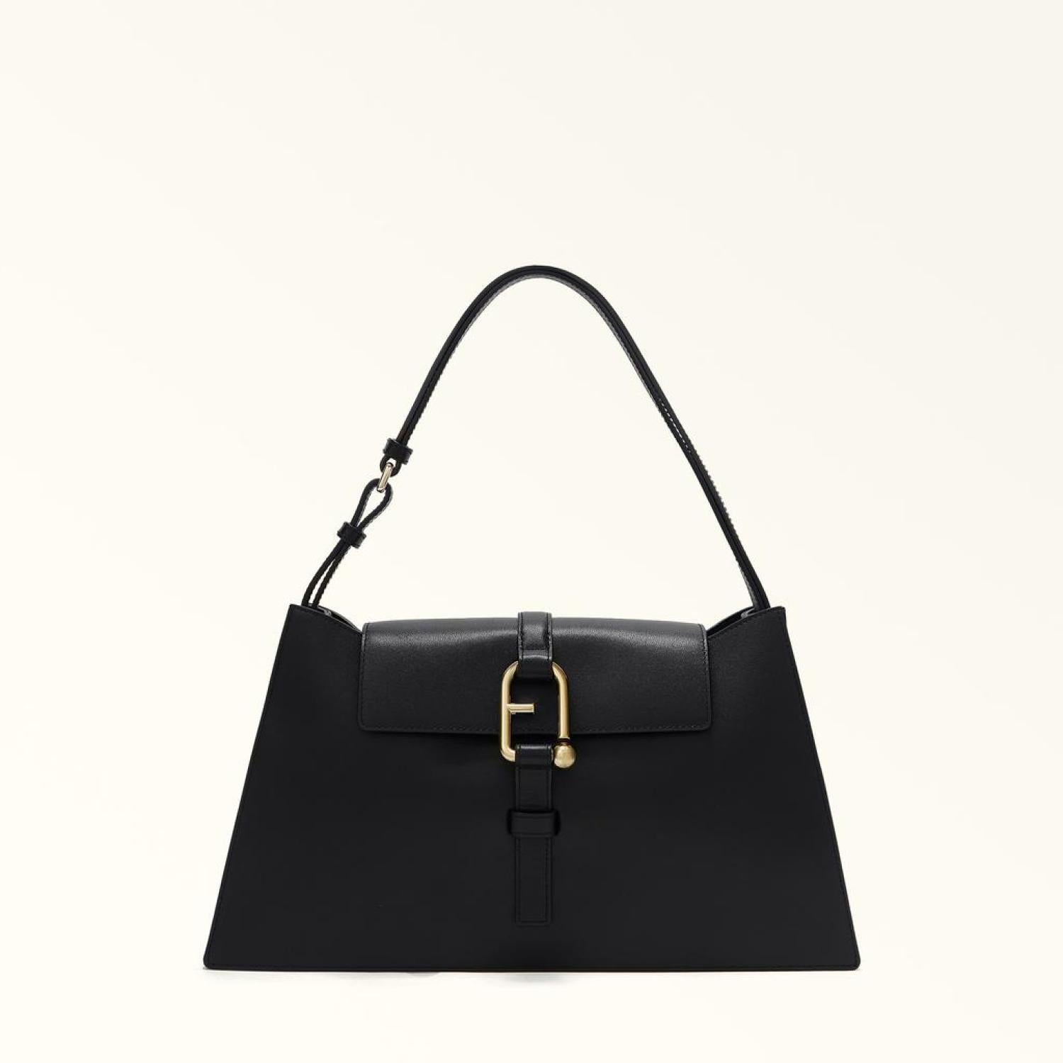 • This spacious and roomy piece boasts geometric lines that make a real style statement, crafted in luxurious leather. The Furla Nuvola shoulder bag is designed to hold everything you might need throughout the day, and for an elegant touch, it is finished with a flap closure embellished with the new interpretation of Arcosfera hardware, which brings the iconic Furla Arch logo together with the original round element of the brand.