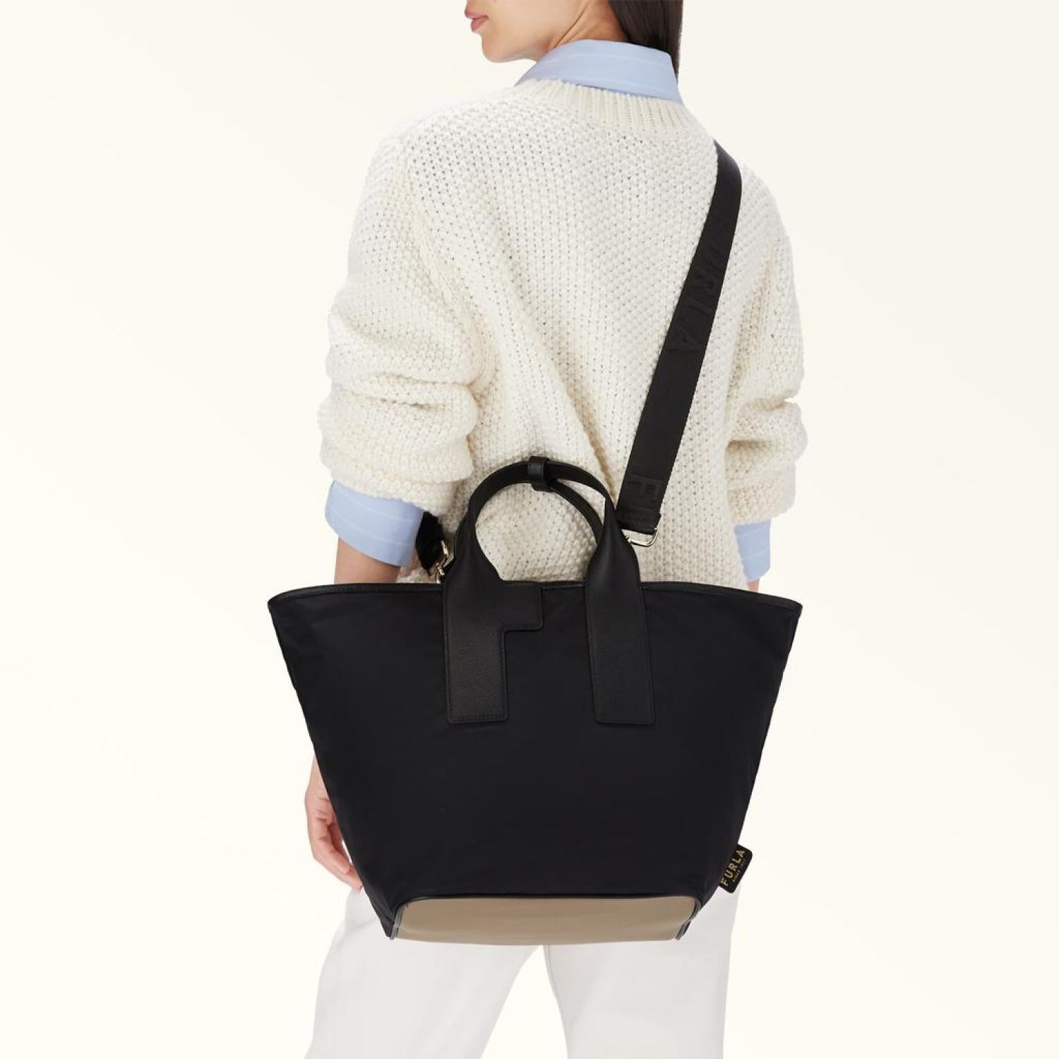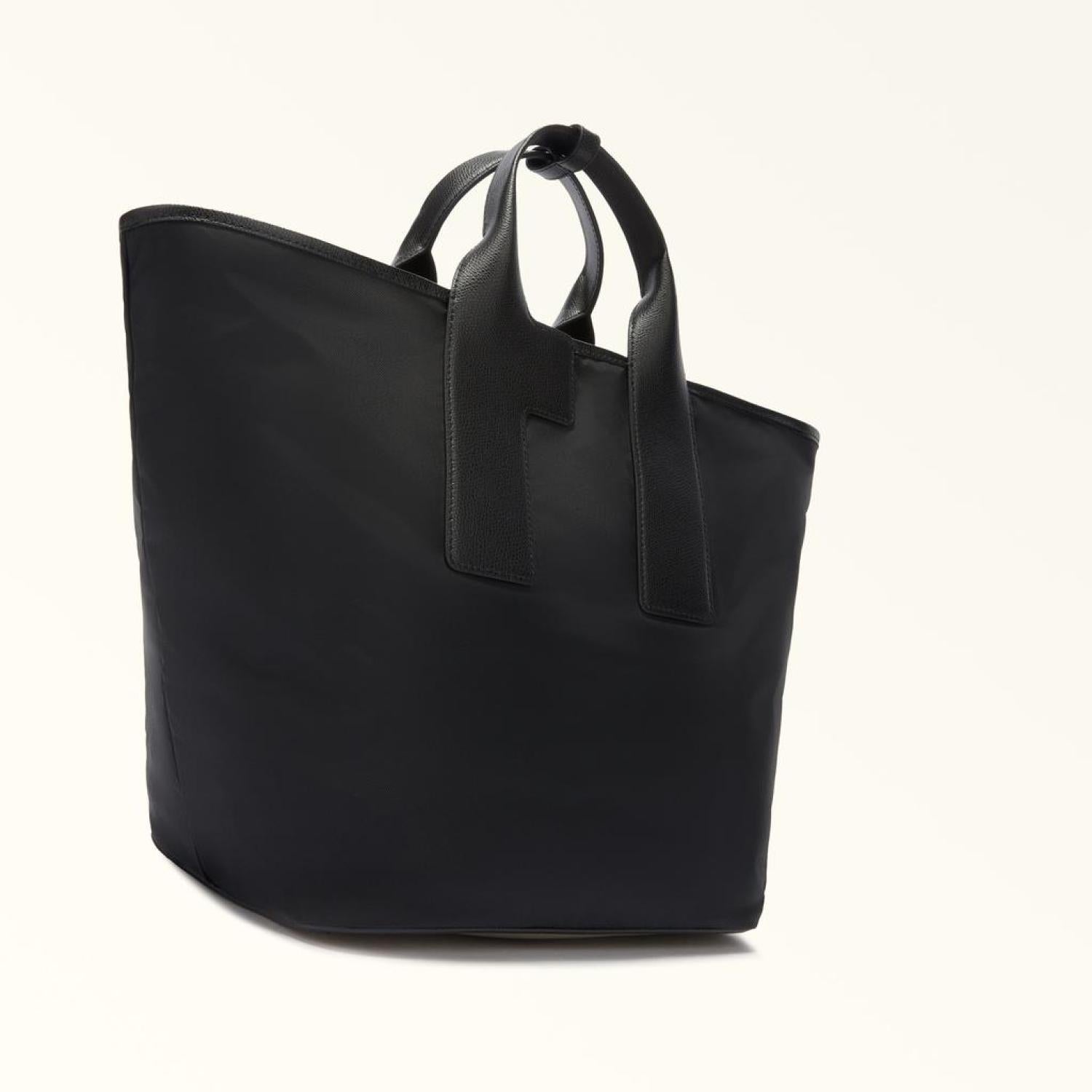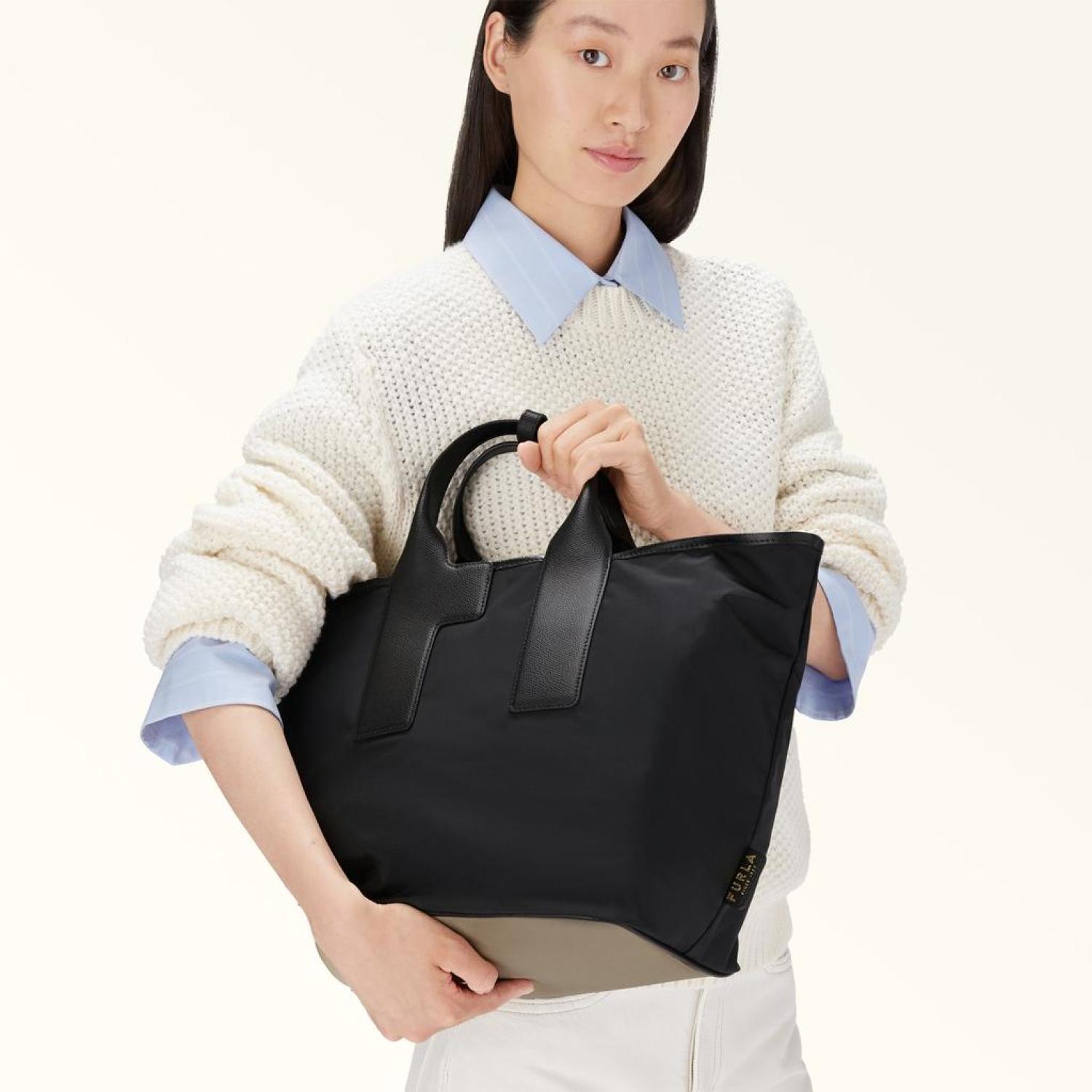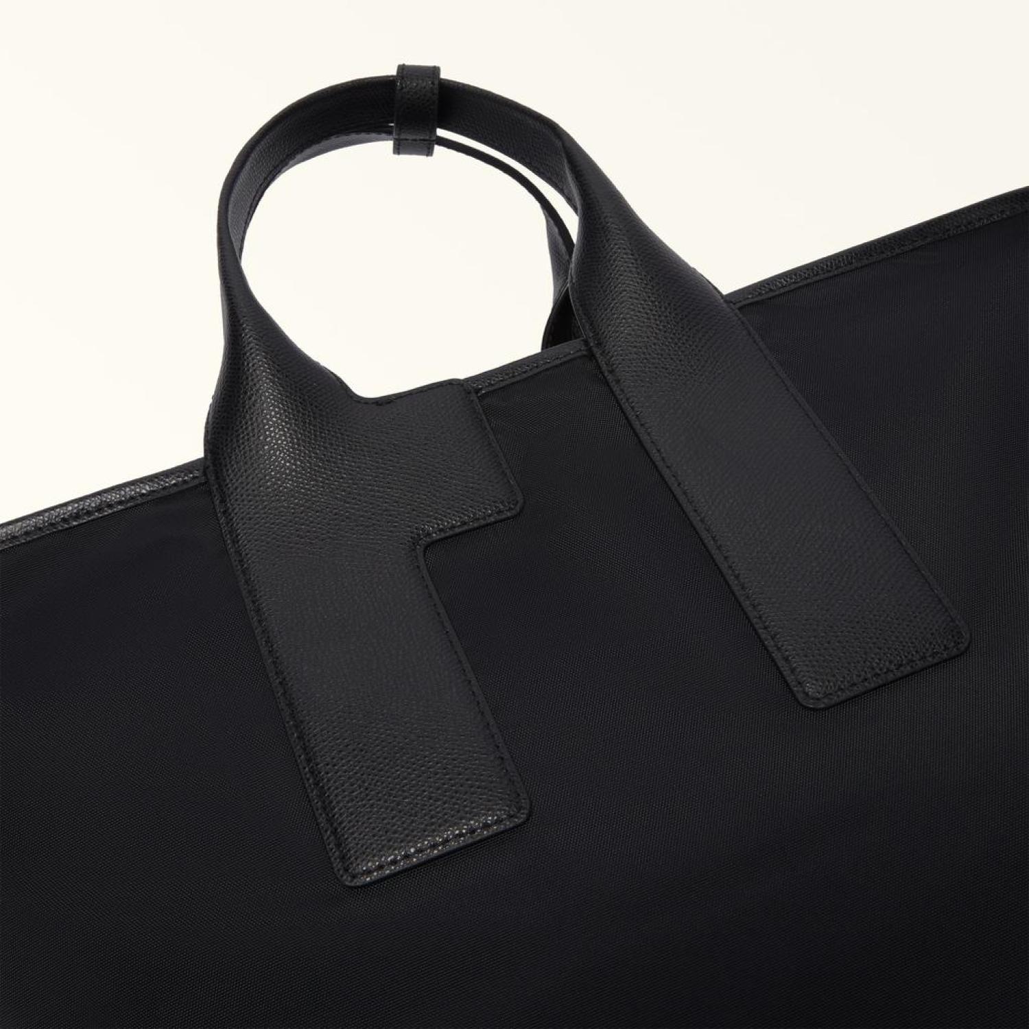 Soft, spacious and lightweight, the Furla Piuma tote bag is the epitome of versatility. Made of recycled nylon, its printed leather handles – in the shape of the brand's iconic Arch logo – create an elegant colour-block effect. It makes both a practical handbag for your trips to town and an ideal travel companion, featuring a press-stud tab for attaching it to your suitcase with ease.