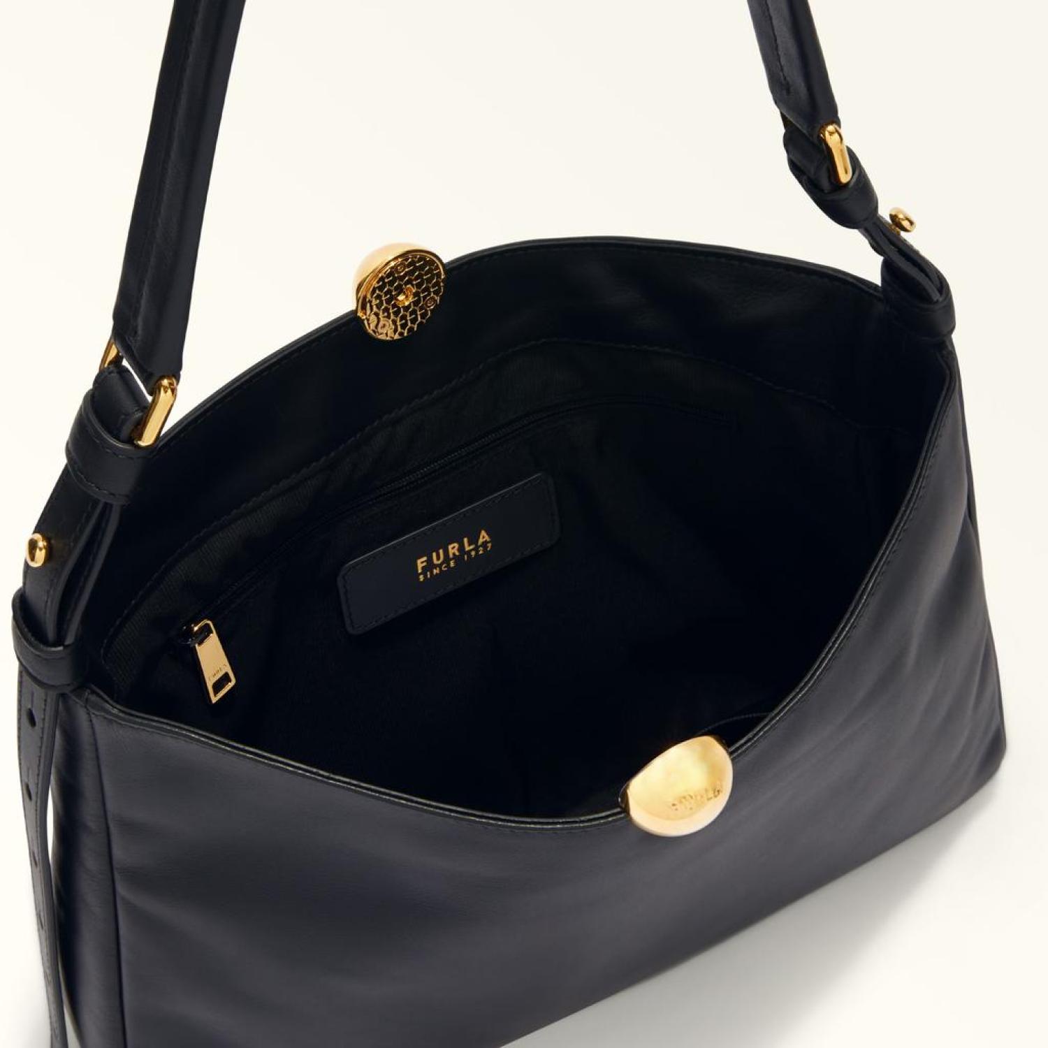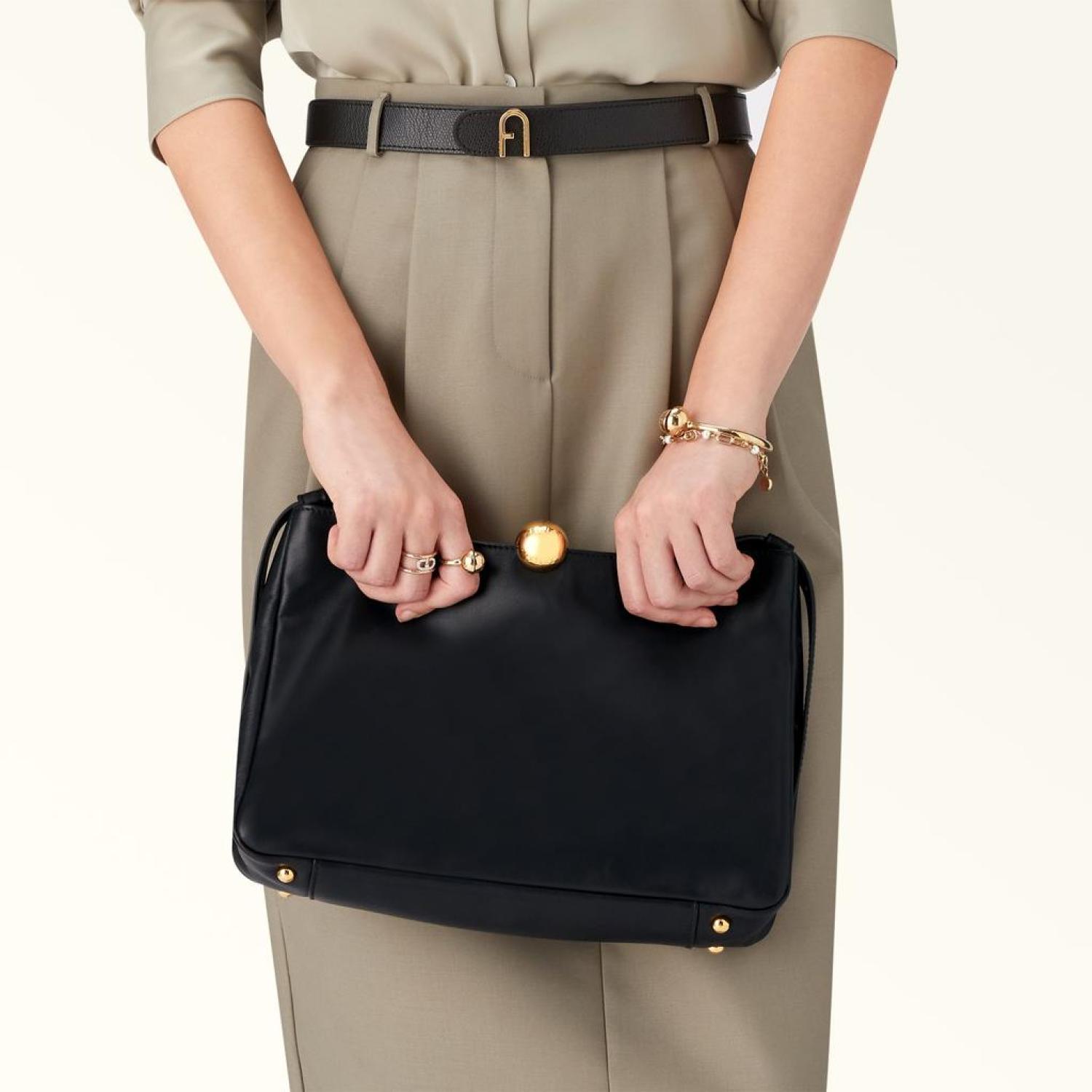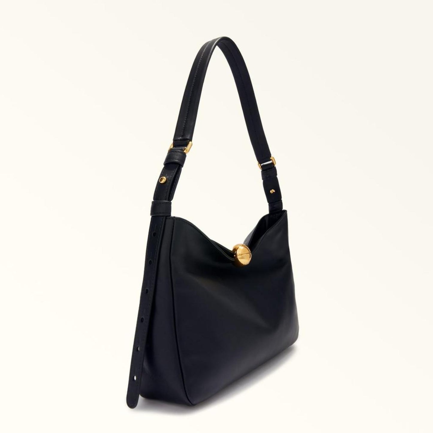 • A contemporary piece boasting soft lines and a destructured shape, this Furla Sfera Soft bag has an adjustable handle and compact volume, making it ideal for wearing on the shoulder. Styled in soft padded nappa leather, the bag elegantly fastens with a magnetic closure which creates a natural draping effect, and is embellished with round Sfera hardware.