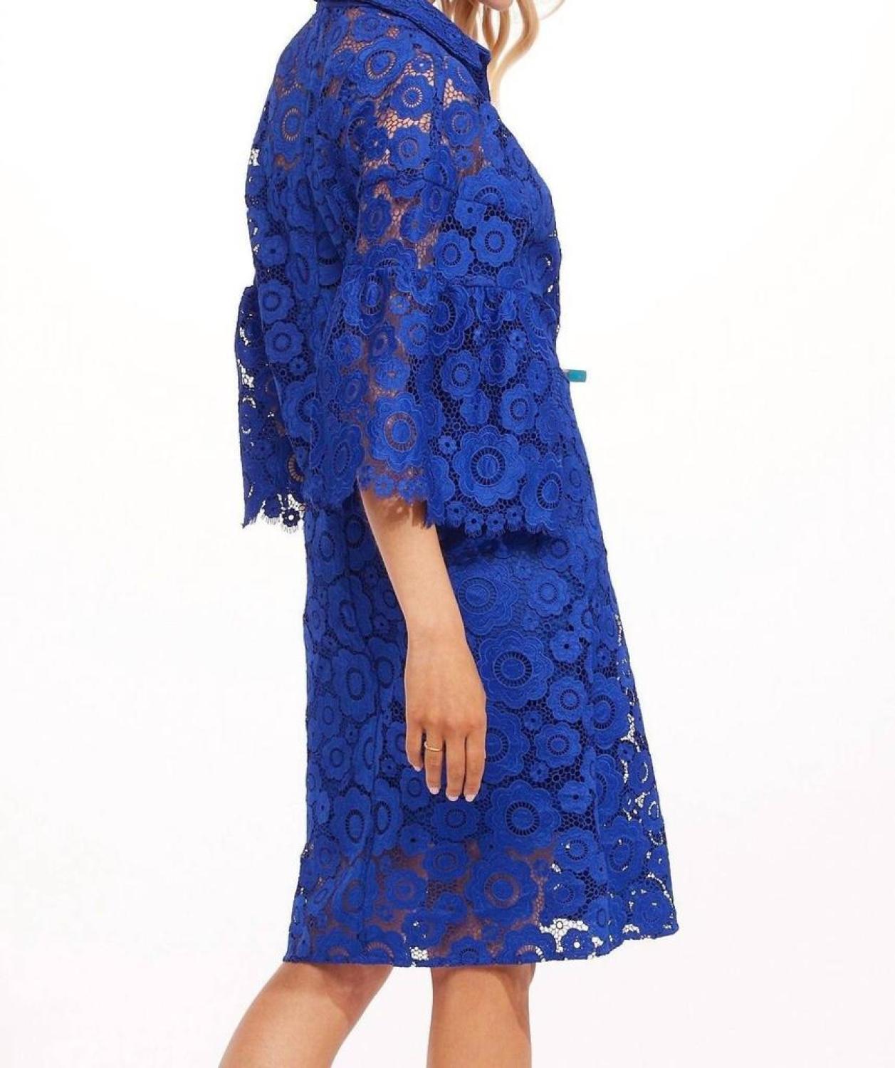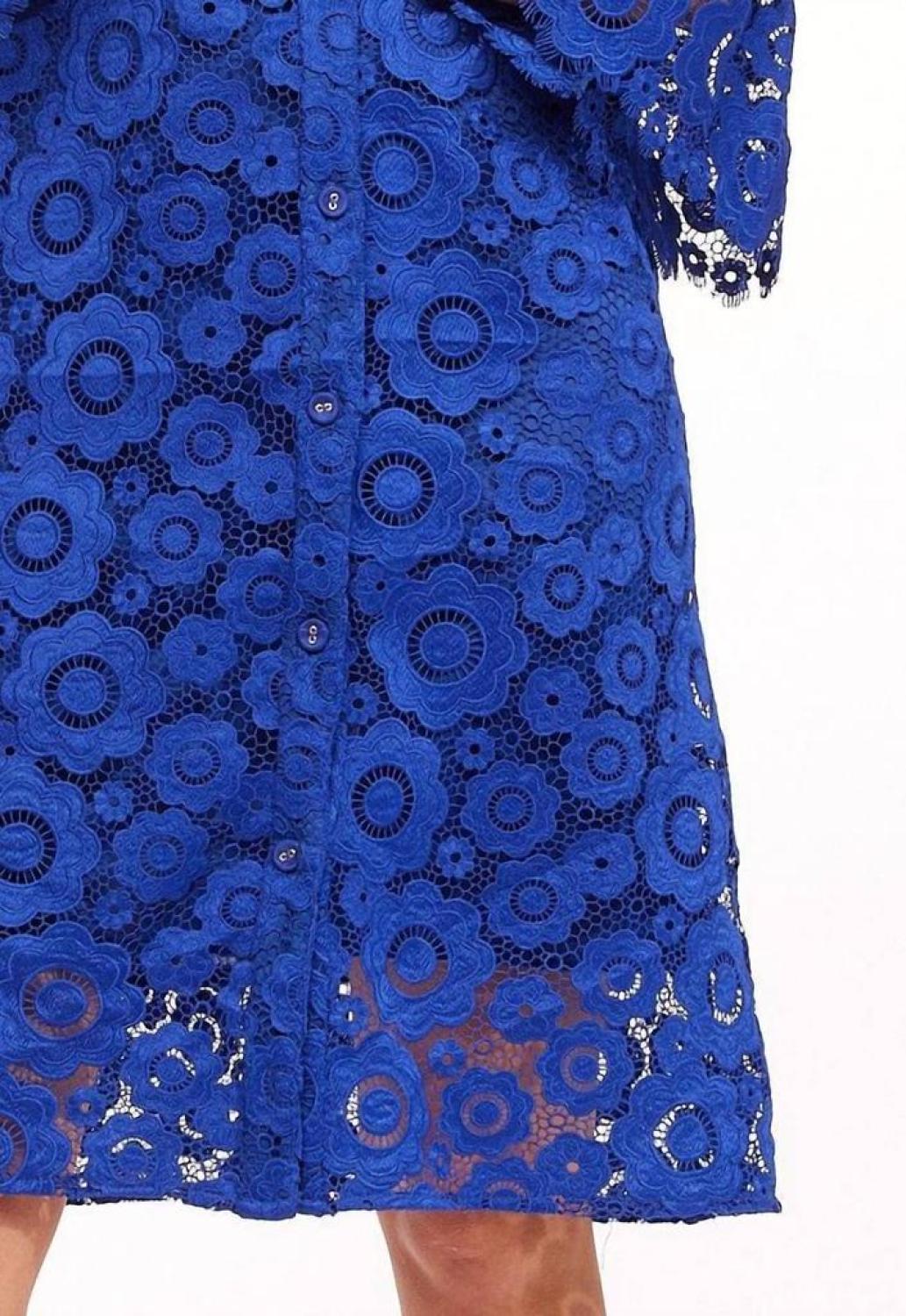 • Just add slides or mules and you are good to go.The Gaia midi dress is a mid-length shirt dress with elbow-length ruffled sleeves and in a blue lace fabric. The dress comes with a full slip with spaghetti straps. Embroidered lace detail. Midi length. Ruffled sleeves. Collared. Button up.