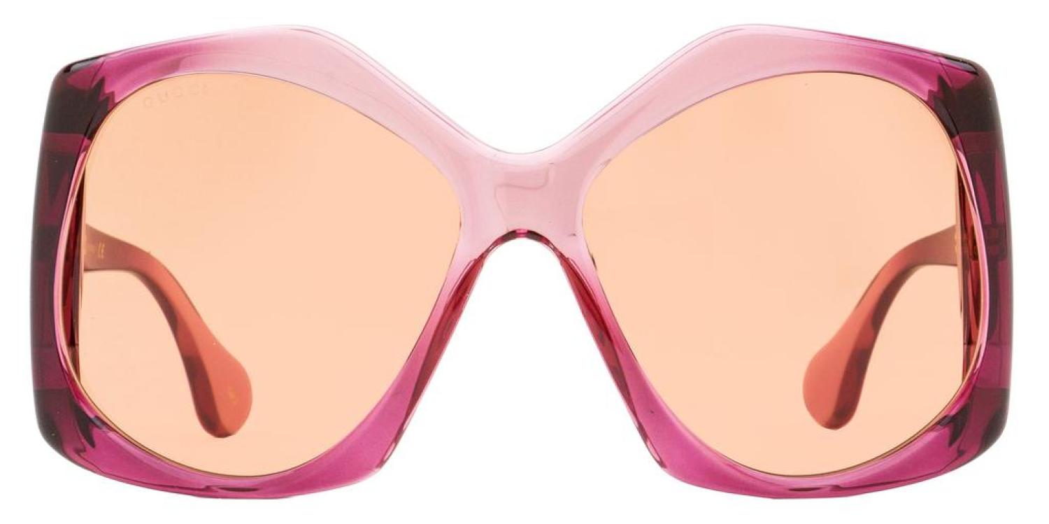 The Gucci GG0875 Sunglasses feature a large butterfly shape with the Gucci Fork concept for women. The light injected plastic frame features the interlocking GG logo on both temples. Crafted of the highest quality materials, Gucci's world renowned brand and bold designs have made their Sunglasses exceptionally desirable. Providing 100% UV protection from the suns harmful rays these sunglasses are functional in addition to being fashionable. Frame Material - Plastic (Injected) Frame Color - Burgundy Gradient/Gold Lens Color - Orange Size - 62-16-120 Made in Italy Includes original case and cloth