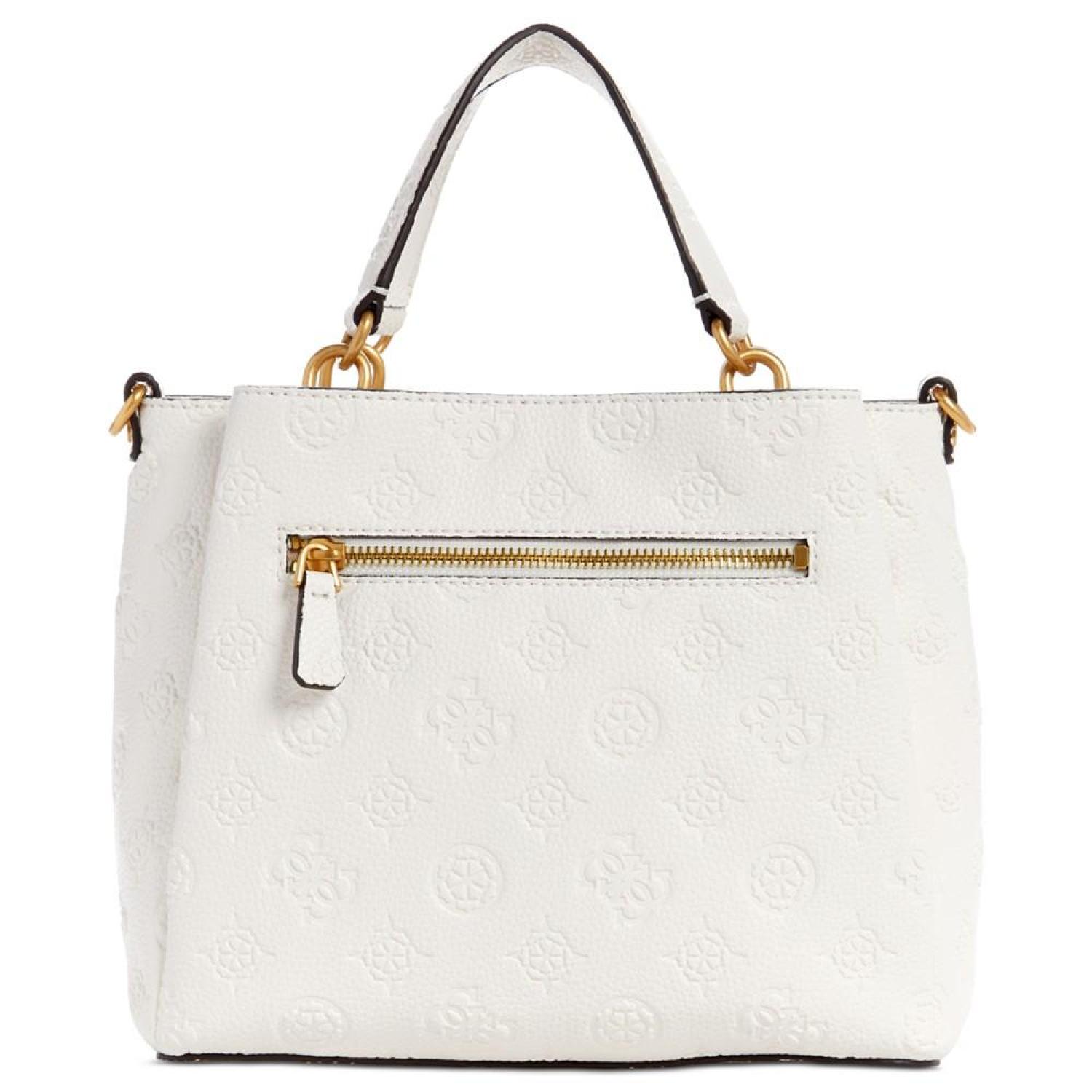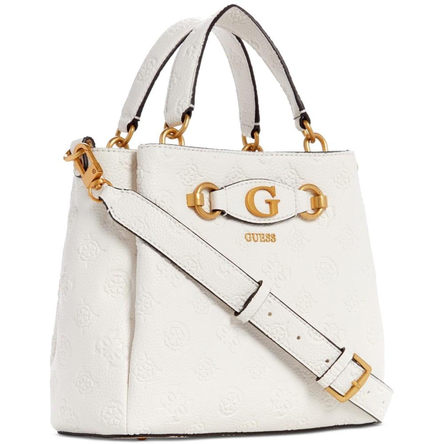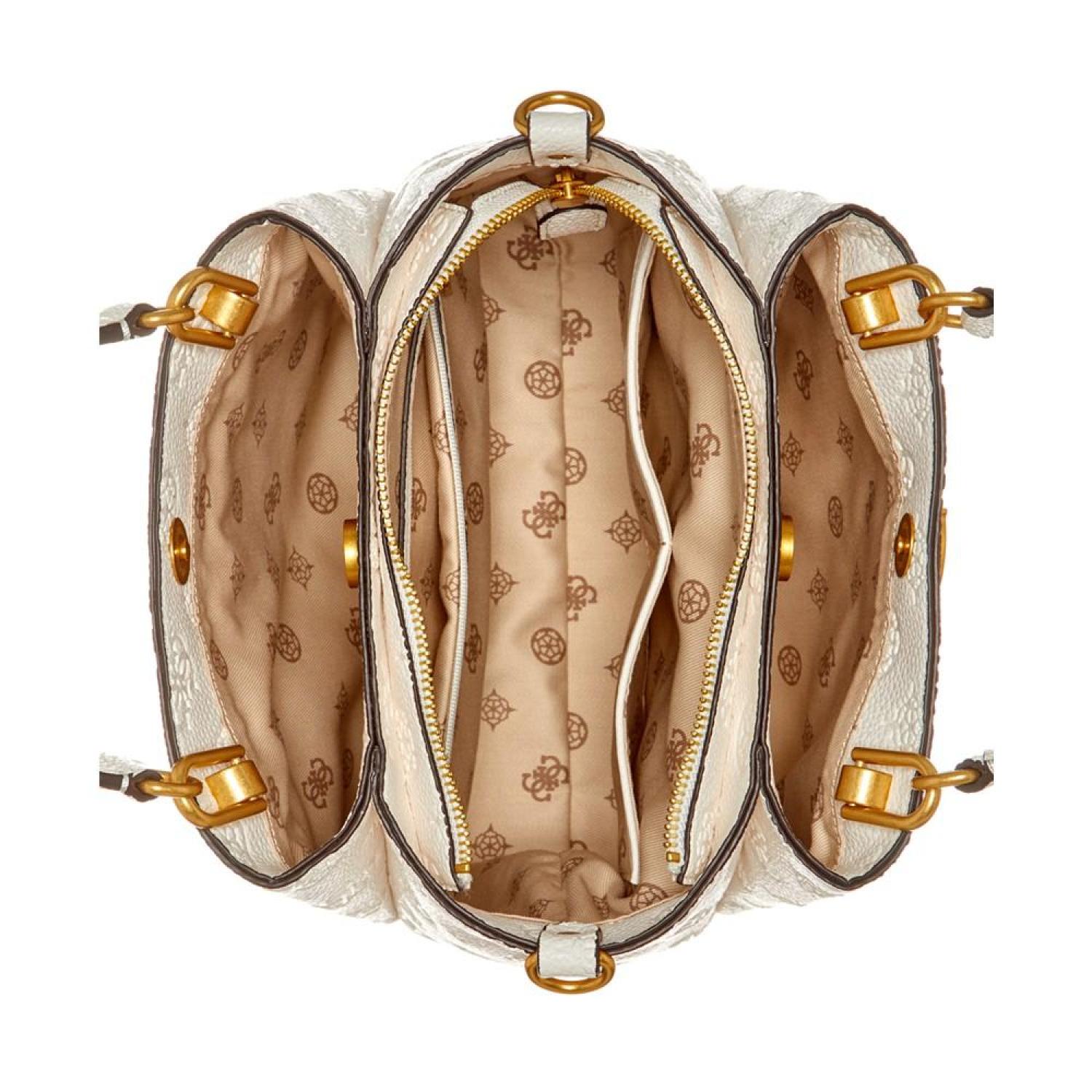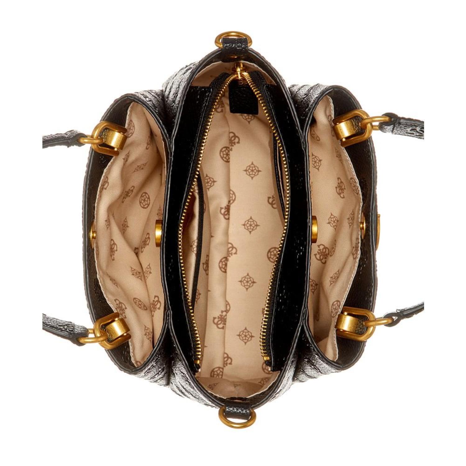 Beautifully accented with antique gold-tone hardware and logo, this satchel by GUESS opens up to a dream interior with three compartments to keep you organized. Small sized bag; 9-3/4"W x 8-1/4"H x 4"D (width is measured across the bottom of handbag); 1.54 lbs. approx. weight Silhouette is based off 5'9" model 4"L top handle; 21-1/4"L adjustable, removable strap Zip & snap closure Antique gold-tone hardware, exterior back zip pocket & metal logo Triple compartment interior with center zip compartment & zip & slip pockets Polyurethane Spot clean Imported