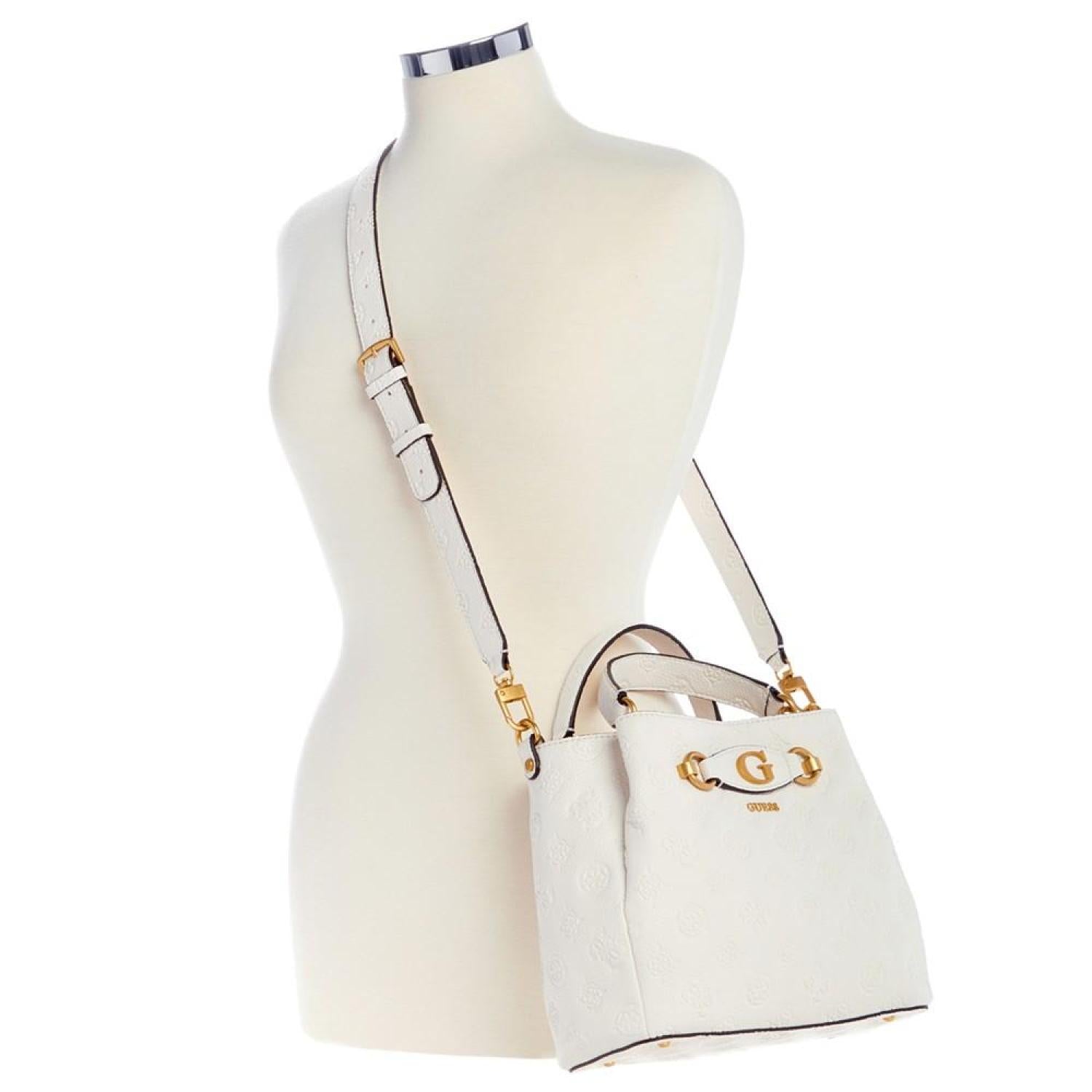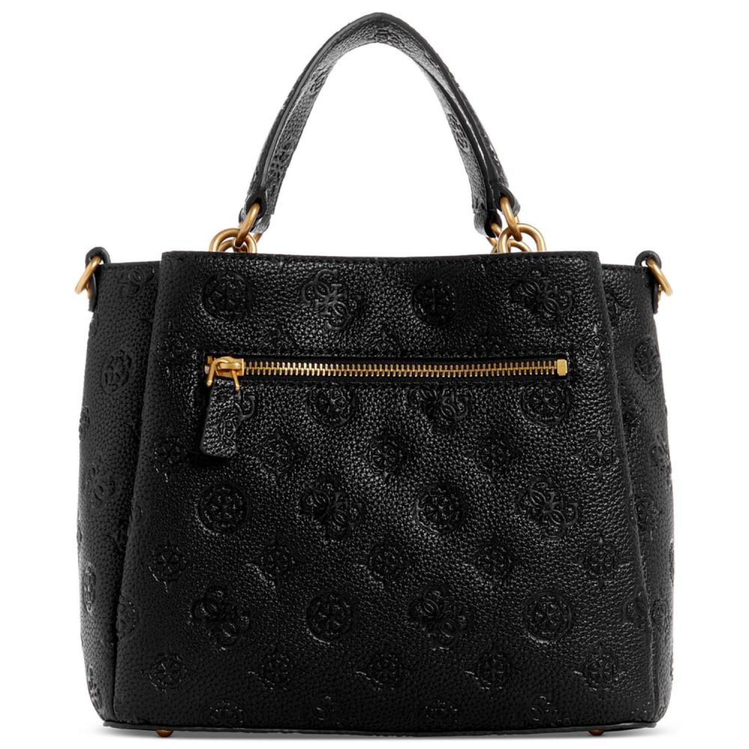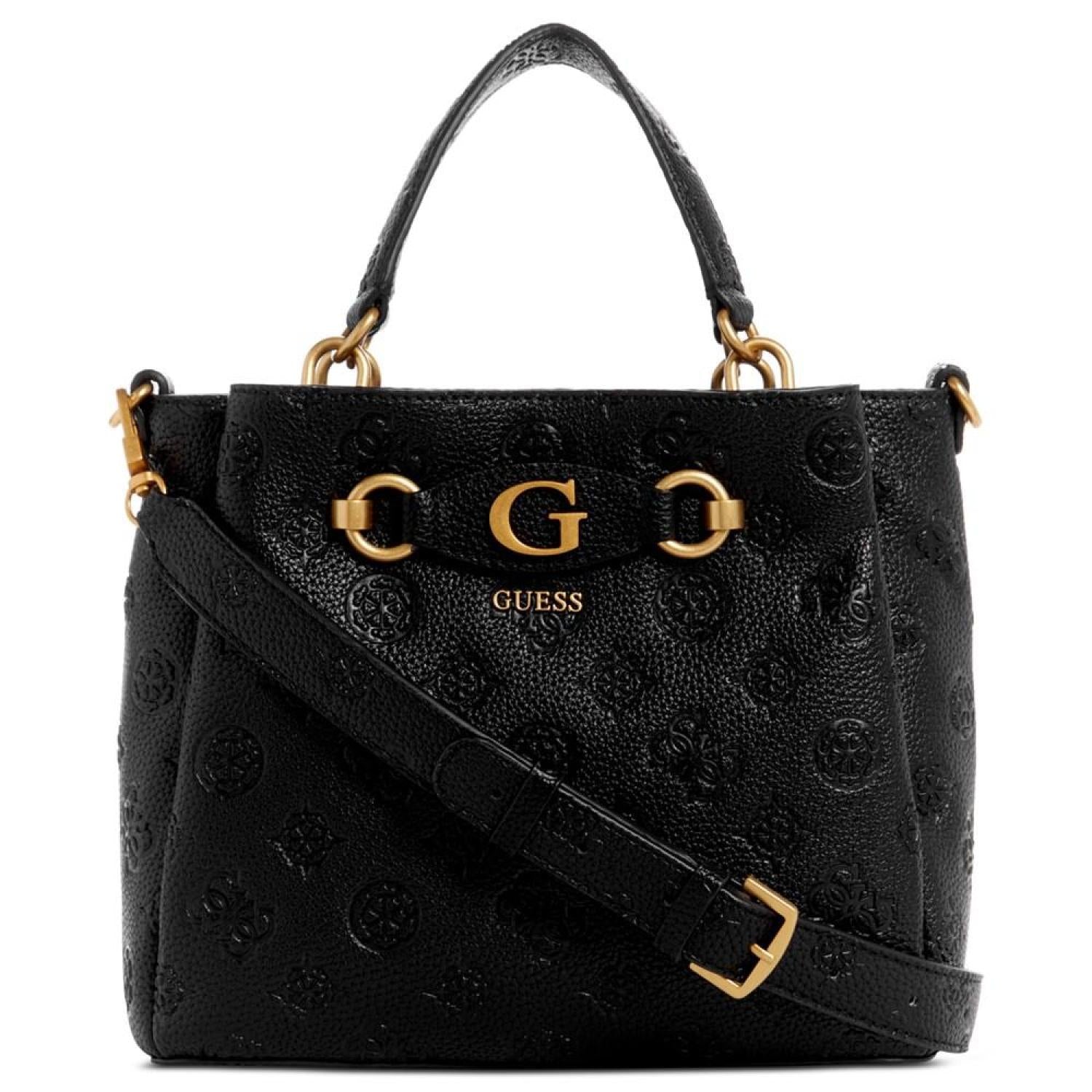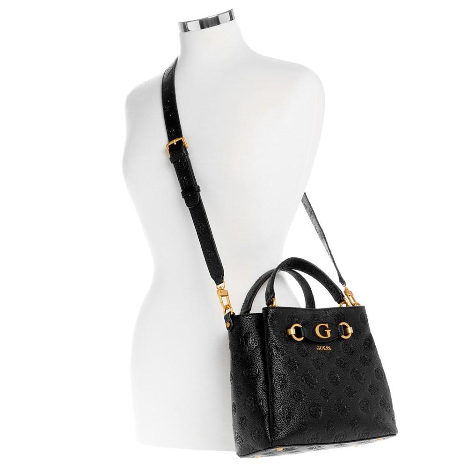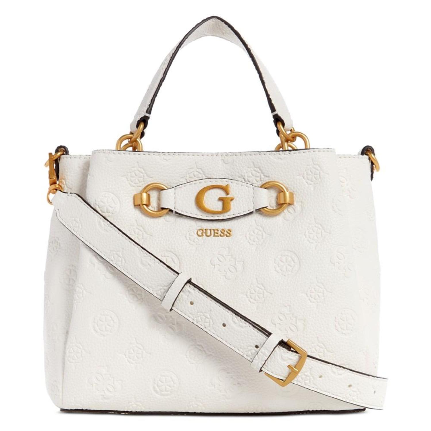 Beautifully accented with antique gold-tone hardware and logo, this satchel by GUESS opens up to a dream interior with three compartments to keep you organized. Small sized bag; 9-3/4"W x 8-1/4"H x 4"D (width is measured across the bottom of handbag); 1.54 lbs. approx. weight Silhouette is based off 5'9" model 4"L top handle; 21-1/4"L adjustable, removable strap Zip & snap closure Antique gold-tone hardware, exterior back zip pocket & metal logo Triple compartment interior with center zip compartment & zip & slip pockets Polyurethane Spot clean Imported