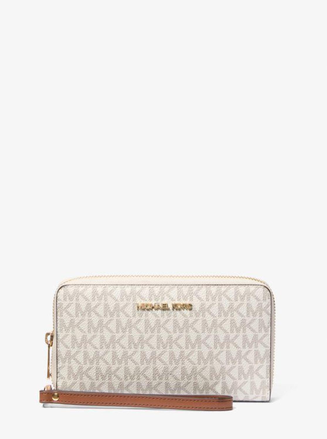 A compact accessory with maximum style, this sleek wristlet is made for days that require on-the-go ease. Crafted from Signature Logo print, the slim silhouette unzips to reveal multiple card slots and a compartment for your smartphone. Slip it into the coordinating tote or carry it solo by the wrist strap.