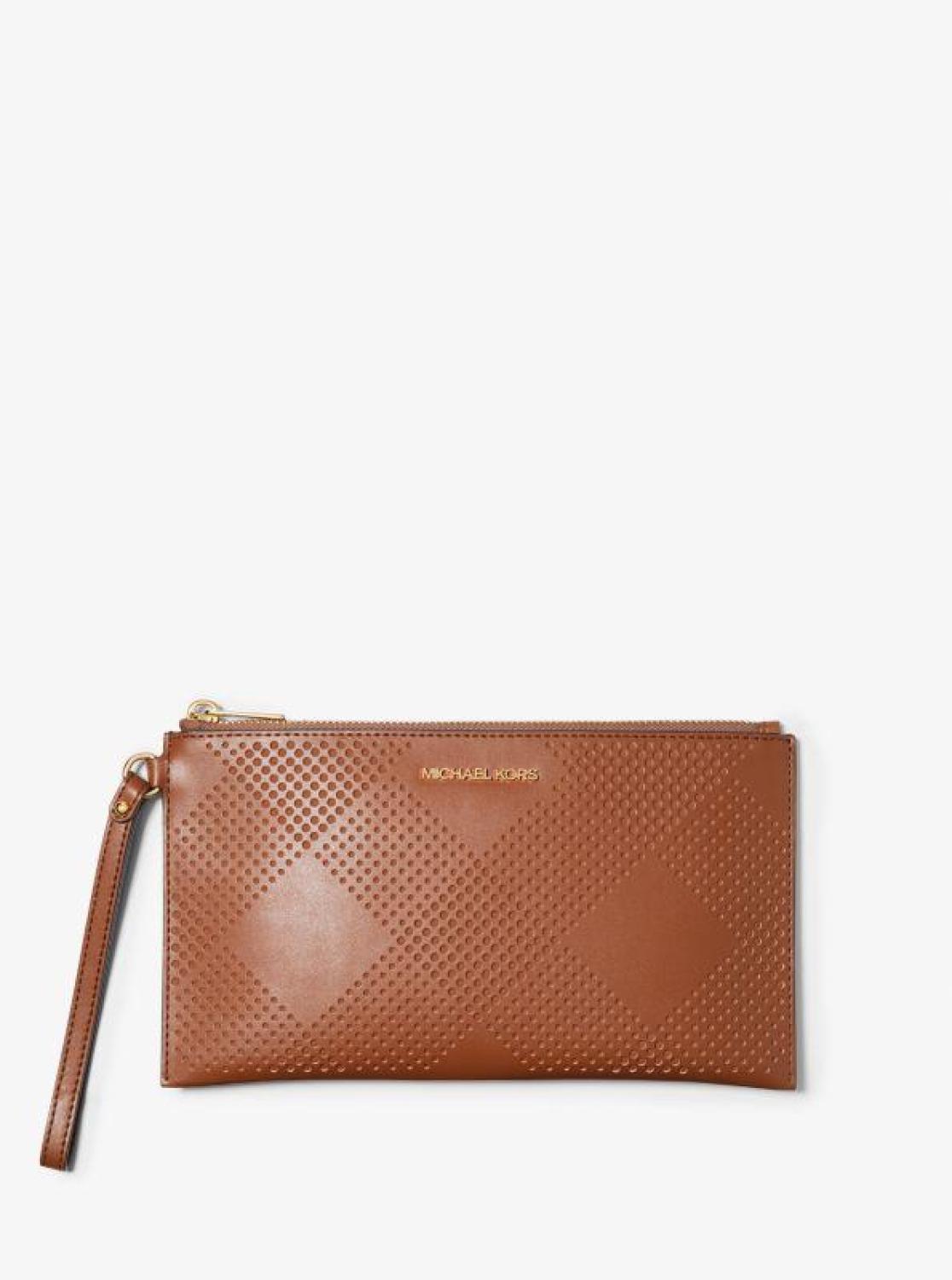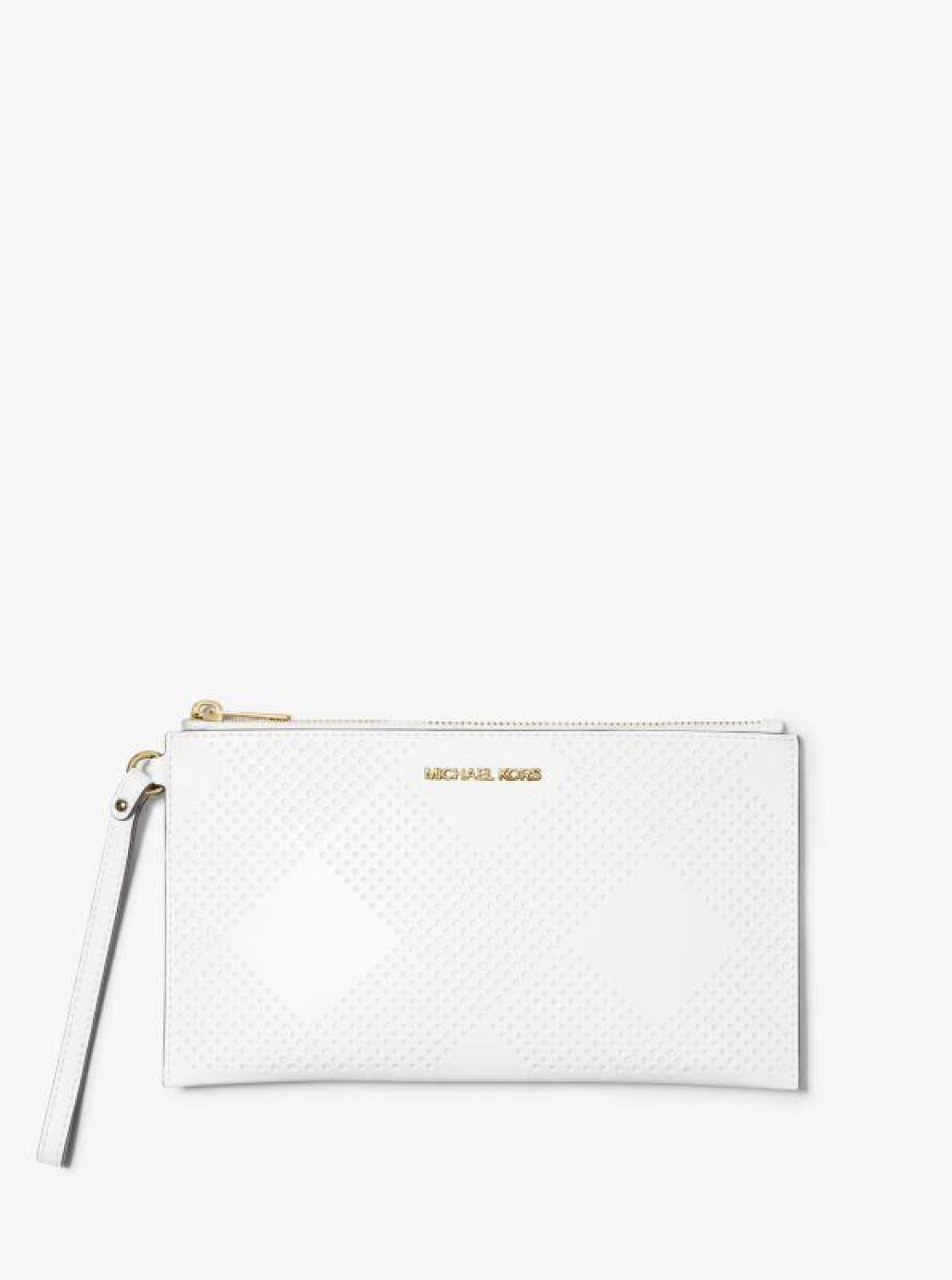 Featuring a perforated geometric design, this wristlet is large enough to accommodate the basics yet small enough to fit into your everyday tote. Its sleek profile makes it easy to dress up or down, and it includes an interior slip pocket that’s perfect for storing your phone. Grab it and go for your next coffee run.