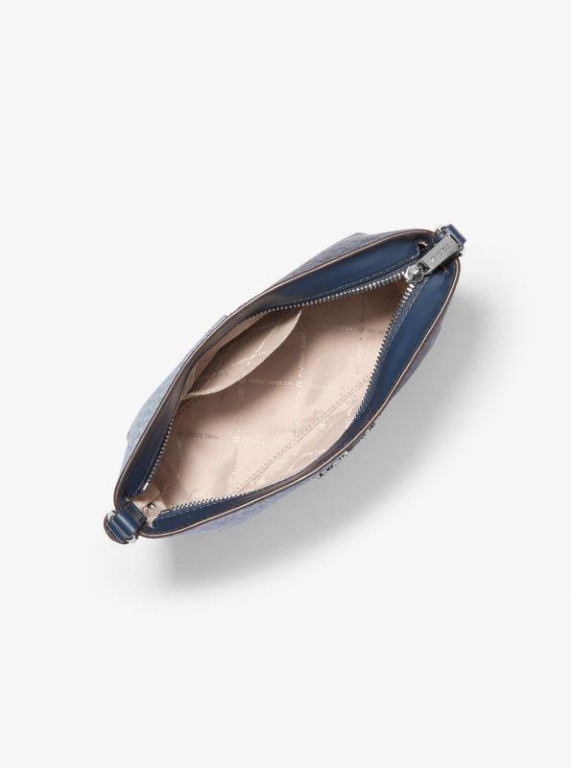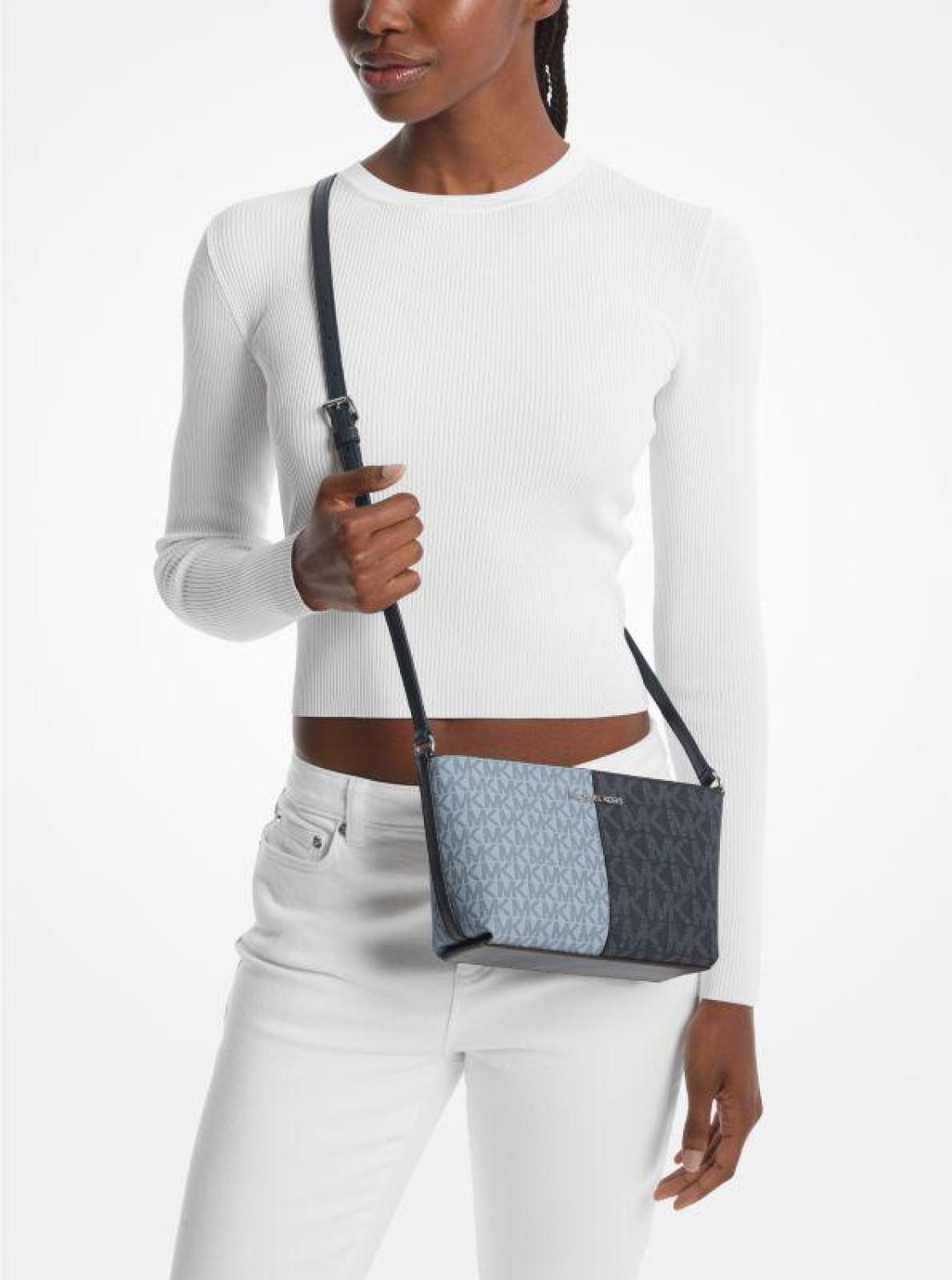 • Go anywhere with this Jet Set top-zip crossbody. Its streamlined shape is crafted from a graphic mix of our Signature logo-print and anchored by an adjustable leather strap. The interior is open and roomy, with a side slip pocket to keep smaller items organized.