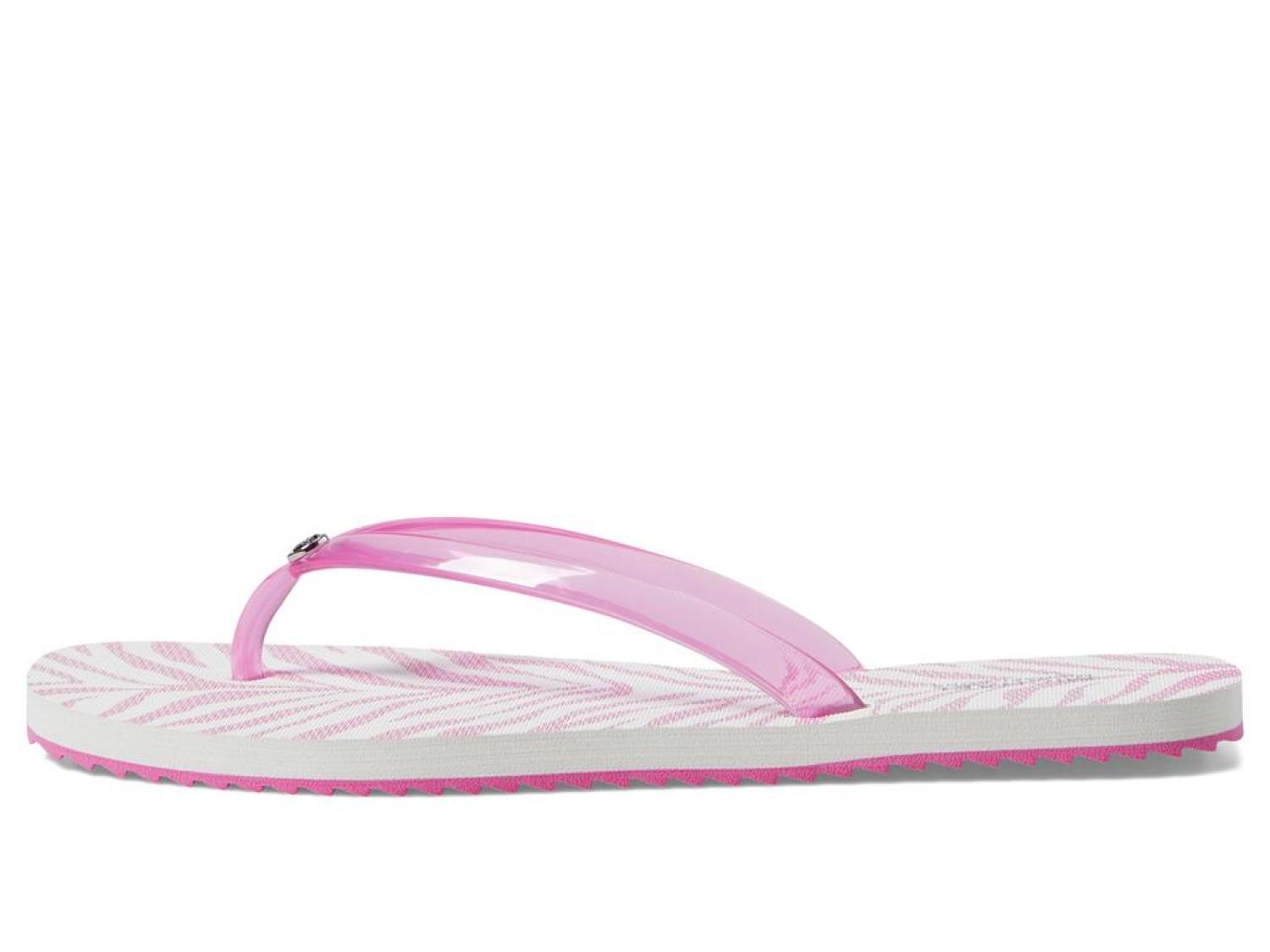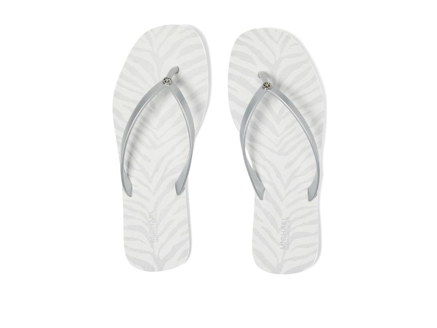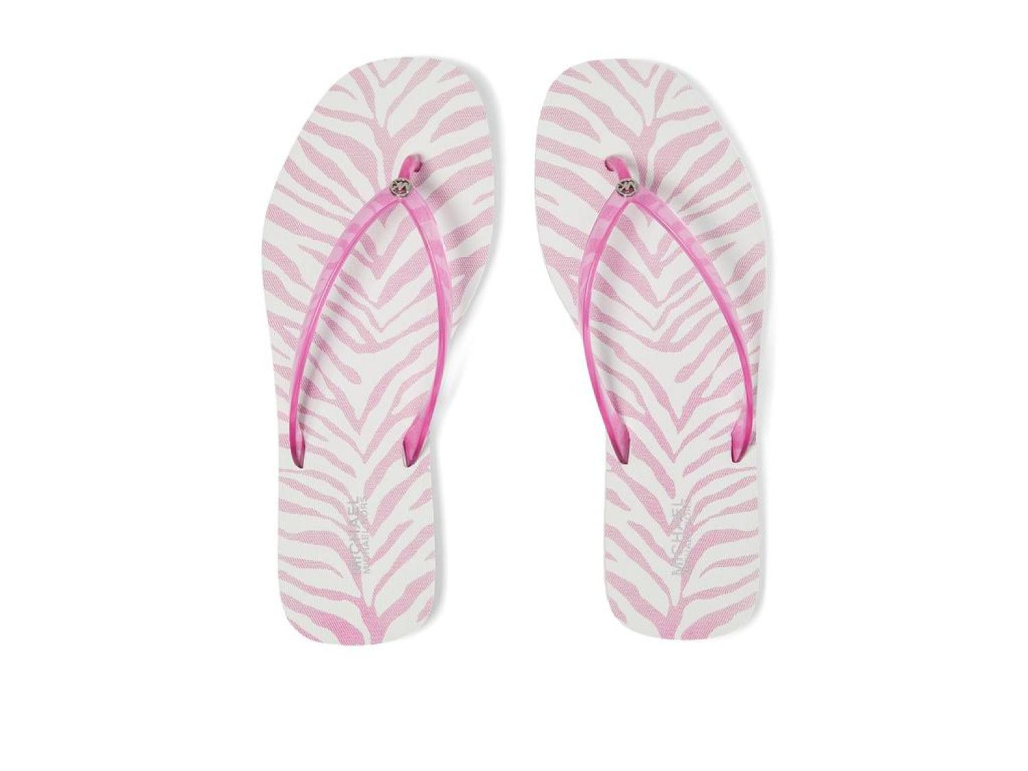 • Let your feet enjoy airy comfort as you wear the lightweight MICHAEL Michael Kors® Jinx Flip Flops. The toe-post thong features PVC upper with unlined construction and zebra-printed cushioned rubber footbed, making poolside walks perfectly comfy.