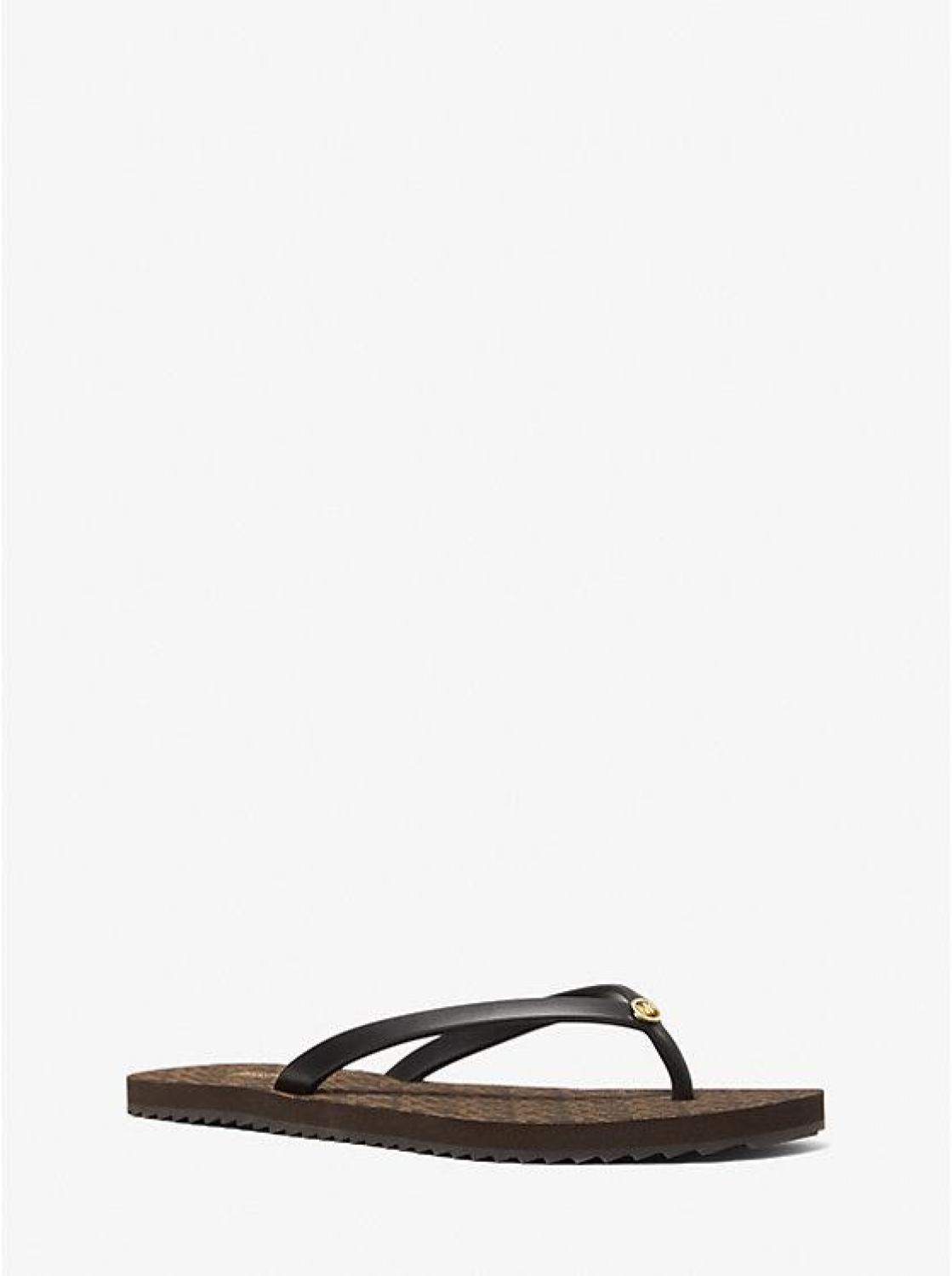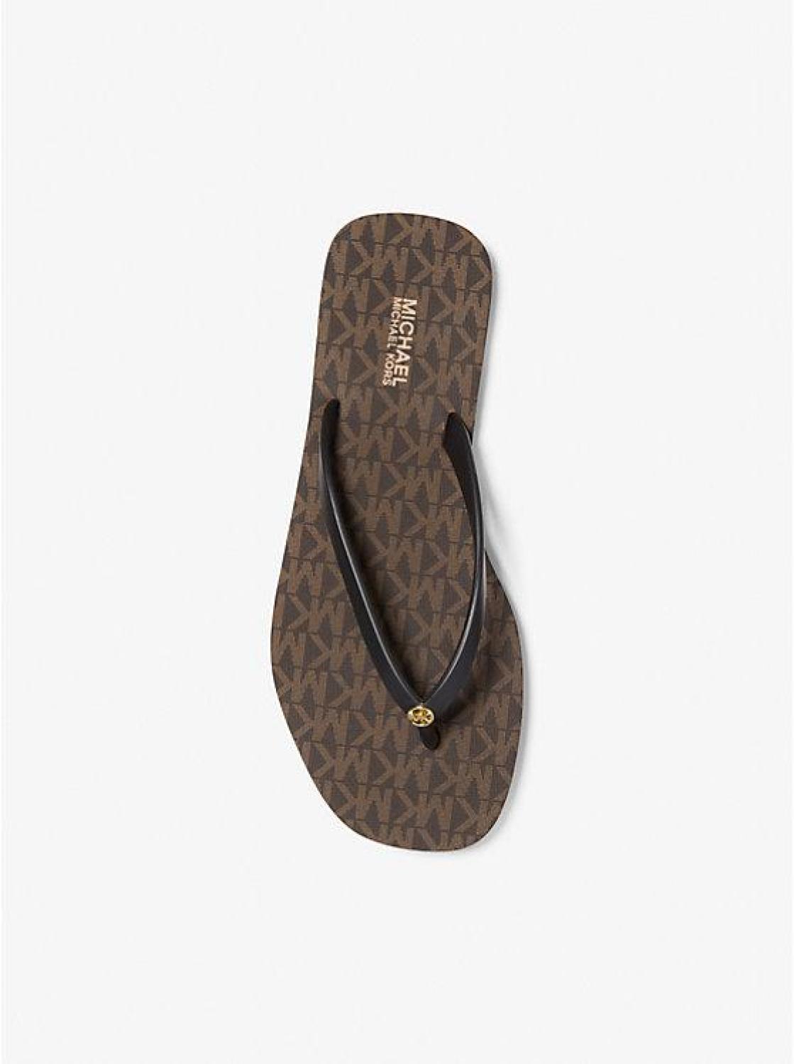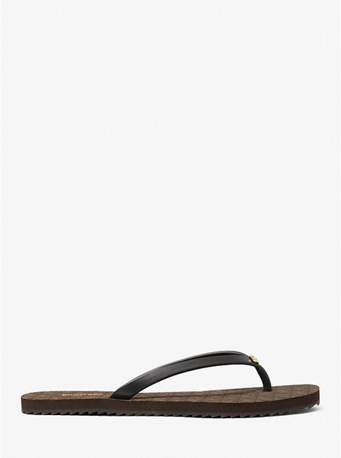 • Elevate your casual footwear with the Jinx flip flop. Set on a Signature-print footbed, this pair features a serrated rubber sole and an of-the-moment square toe. It’s finished with a polished charm for added novelty appeal. Wear yours with swimsuits and cotton dresses alike.