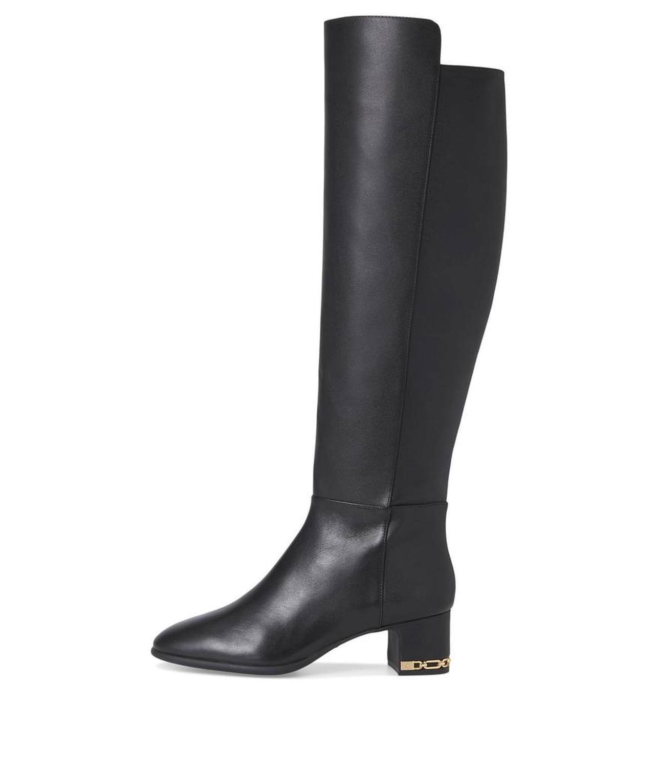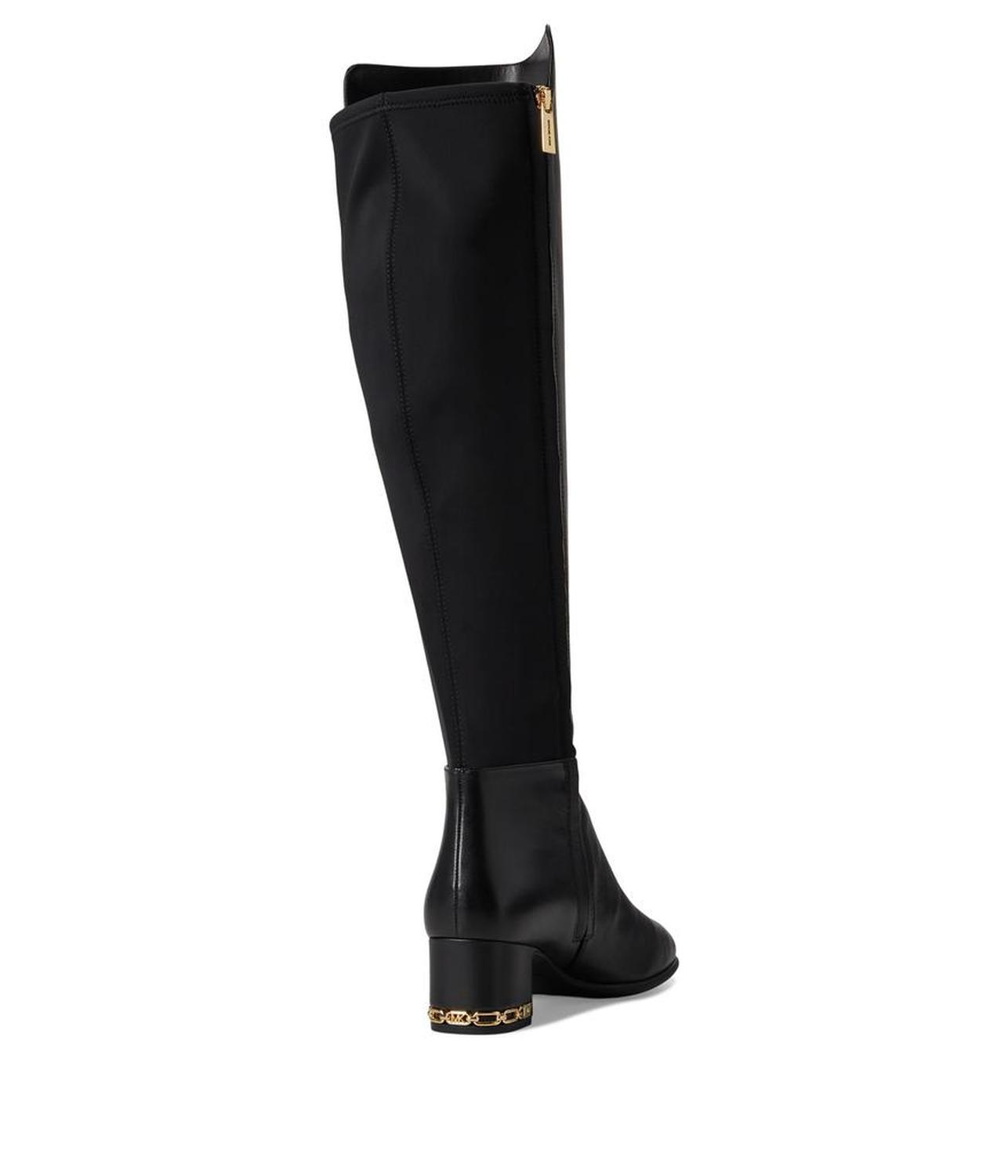 - The MICHAEL Michael Kors® June Flex Boots combine exceptional style and extra padded sock construction for a comfortable feel. The mid heel boot is designed with comfort in mind from flex costruction to extra cushioned synthetic insoles detailed with elevated empire chain hardware on the heel, adding a sophisticated touch. The tall knee-high boots feature a leather upper, polyester lining, a block heel detail, and a zip closure. Almond toe. Rubber outsole. Imported. Product measurements were taken using size 8.5, width M. Please note that measurements may vary by size. Measurements: Heel Height: 1 3/4 in Weight: 1 lb 3 oz Circumference: 15 1/2 in Shaft: 19 1/2 in