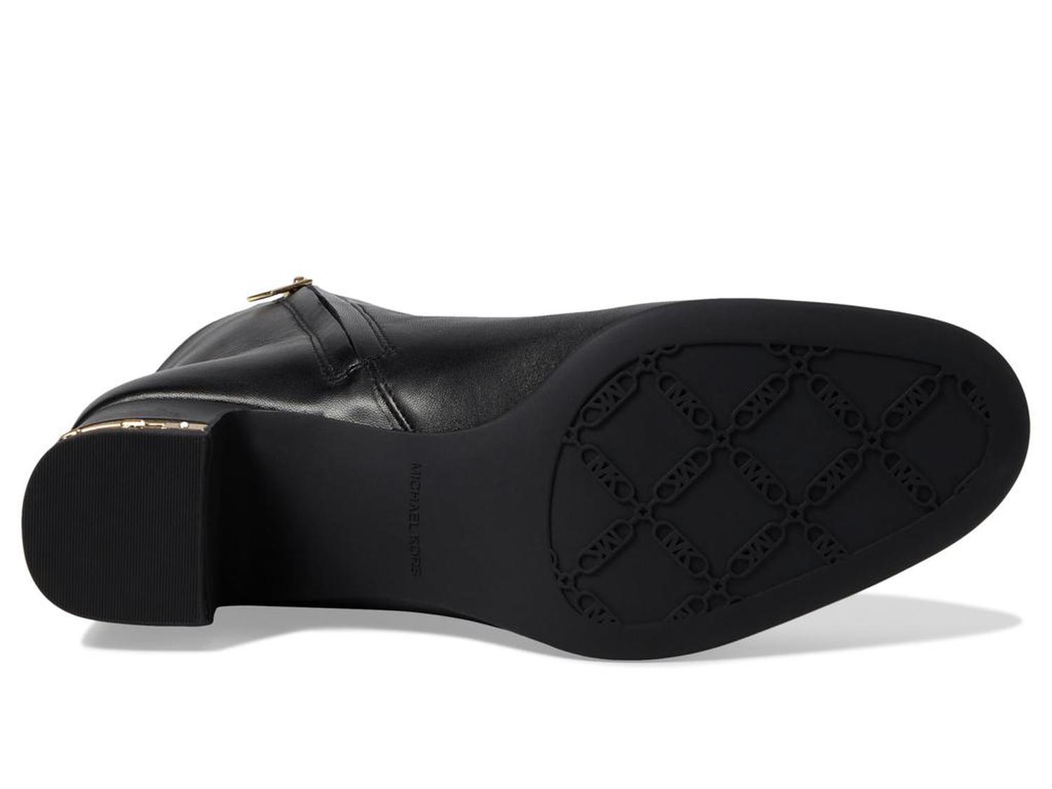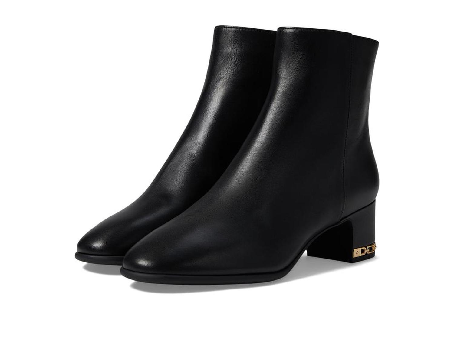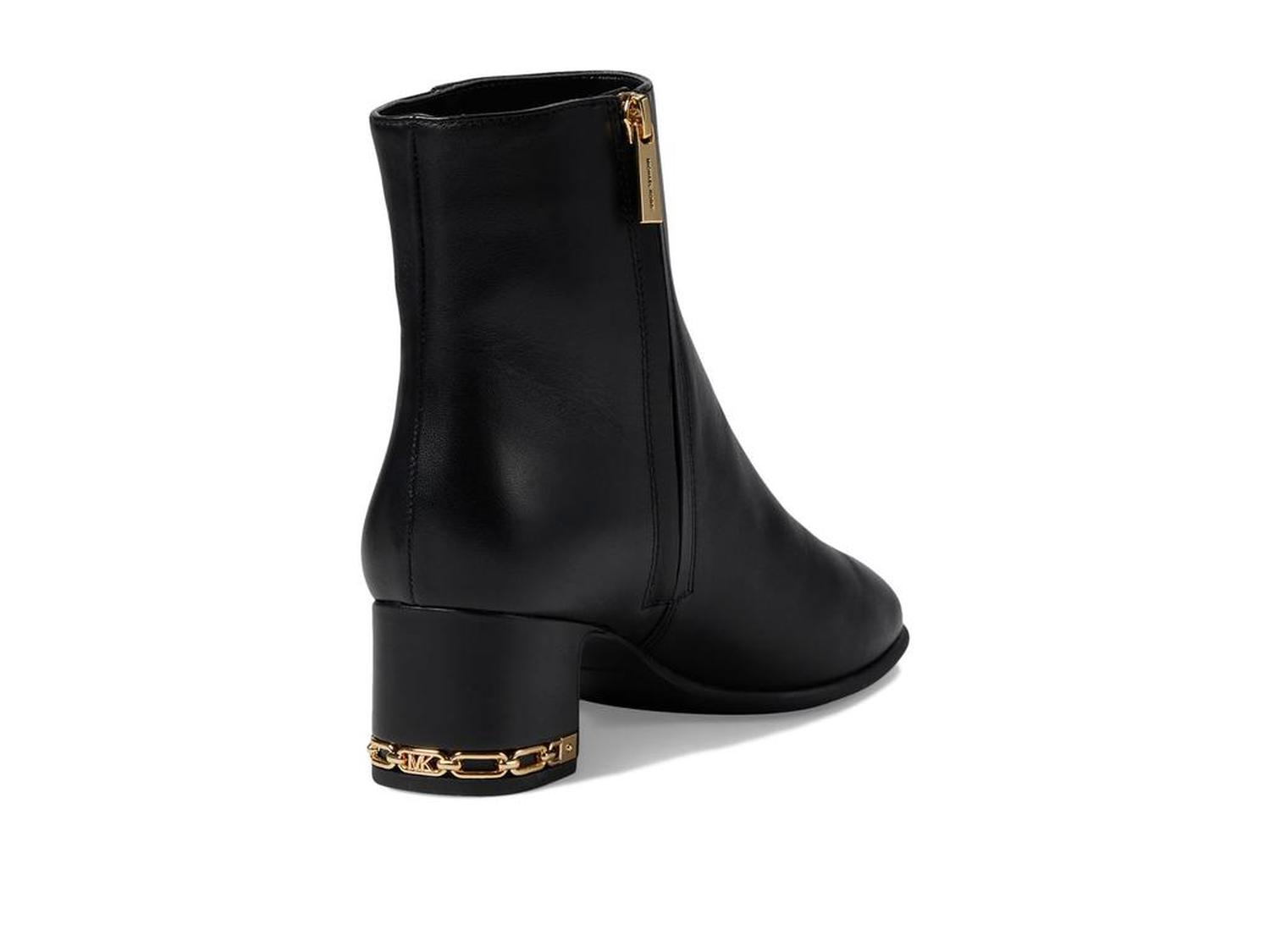 Make a statement wearing the MICHAEL Michael Kors® June Flex Mid Booties. The mid-heel booties are designed with comfort in mind from flex construction to extra cushioned insoles detailed with elevated empire chain hardware on the heel, adding a sophisticated touch. The ankle-high shoes feature sleek leather upper, polyester lining, extra padded sock, and synthetic insole.