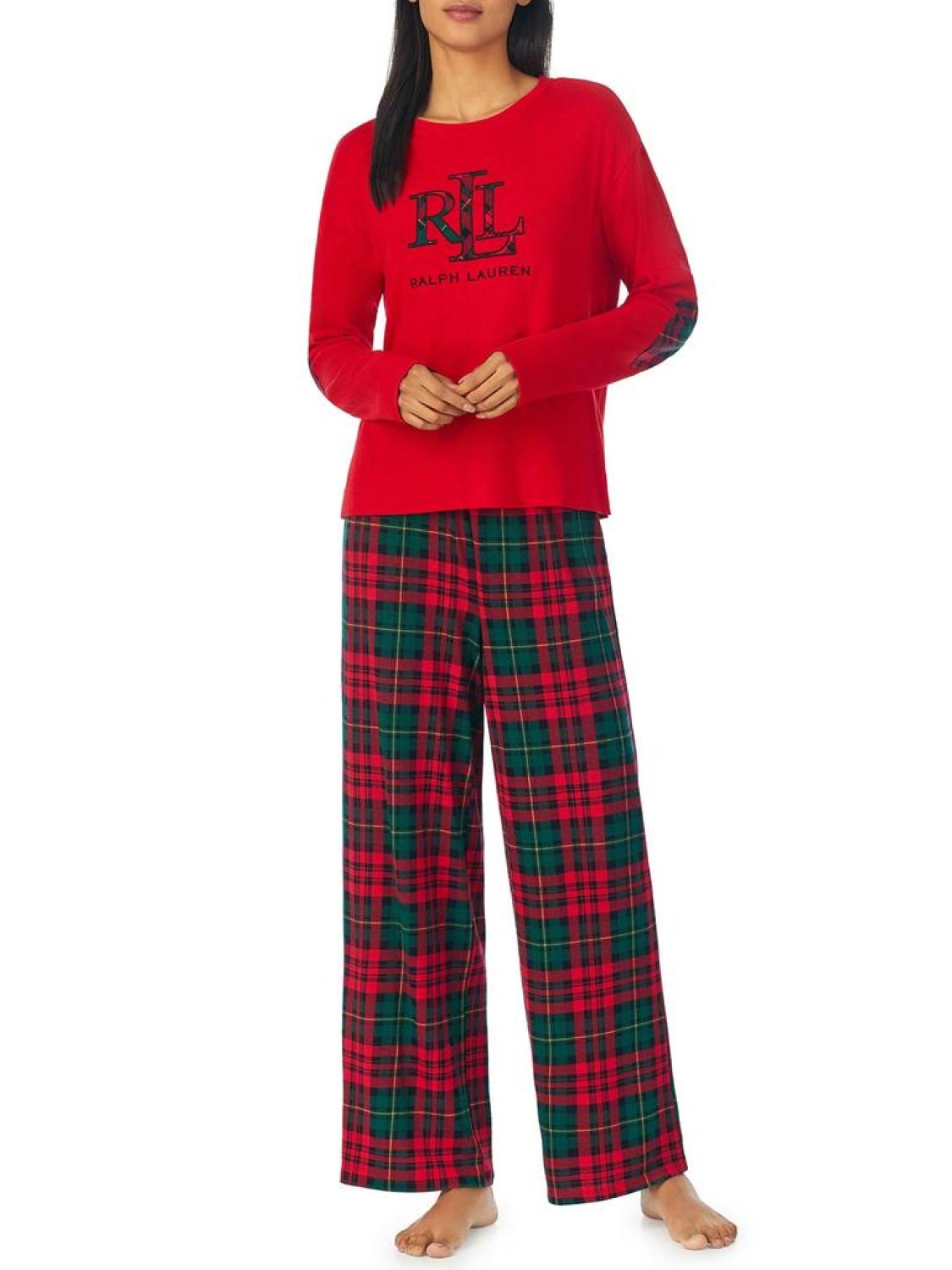 What makes the perfect sleepwear? Sleepwear that defines effortless style with modern necessities, feminine classics, and a love of comfort and quality. Get into Lauren Ralph Lauren Sleepwear.• Lounge comfortably in this long sleeve pajama set• Cozy crew neck shirt with large embroidered logo• Long sleeves with plaid elbow patches• Elastic drawstring waistband on plaid pants; no pockets• 29.5'' inseam; measurement taken from size S
