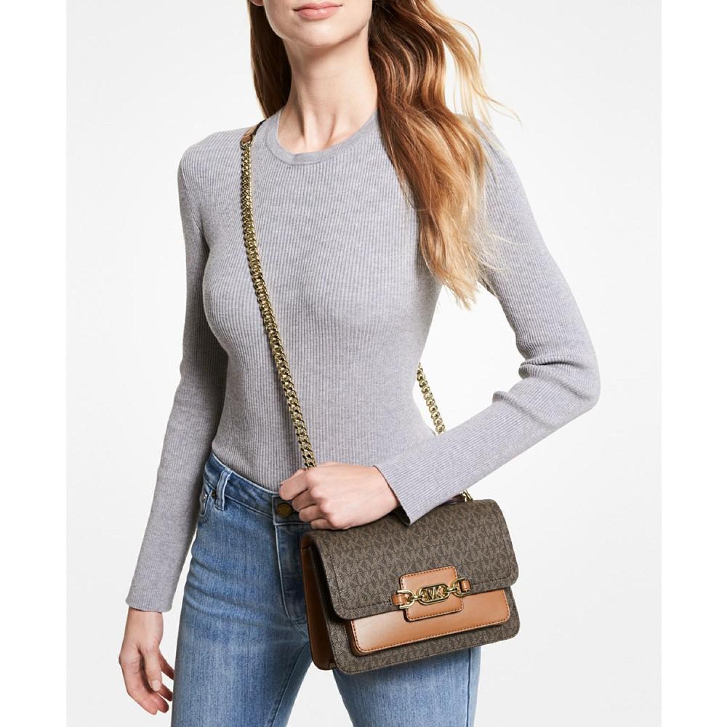 • Timeless and elegant, you'll love the monogram print and gold-tone chain detail of the Heather Large Shoulder Bag by Michael Kors.