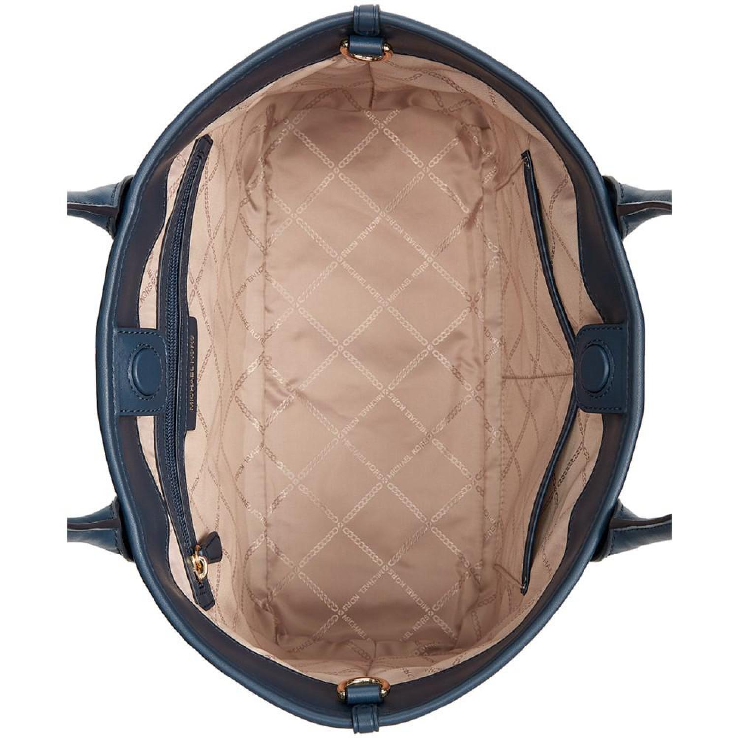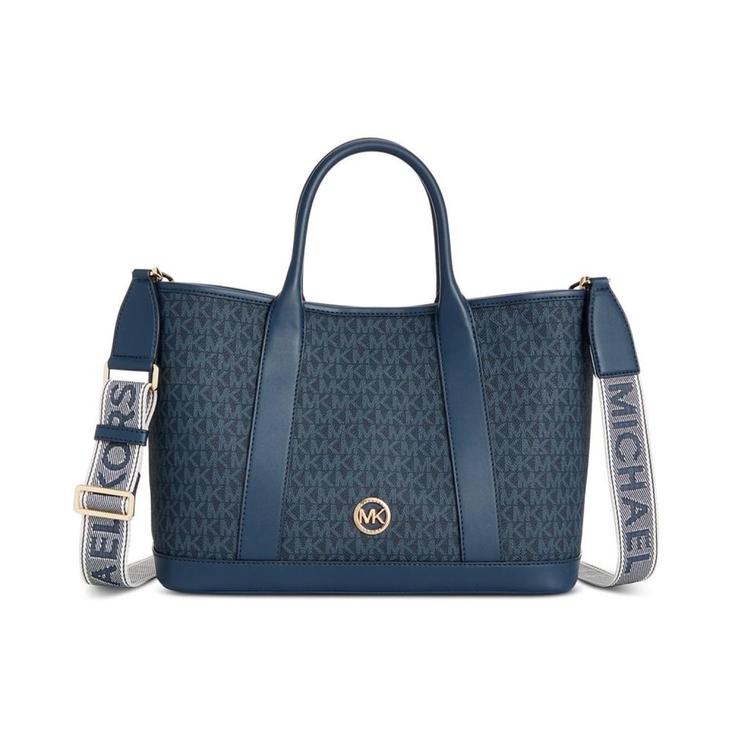 Classic monogram and a removable webbing strap give this satchel by MICHAEL Michael Kors a perfect everyday sophistication. Medium sized bag; 14-1/2"W x 9-1/4"H x 5-1/2"D (width is measured across the bottom of handbag); 1.63 lbs. approx. weight Silhouette is based off 5'9" model 4-1/2"L top handles; 25"L removable strap Magnetic closure Gold-tone exterior hardware Interior zip & slip pockets PVC, polyester, polyurethane; trim: polyurethane, cotton, polyester, nylon; lining: polyester Spot clean Imported
